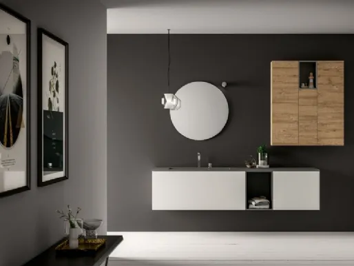 Sink and bathtub in ecomalta, natural wood and textured lacquered finish.