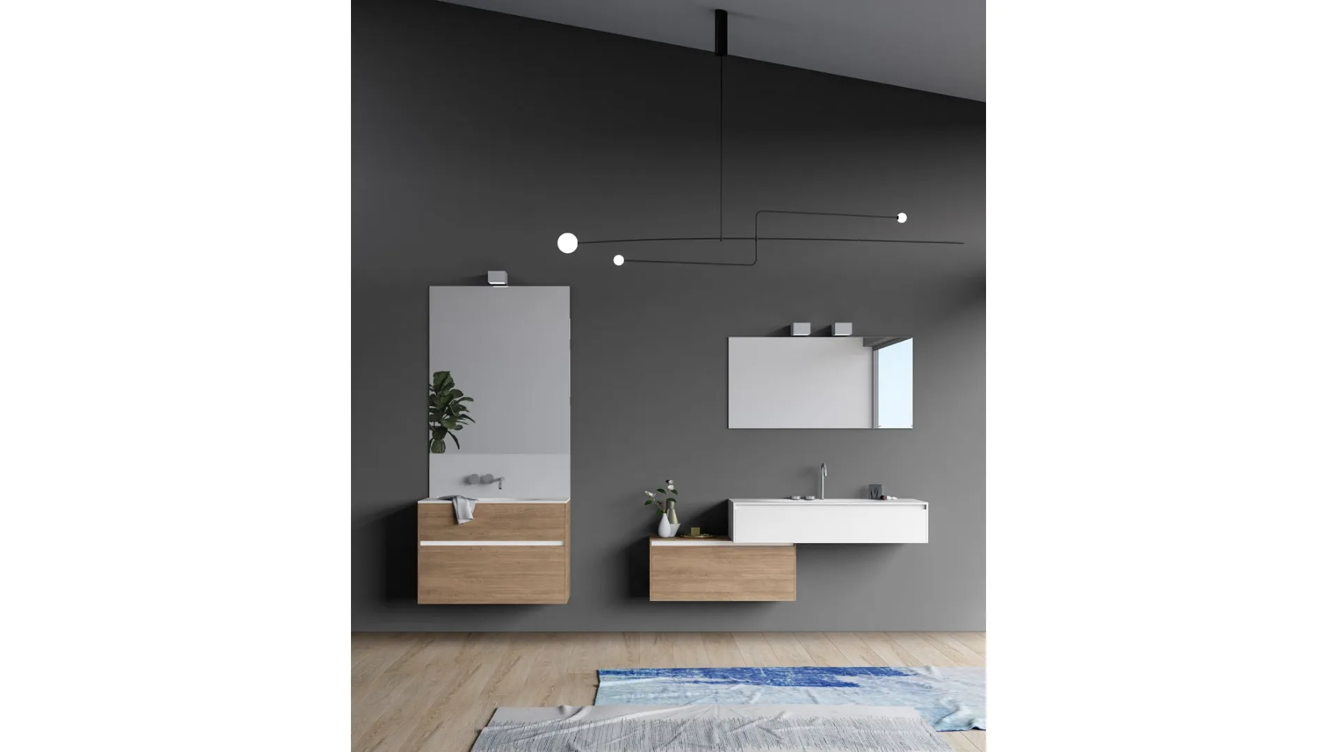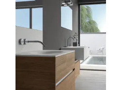 Realization designed to bring a touch of personalityà to the bathroom area, with a double composition in which the bathtub and tap have different styles, as well as the dimensions of the mirrors.  The furniture is in HPL, very resistant and easy to clean, with HANEX® tops ; and flat throat opening.