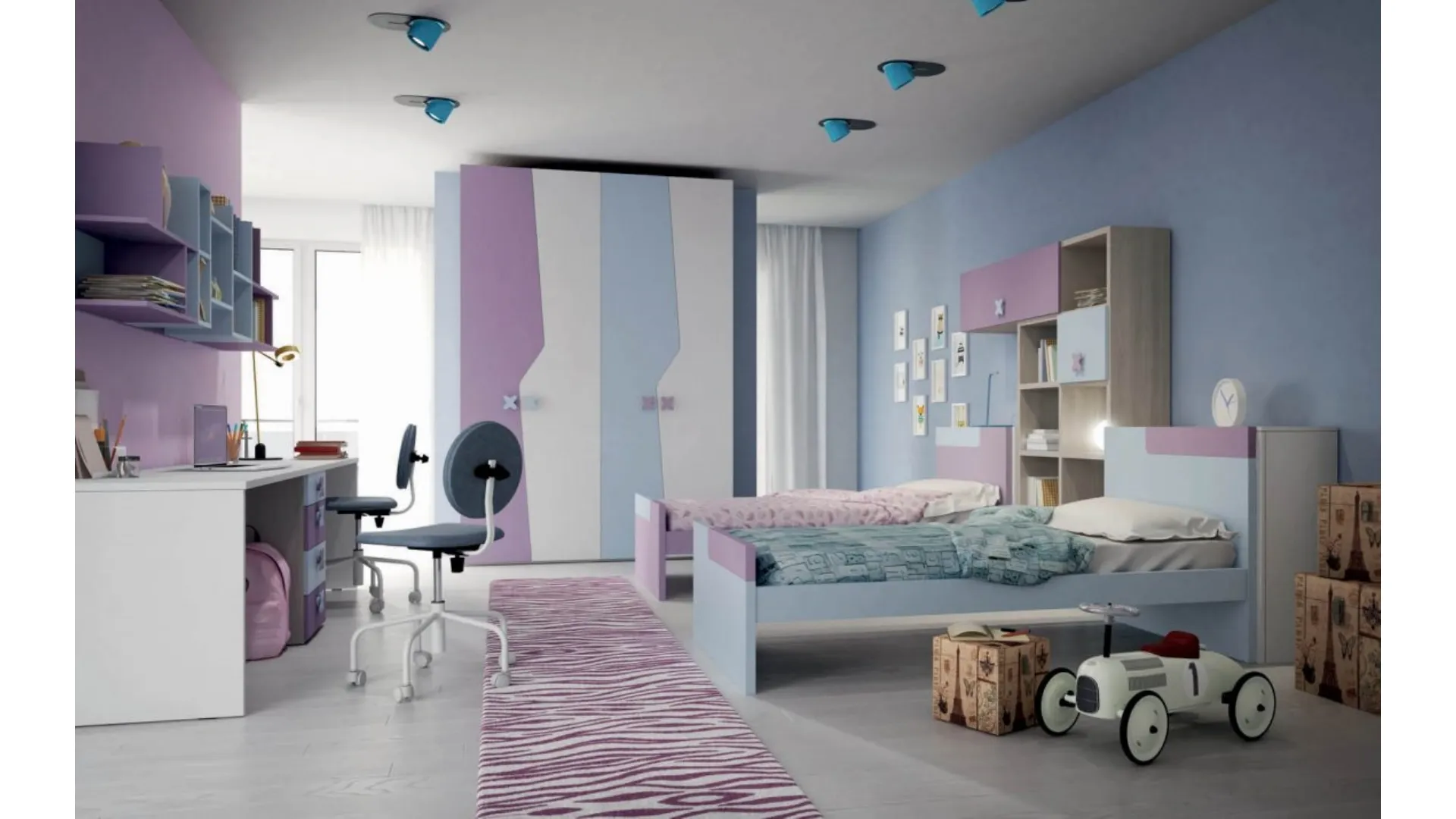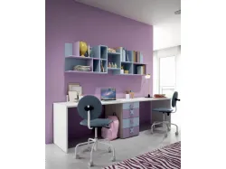 Kids bedroom made in large space, with generously sized desk with chest of drawers and suspended shelves. Double single bed on the ground with bookcase made up of open compartments and drawers. L& # 39; wardrobe has large, 4 hinged doors with X-handles. L& # 39; whole realization è made with contrasting finishes between snow white and lavender / Glicine.