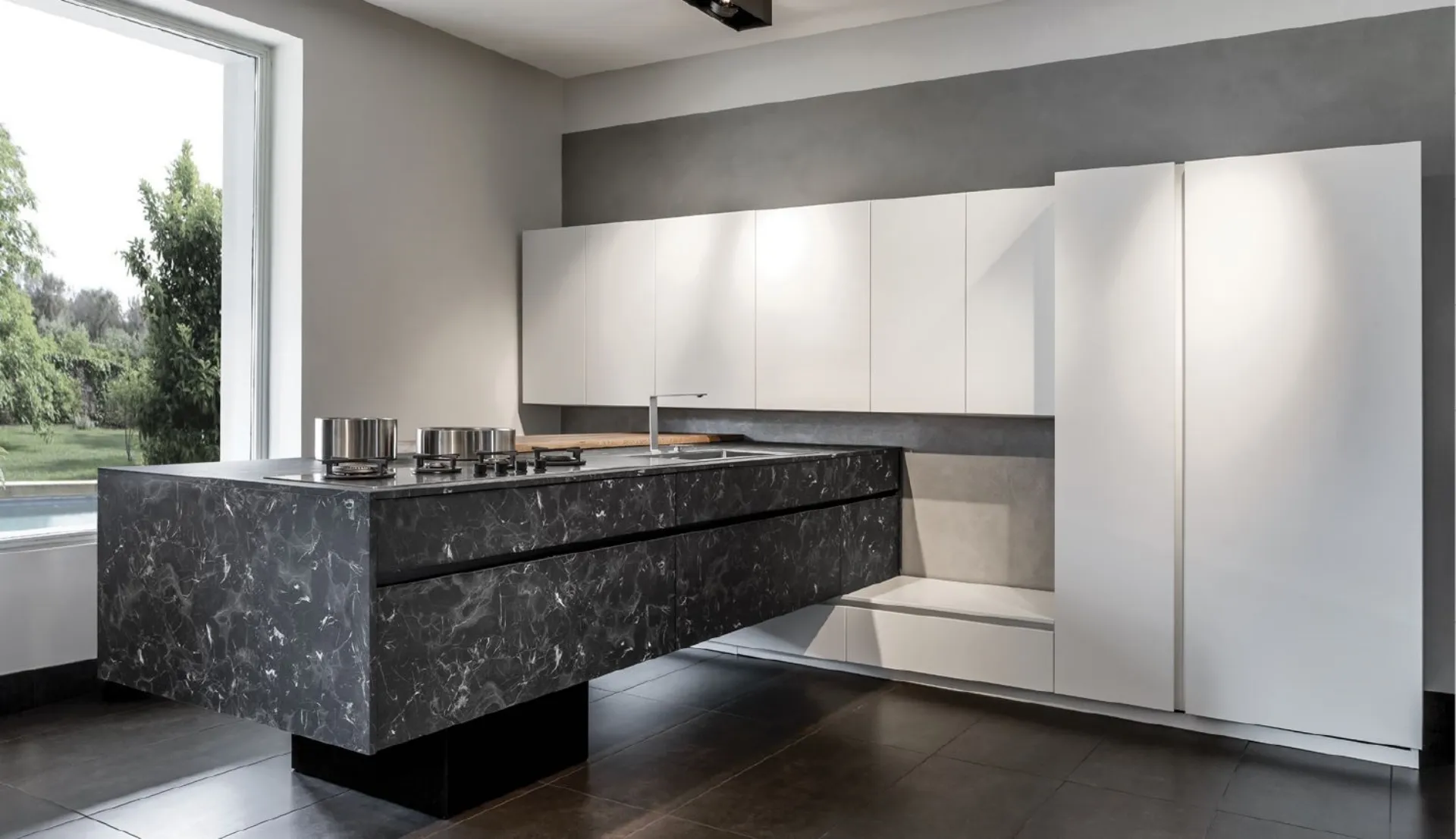 Realization composed of a large central island suspended on a bridge, a comfortable hob with burners in line and a 4mm thick steel sink. The 75 cm è column; designed for high-capacity 26-agrave refrigerators; The è style; based on practicalityà and ergonomicsà ;, with a search for elegance in materials and shapes.