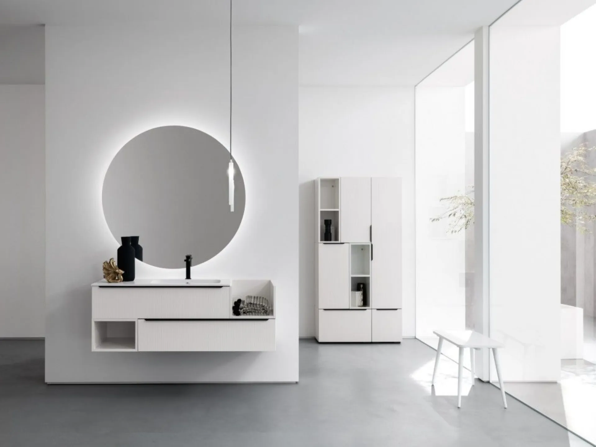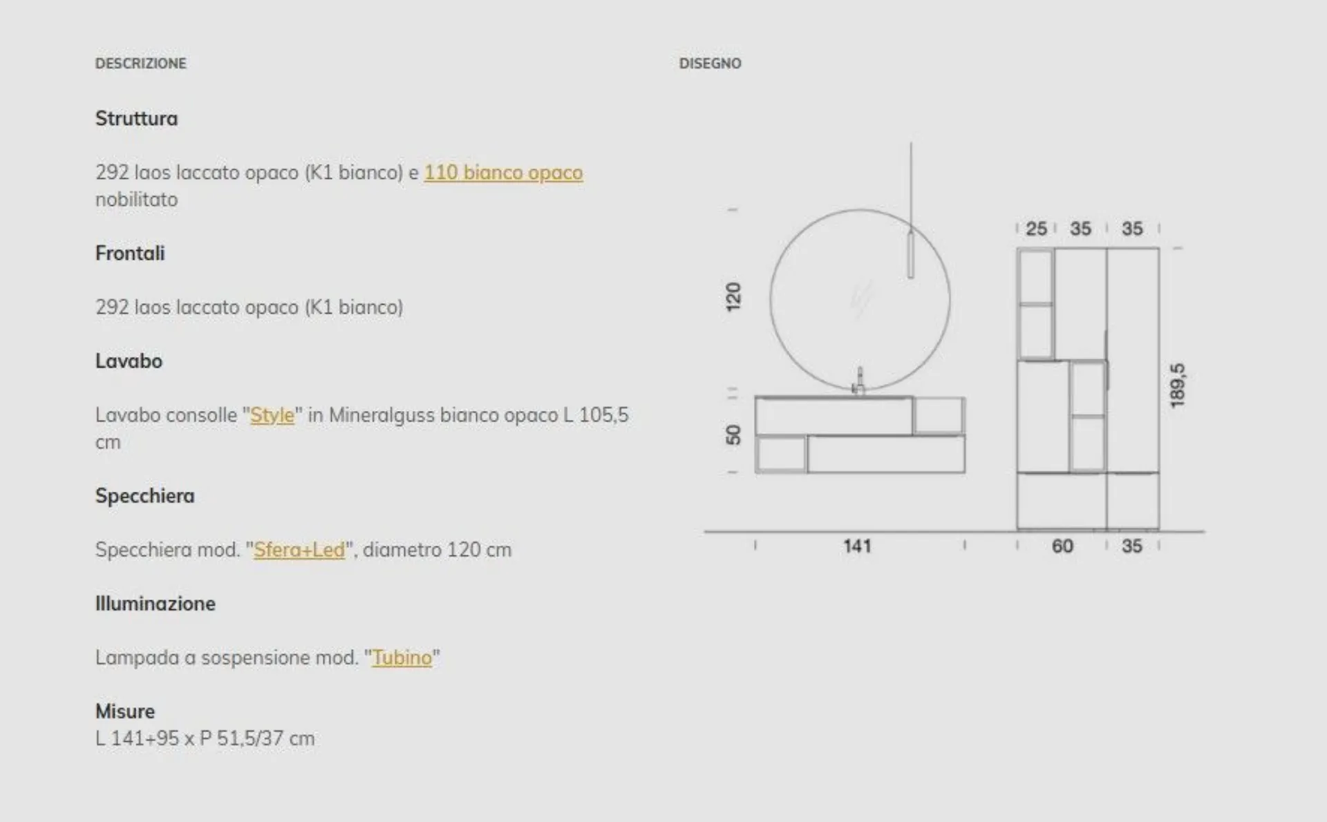 Bathroom model B201 composition 29 with front panels in matte lacquer and matte white Mineralguss top with integrated bathtub. Composition 141, ground columns 95. Possibility to personalize it with measurements and finishes also in laminate.