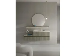 Bathroom model BIK composition 01 with laminate fronts and matte white Corian top with integrated bathtub. Composition width 146. Possibility to personalize it with measurements and finishes also in lacquered or oak veneer.