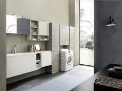 Composition for modern laundry with bases and wall units in matt light gray lacquer, open wall units in Primofiore 3D Dekorativo hemp leather effect, mirror door wall unit in matt light gray lacquer, columns in Dekorativo 3D oak slatted gray. Top one in glossy white geacril with integrated sink. The composition measures a total of 345cm in length, 195cm in height and 26-agrave depth; which varies from 37 to 50.5cm. The è complex; available at € 3,900.00 with finishes of your choice. Delivery varies from 30 to 35 days.