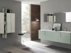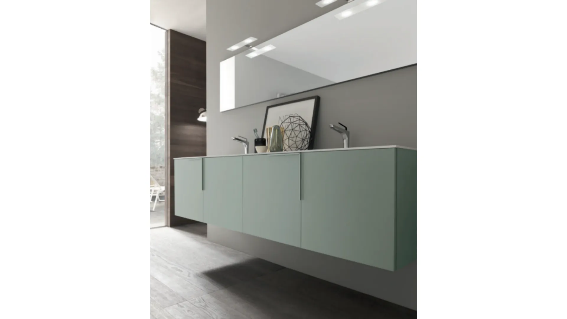 Bathroom cabinet with suspended elements, with matt powder green lacquered bases, integrated Line lacquered handle in the same color, matt white ocritech top with integrated double basin. rectangular mirror 200x50cm. The composition measures 200cm in length, 195cm in height and 50.5cm in depth. The è complex; available at € 2,310.00, with a choice of finishes. delivery varies from 30 to 35 days.