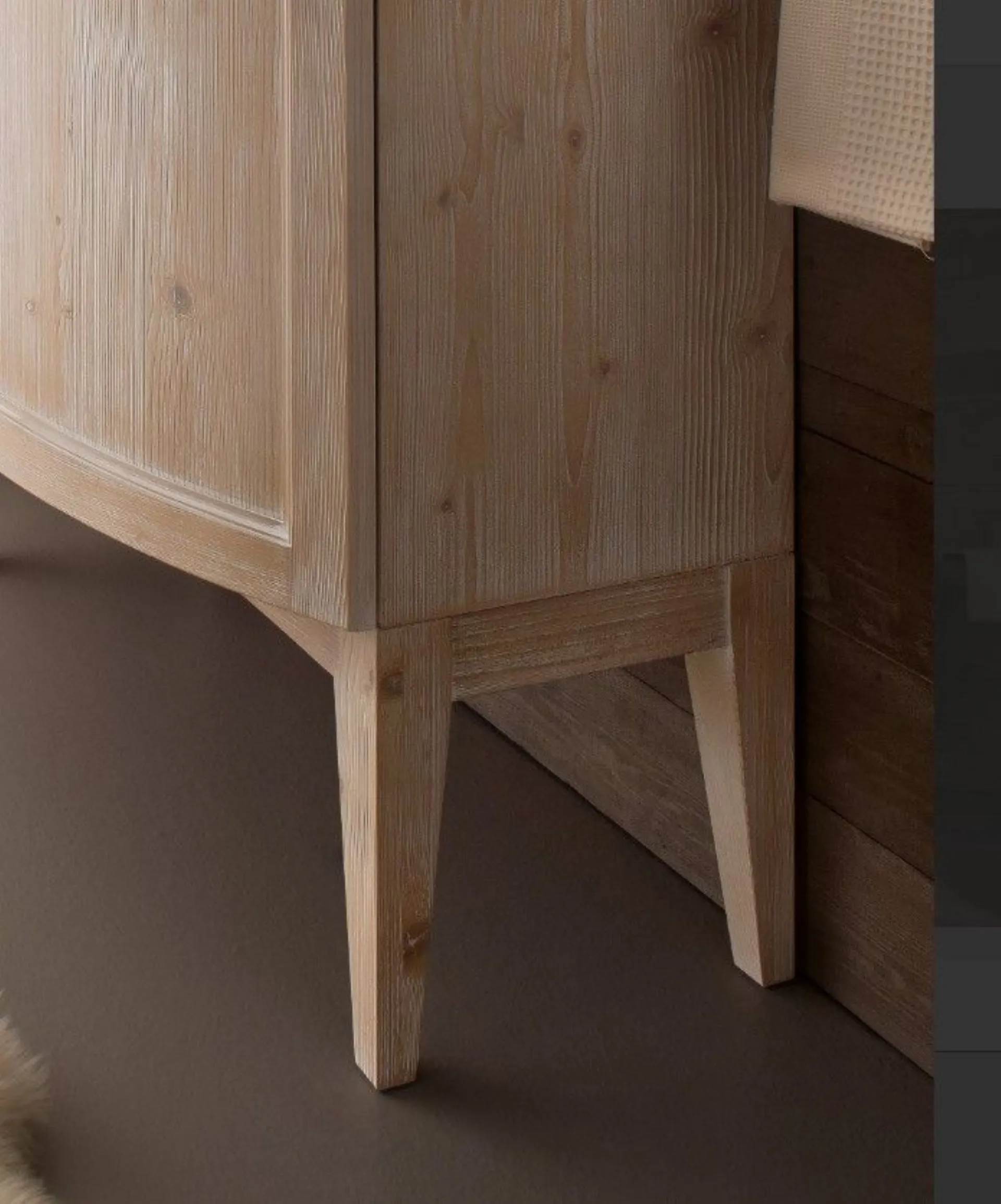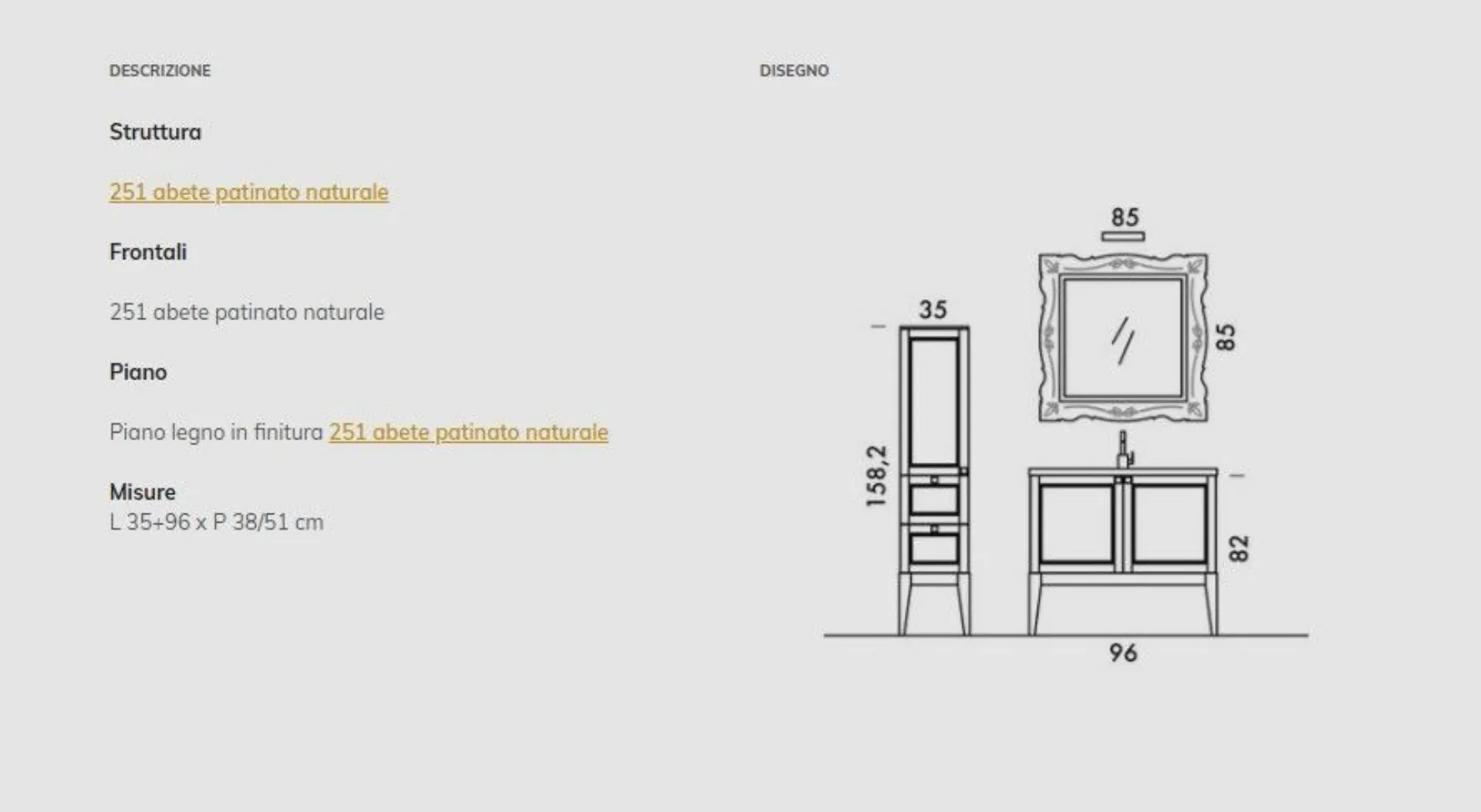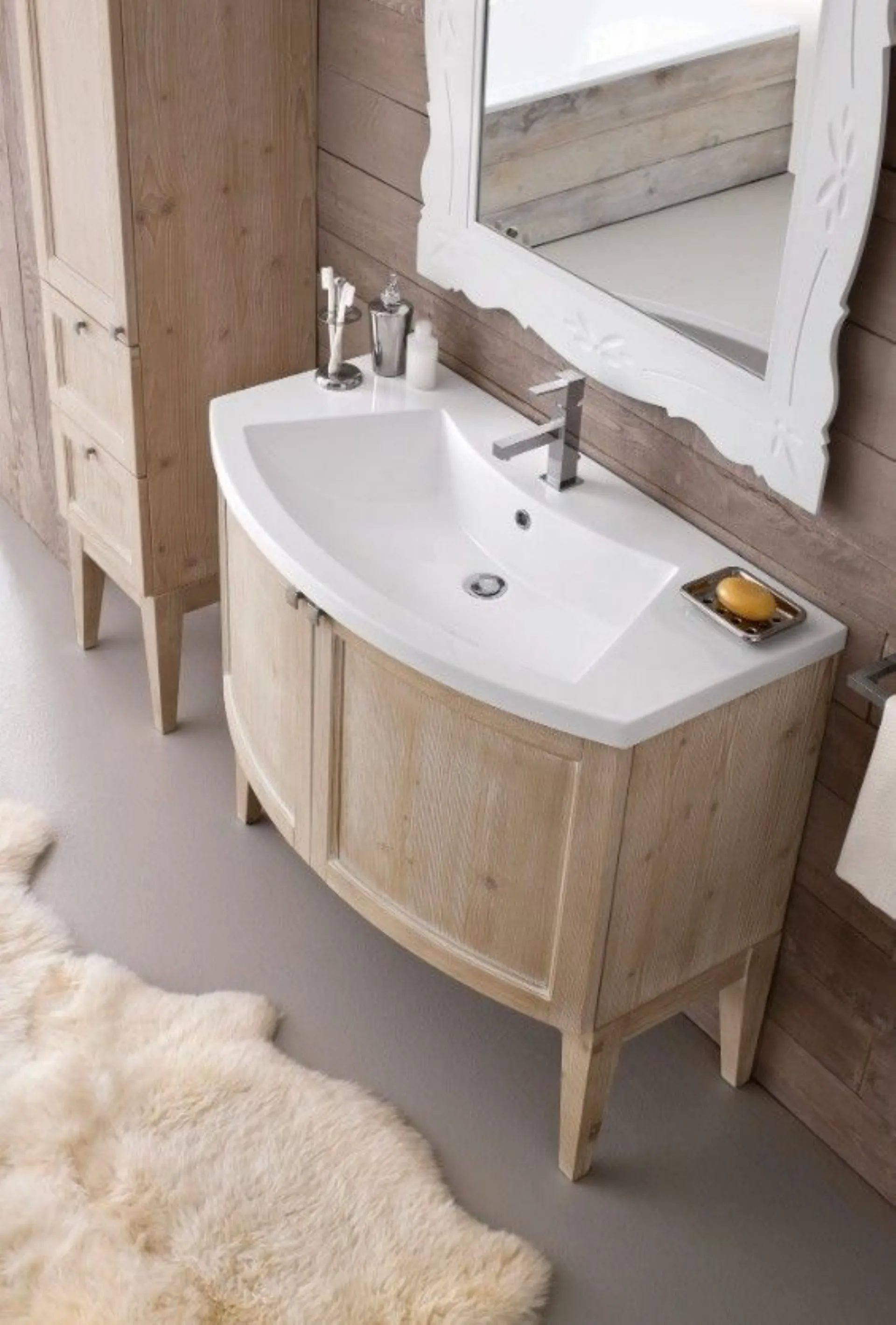 Bathroom model DIAMOND composition 06 with front panels in lacquered Fir wood, Washbasin in Mineral casting. Composition width 96 and column width 35. Possibility to customize it with various sizes and colors.