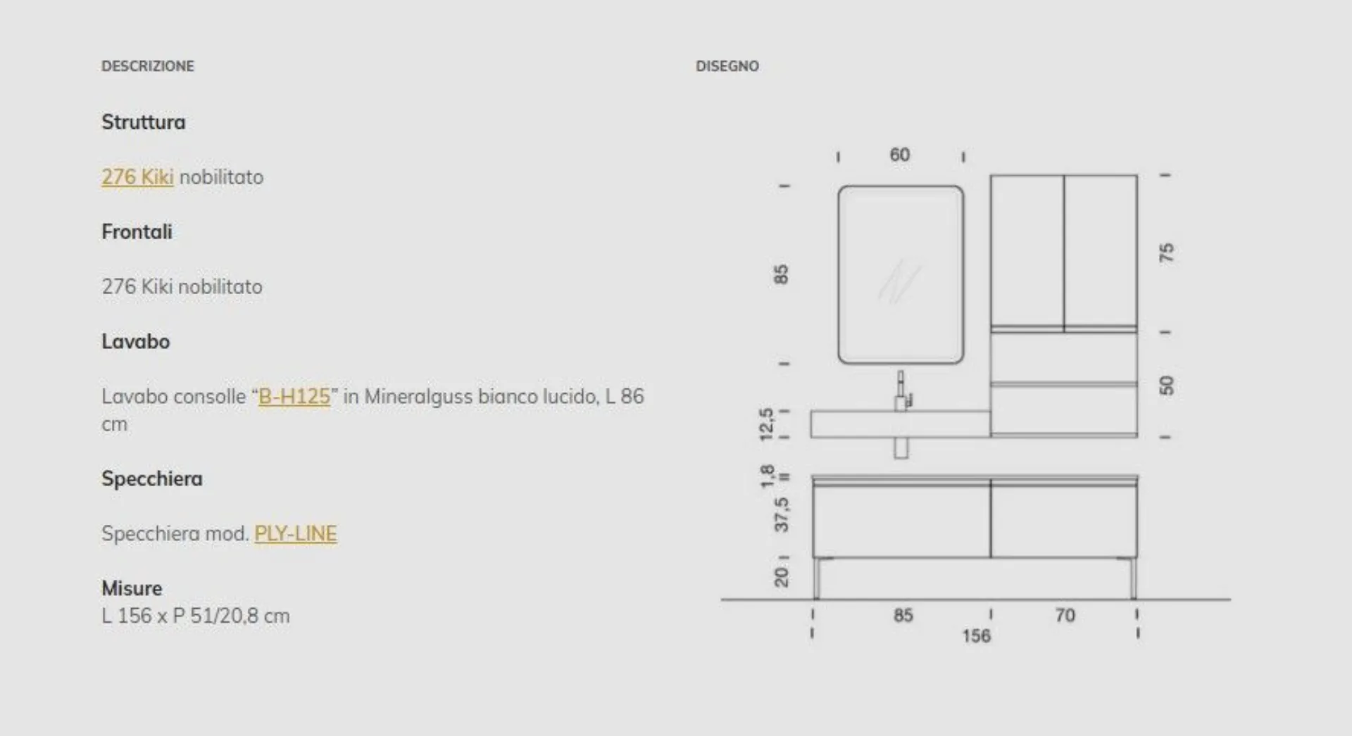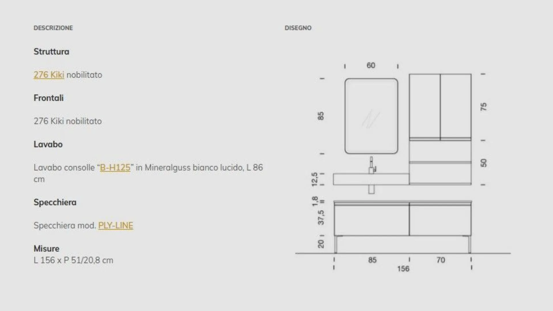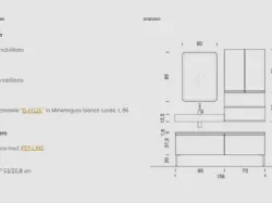 Bathroom model IPE composition 15 with laminate fronts. Console sink in glossy white mineralguess. Composition width 156. Possibility to customize it with measurements and finishes also in lacquered or Oak wood.