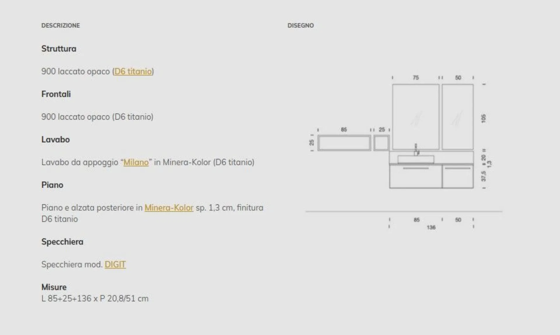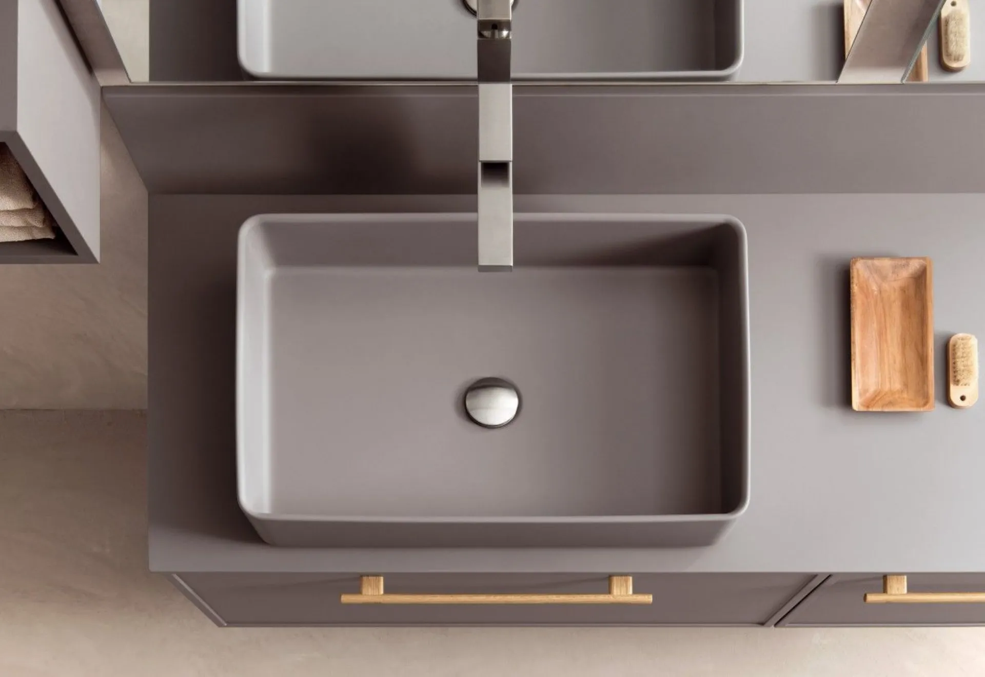 Bathroom model PICTA composition 01 with front panels in Matte Lacquer, top and sink in Minera-Kolor. Composition width 136 for base and width 110 for open compartments. It can be customized with various sizes.