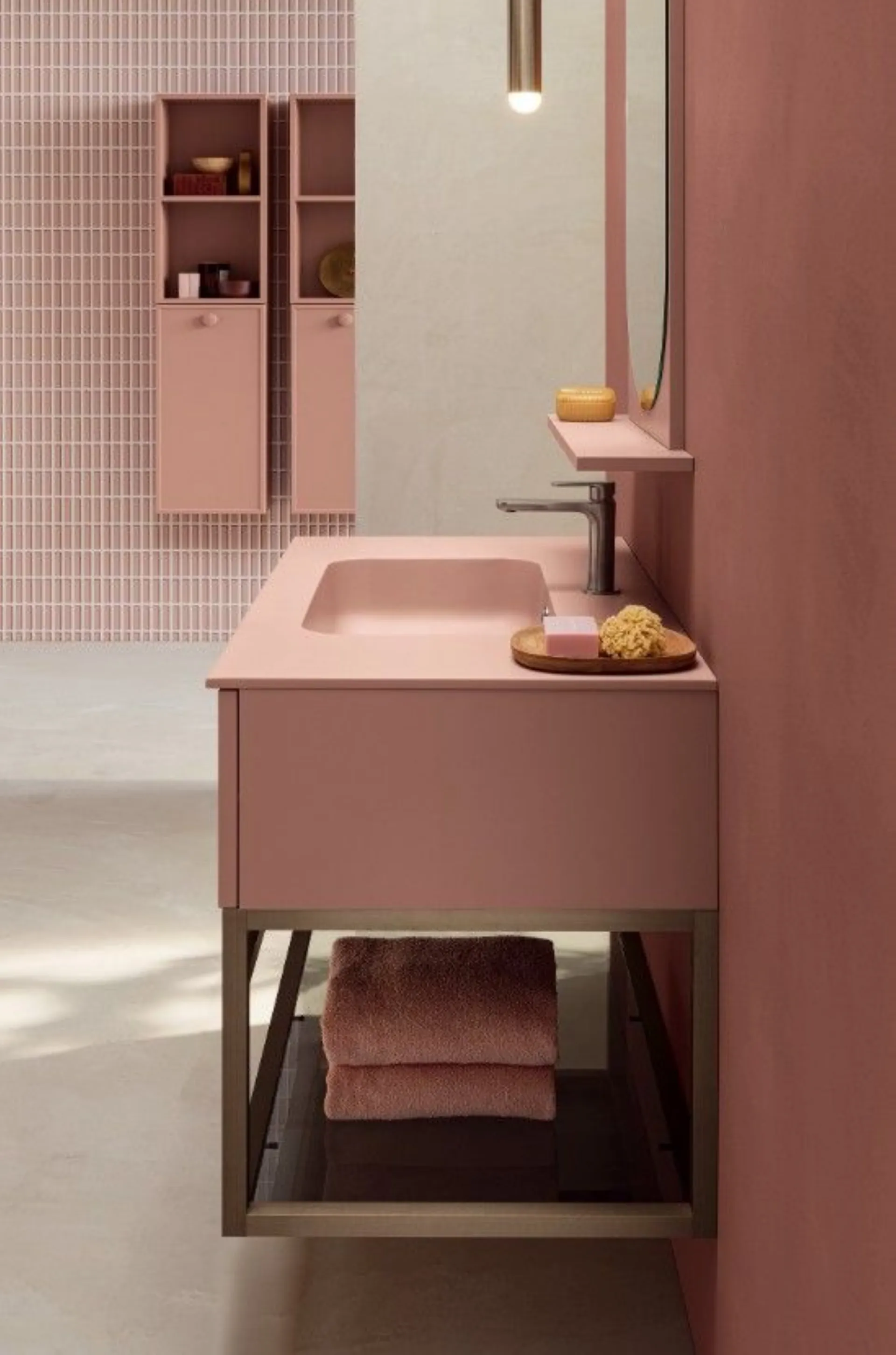Bathroom model PICTA composition 11 with front panels in Matte Lacquered, top and integrated sink in Minera-Kolor. Composition width 95.5cm, wall units width 35cm each. It can be personalized with various sizes and colors.