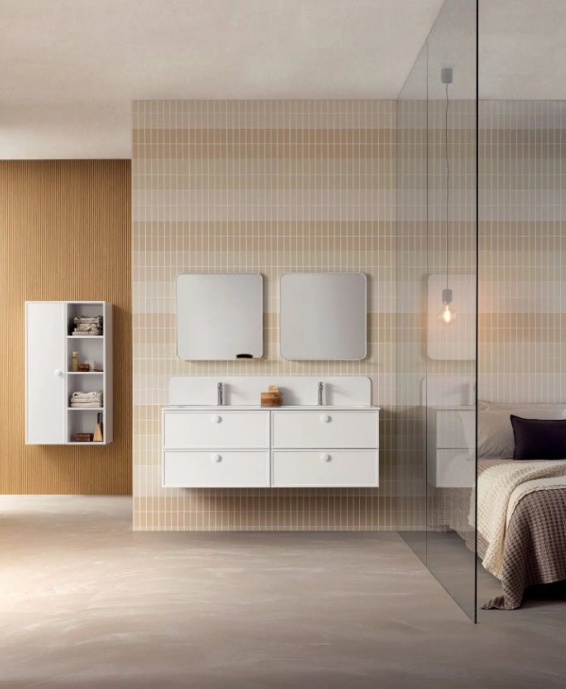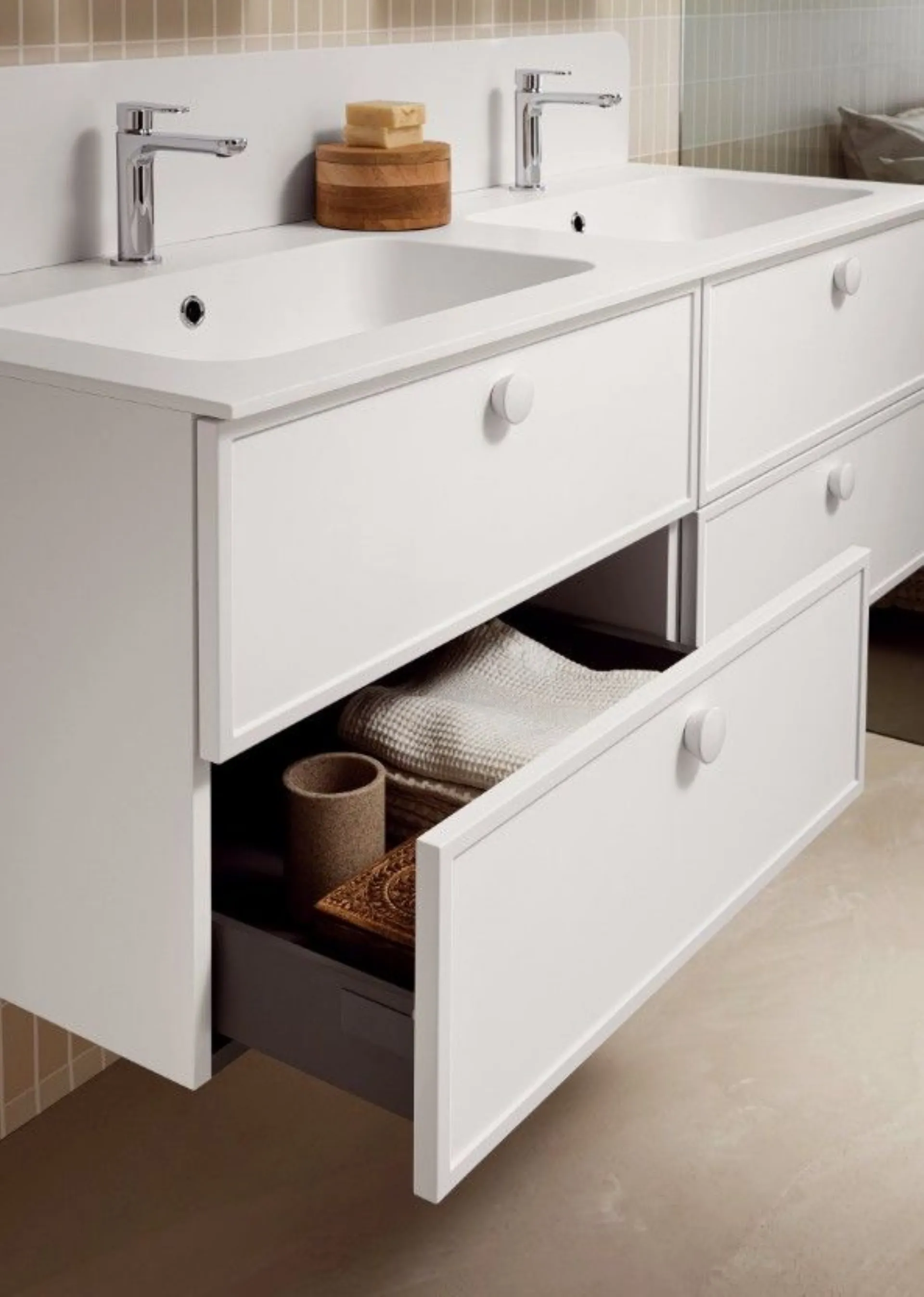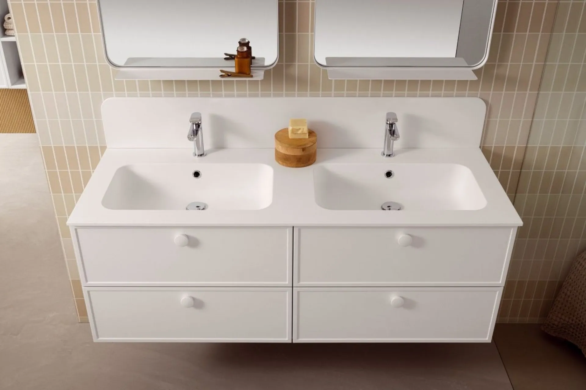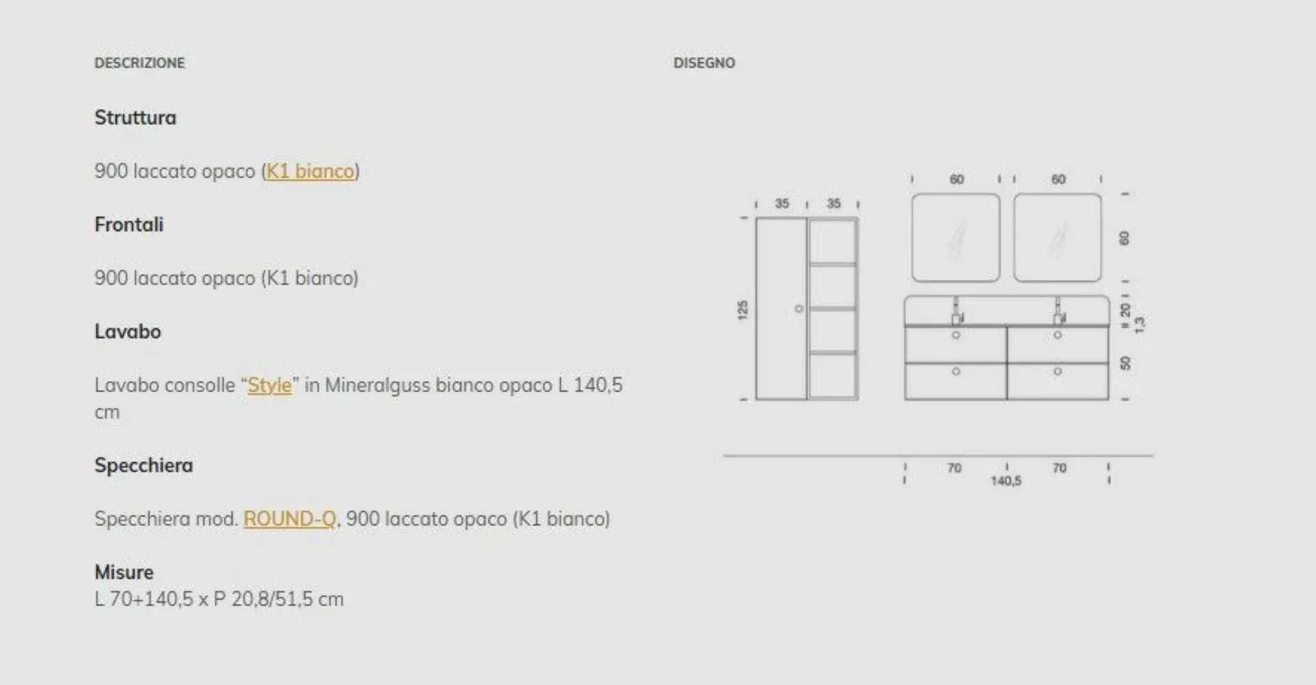 Bathroom model PICTA composition 02 with front panels in Matte Lacquer, matte White Mineralguss top with 2 integrated sinks. Composition width 1140.5 for the base and width 70 for the wall unit. It can be personalized with various sizes and colors.
