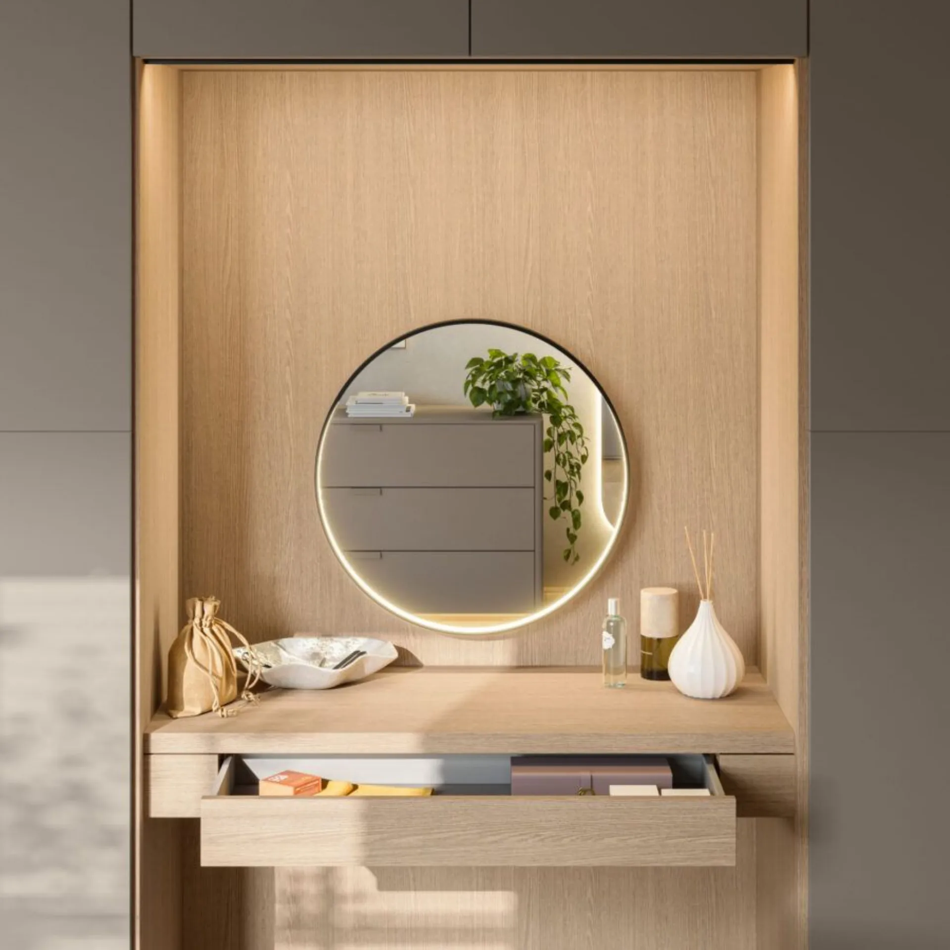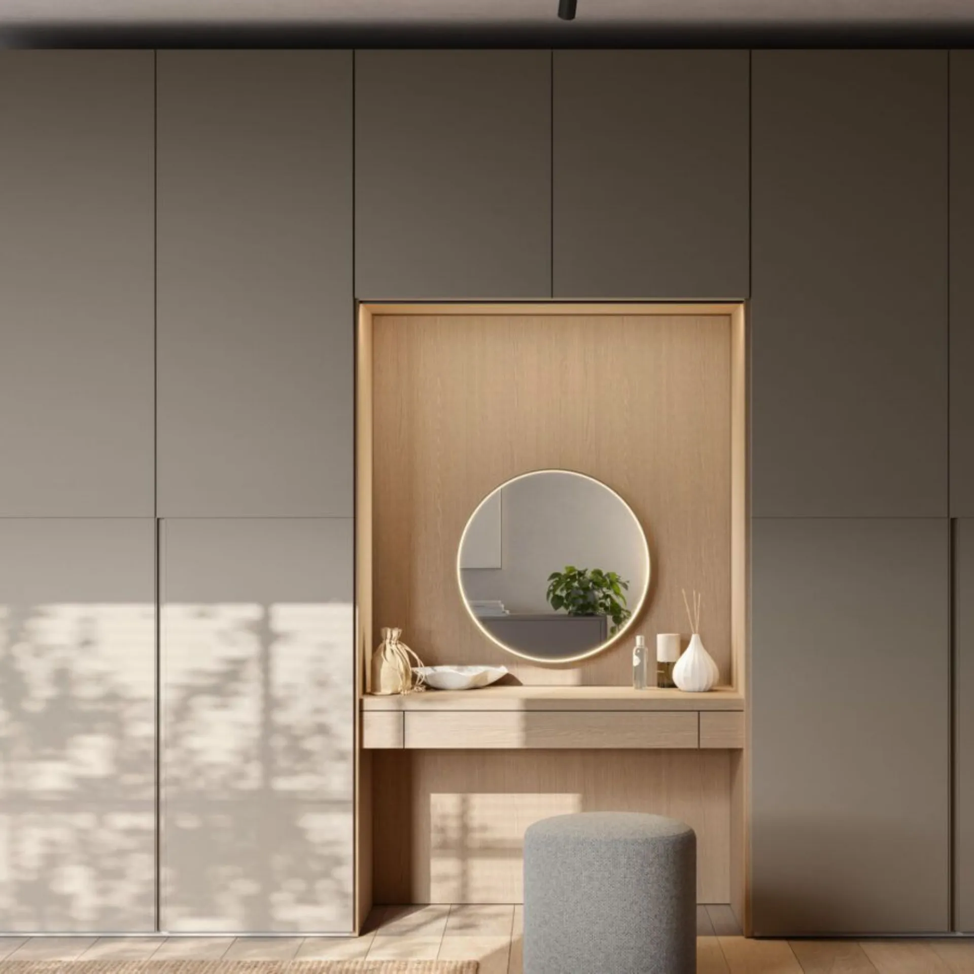 Mottes Mobili offers this wardrobe in laminate with swing doors model Tratto DN in Platinum with Vanity bridge module in Platinum and Arena, dedicated handle in matching color. Makeup mirror. Swing door wardrobe Tratto DN and dedicated handle in matching color. Terminal Ambrogio in Platinum. Wardrobe w.489.5 h.258 d.62 with 3 internal shelves and hanging rods. The offer for this bedroom is 3,100.00 euros including VAT and transportation, assembly excluded. Delivery time about 40 days. For more information contact us via email or visit us in our showroom. For information Mottes Mobili 0424-383612 Info@mottesmobili.com