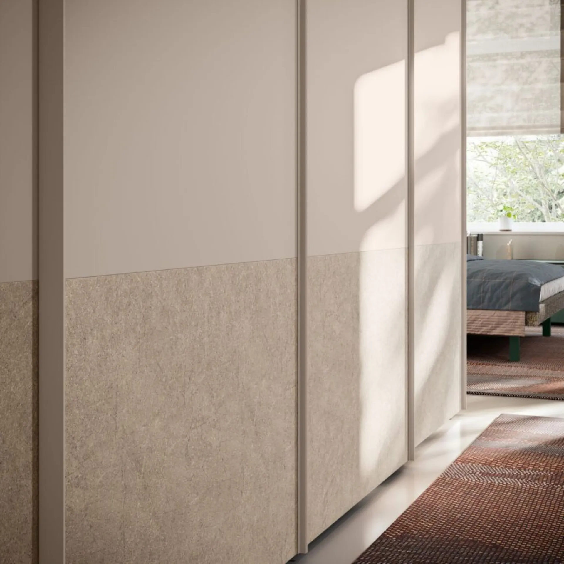 Mottes Mobili offers this Level DN sliding wardrobe in Tortora and Roccia Piacenza, with matched handle and equipped with clothes rods. The wardrobe is 402.5 cm wide, 258 cm high, 62 cm deep, with 4 internal shelves and clothes rods. The price for this wardrobe is €3,200.00, including VAT and delivery, assembly excluded. Delivery time is approximately 40 days. For more information, please contact us via email or visit us in our showroom. For information: Mottes Mobili 0424-383612 Info@mottesmobili.com