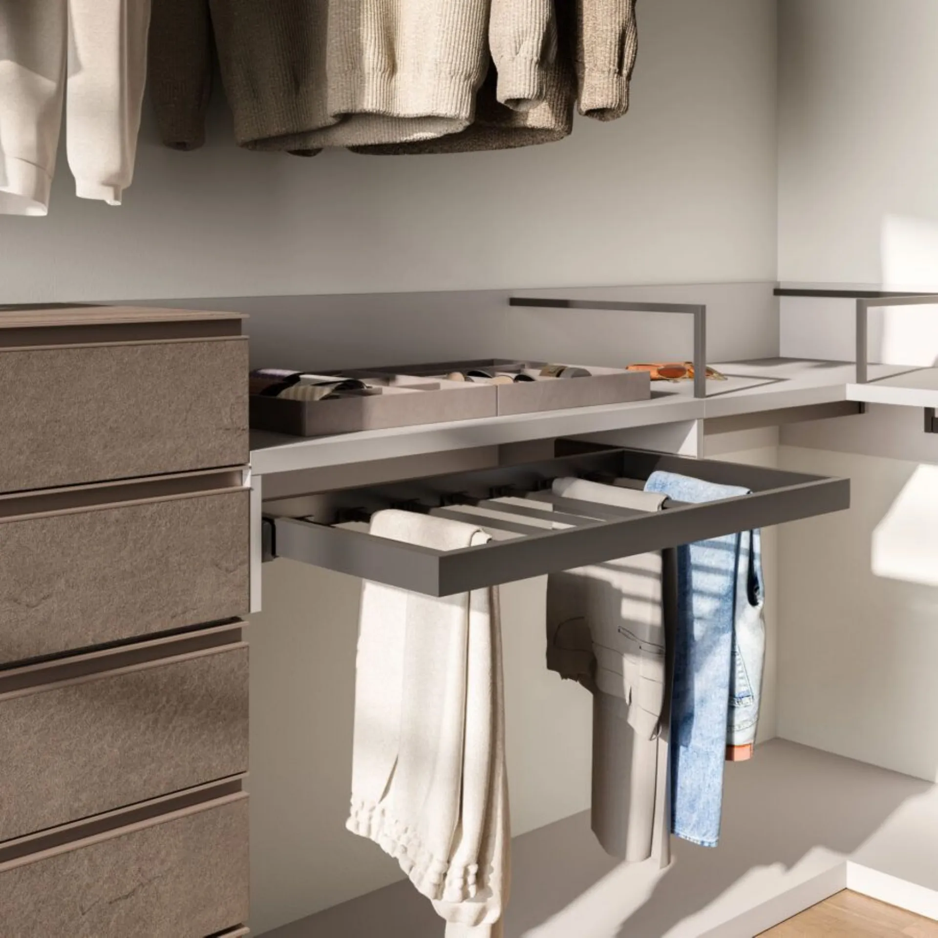 Mottes Mobili offers this walk-in closet without external sliding doors, model Cabina Alea in Velvet and Bravo drawers in Dekor Bronze. Cabina Alea in Velvet with shelves, pull-out pants rack, bench, and hanging unit with drawer. The price for this wardrobe is €3,800.00 including VAT and delivery, assembly not included. Delivery time is approximately 40 days. For more information, contact us by email or visit us at our showroom. For information Mottes Mobili 0424-383612 Info@mottesmobili.com