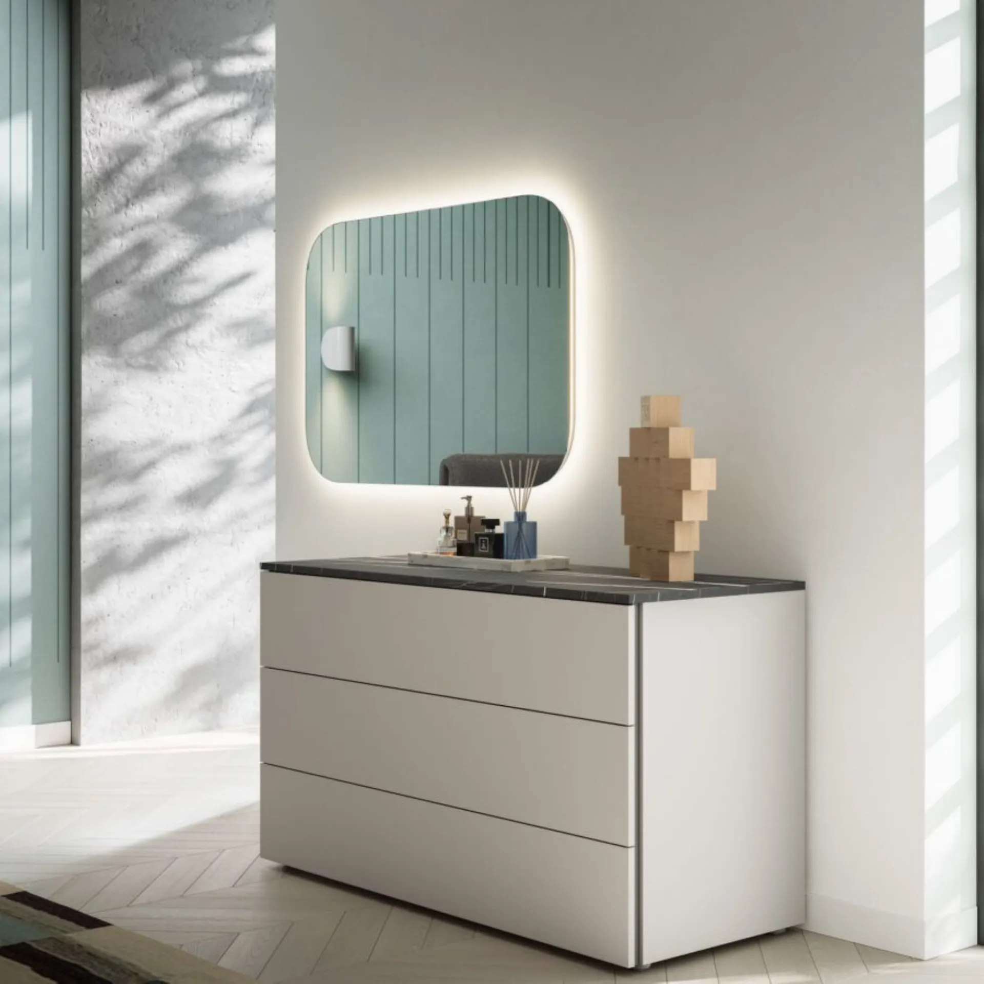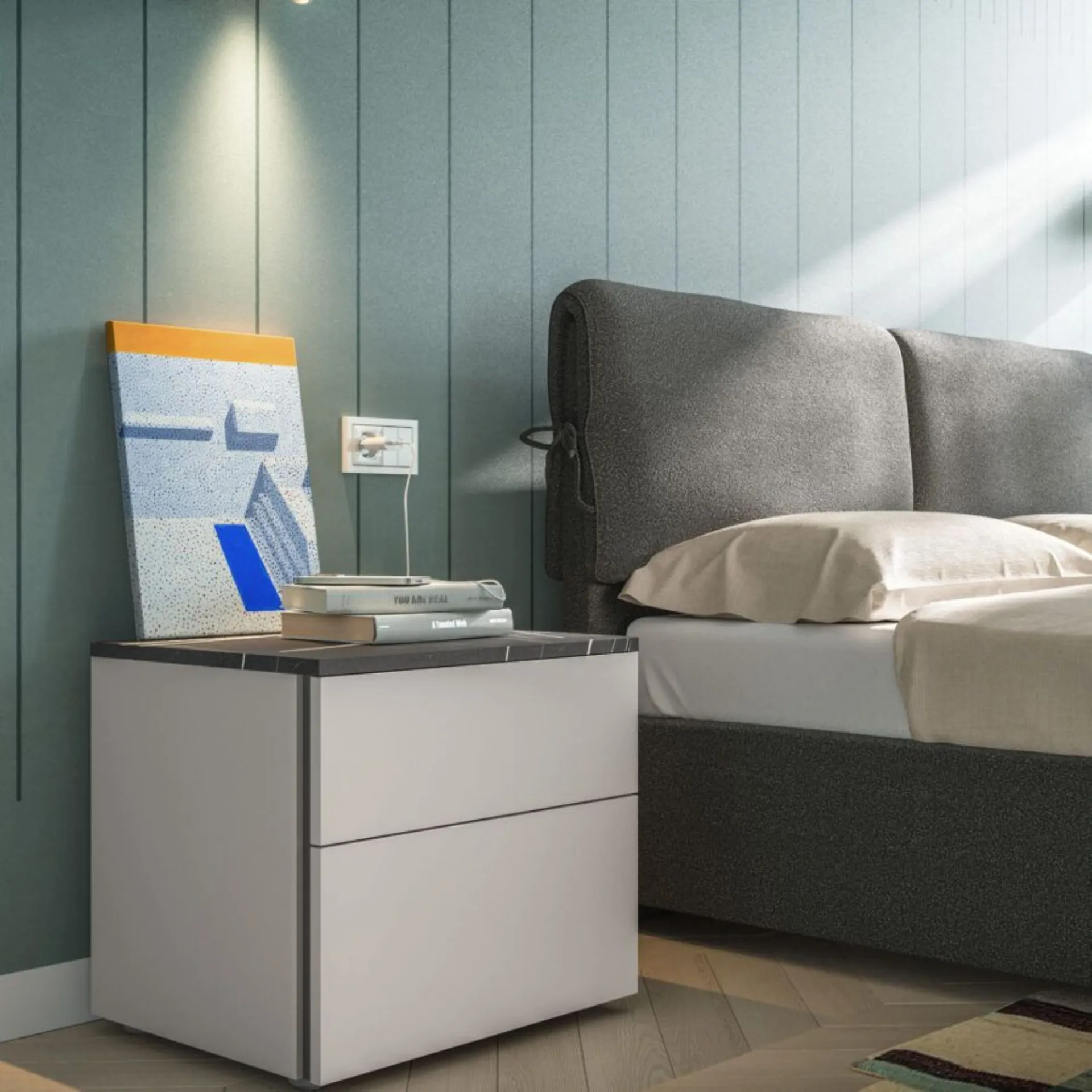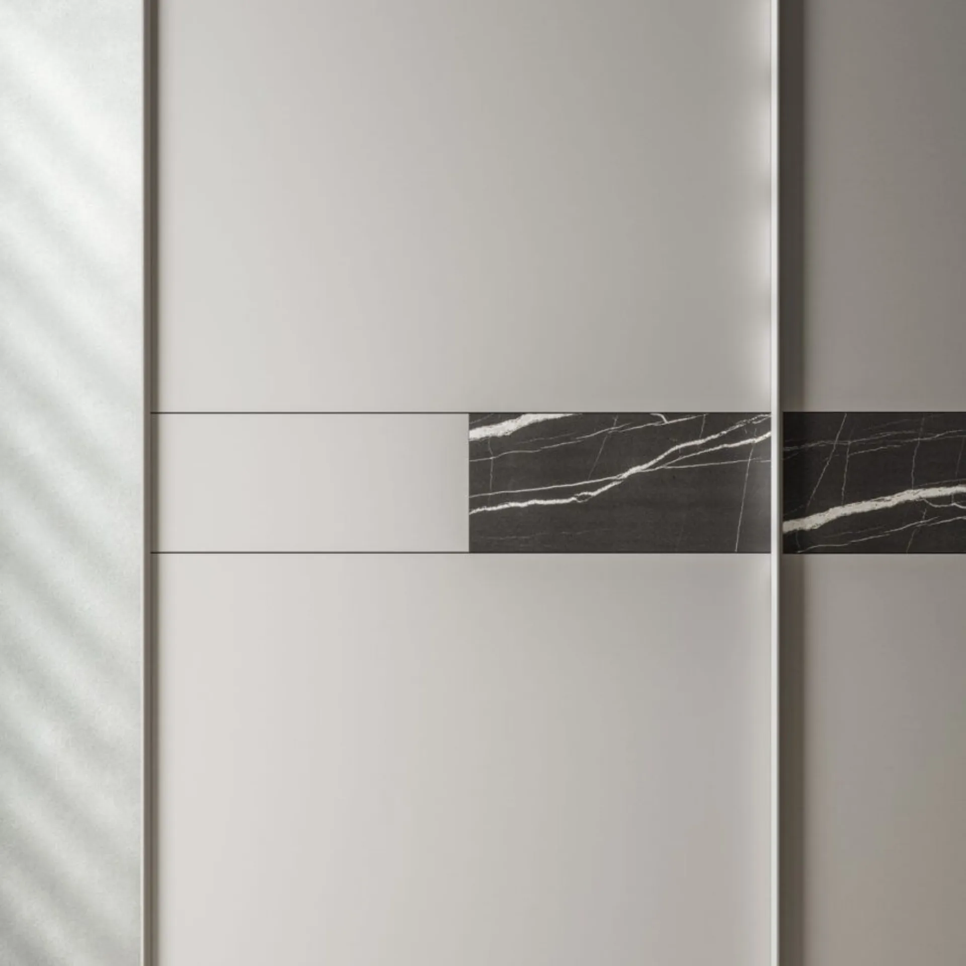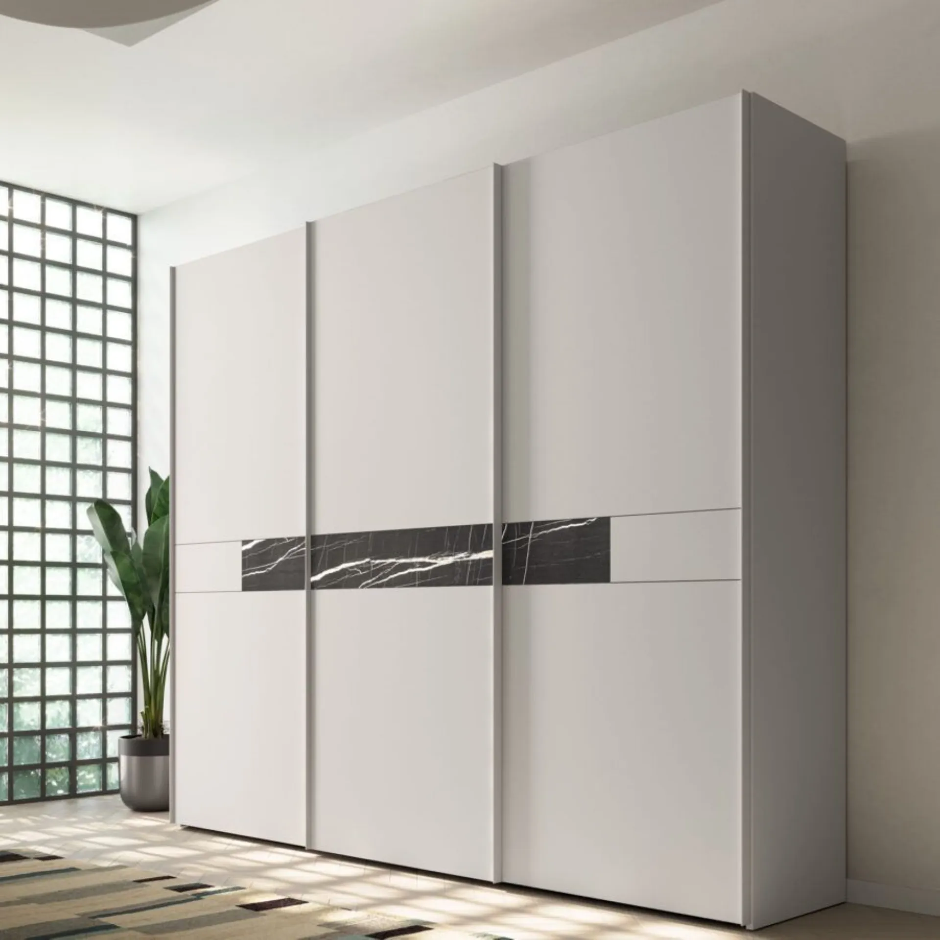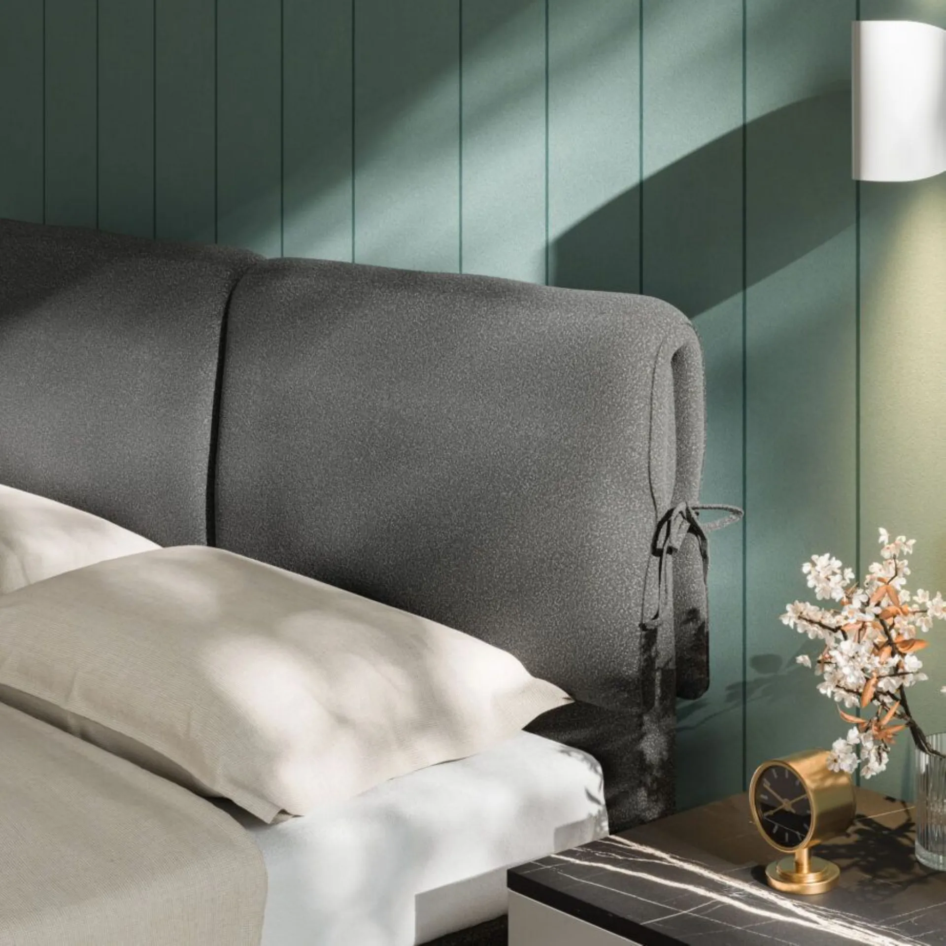 The new night and wardrobe collections by Orme interpret with wisdom, creativity, and tailoring a style of furniture and life, in harmony between contemporary and modern. Modular systems, modular systems, to be tailored to the space. Custom solutions, a wide range of colors and finishes, refined and selected, special processes to ensure impeccable results, focusing on customer satisfaction and respect for the environment. Lenox upholstered bed with Alfa bed frame in Saturno SA20 fabric. Flow group in Velvet and Slate, with top in Tunisian Marble, Soul 31 mirror. Belt sliding wardrobe and Form in Velvet and Tunisian Marble. Internal structure in Cotton. Width 302.5, height 258. Delivery included in the price, 40 working days. Our offer for this double room is 4,800.00 euros including VAT and transportation, excluding bed frame, mattress, and assembly. For more information contact us via email or visit our showroom.