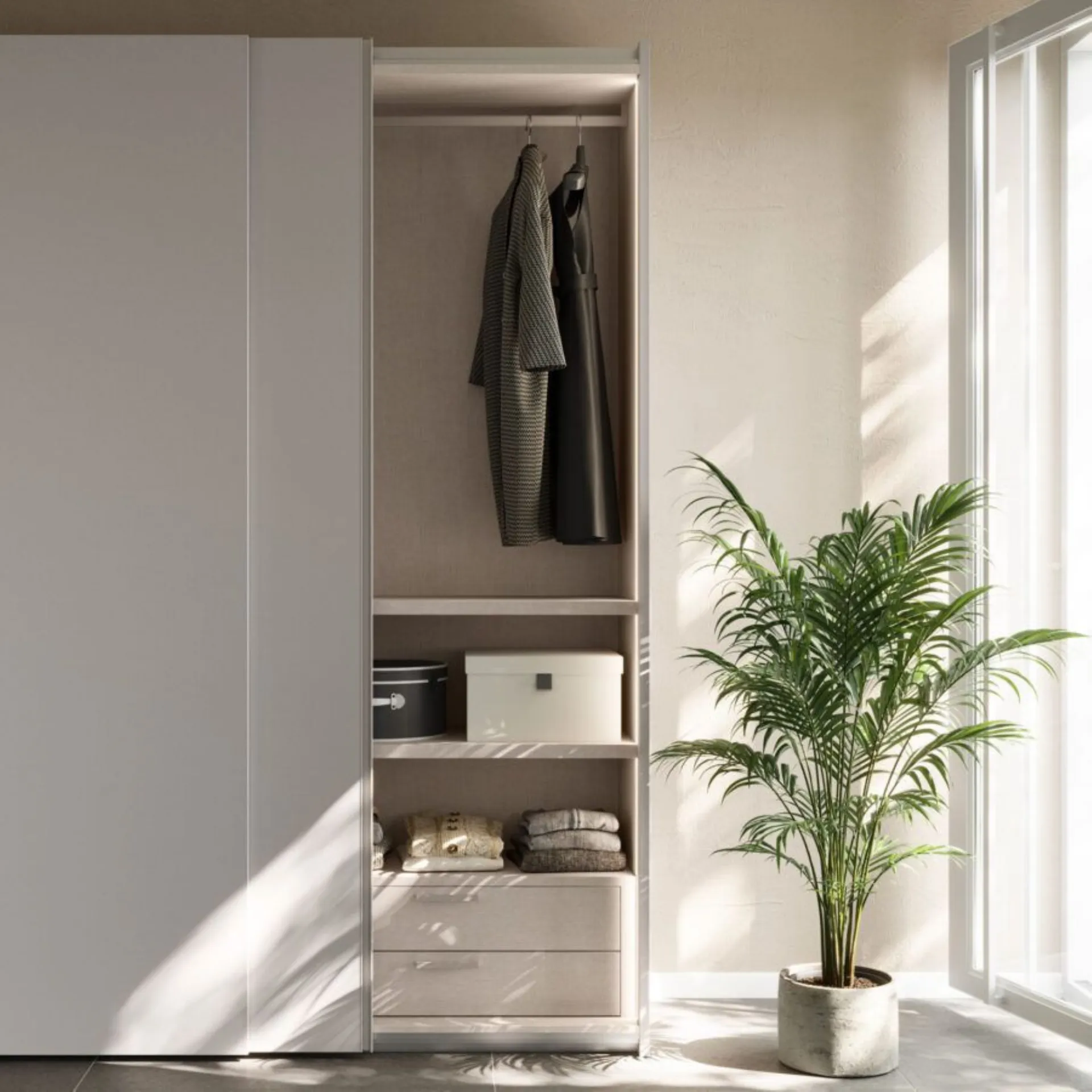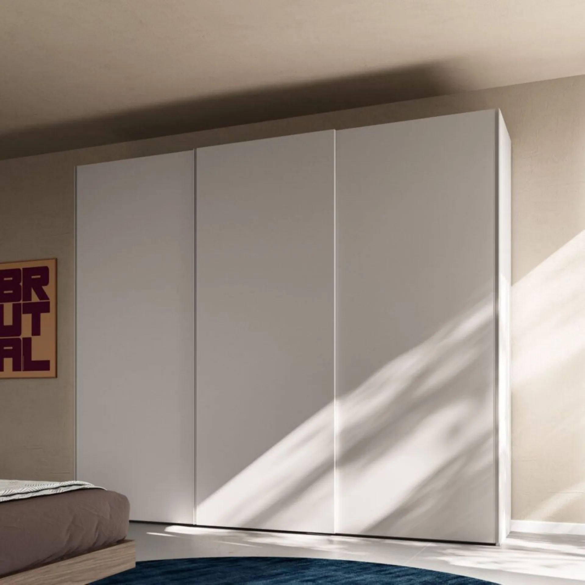 Orme's new night collections and wardrobes interpret wisely, creatively and sartorially a style of furniture and life, in harmony between contemporary and modern. Modular systems, modular systems, to be adapted to the space. Custom solutions, a wide range of colors and finishes, refined and selected, special processing in order to guarantee impeccable results, in the name of customer satisfaction and environmental respect. Arca bed with Alfa bedframe in Walnut. Tratto group in Velvet, Bloom wall units in Walnut and Square mirror. Sliding Tratto wardrobe in Velvet equipped with shelves, clothes rails and internal chest of drawers. Internal structure in Cotton. l.302.5 h.258. Delivery included in the price, 40 working days. Our offer for this bedroom is €3,800.00 including VAT and transport, excluding bed frame, mattress and assembly. For more information, contact us via email or visit our showroom.