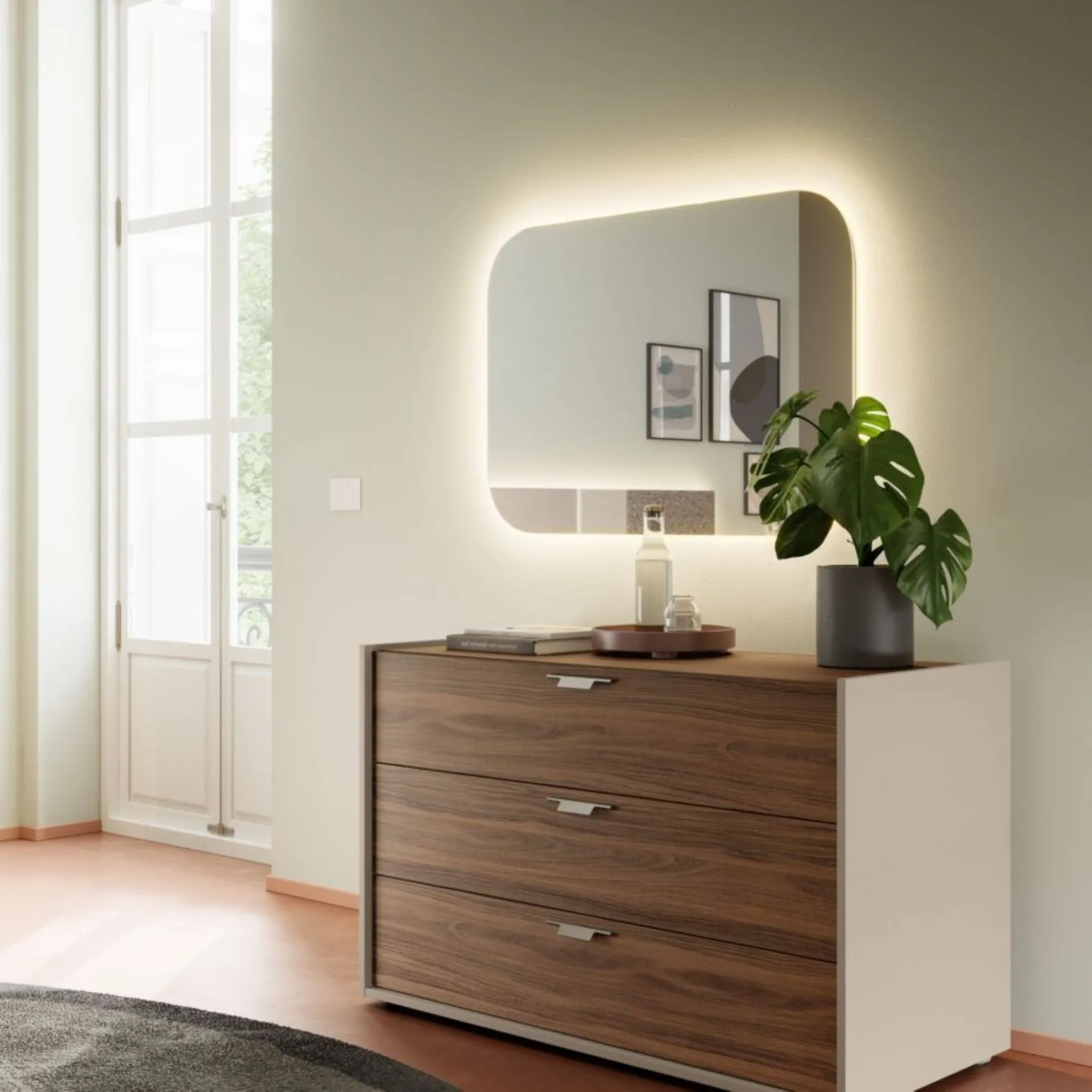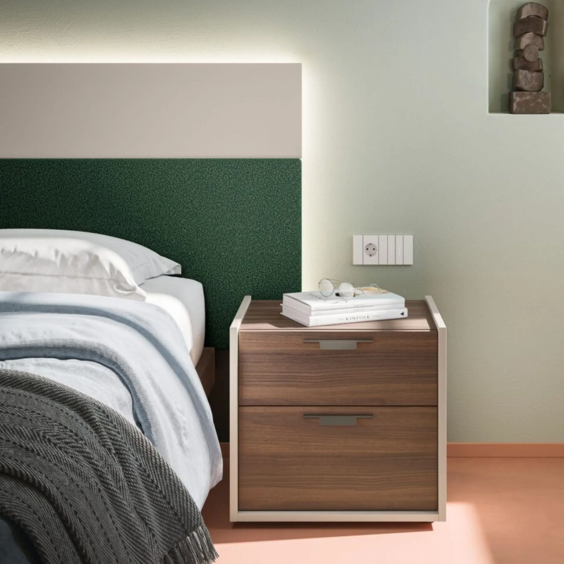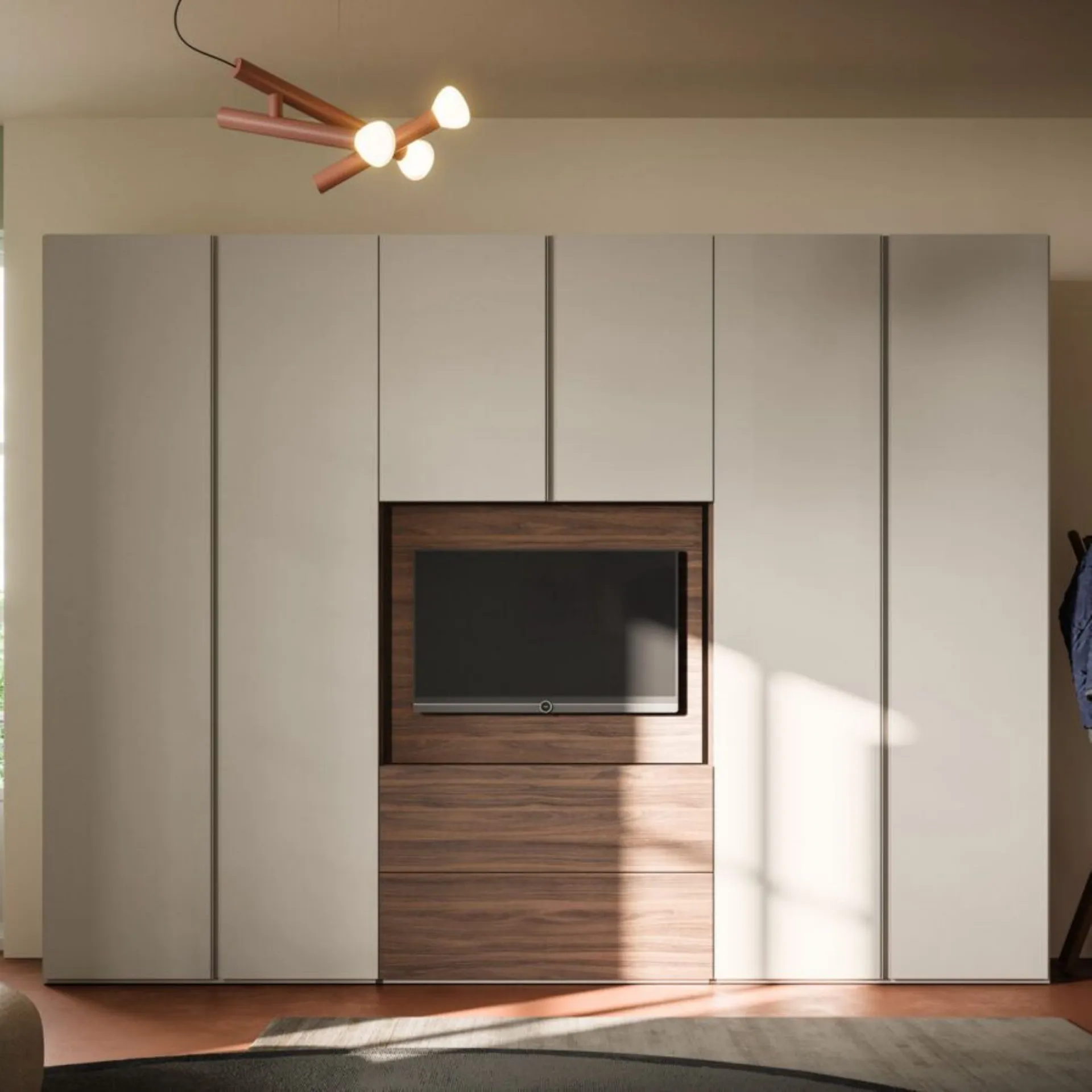 Orme's new night collections and wardrobes interpret with wisdom, creativity and tailoring a style of furnishing and life, in harmony between contemporary and modern. Modular systems, modular systems, to be declined to space. Custom solutions, wide range of colors and finishes, refined and selected, special processes in order to guarantee impeccable results, in the name of customer satisfaction and environmental respect. Giako Basic Boiserie in Taupe, Terracotta, Clara CL03 fabrics, Saturn SA15 and Dafne DA10, Alfa bed frame in Terracotta. Patti group in Taupe and Terracotta with bronzed handles and Soul 31 mirror. Tratto swing wardrobe with Visual element in Taupe and Terracotta. Internal structure in Cotton. w.347.5 h.258. Including delivery in the price, 40 working days. Our offer for this double bedroom is €4,800.00 including VAT and transport, excluding bed frame, mattress and assembly. For more information contact us via email or visit our showroom.