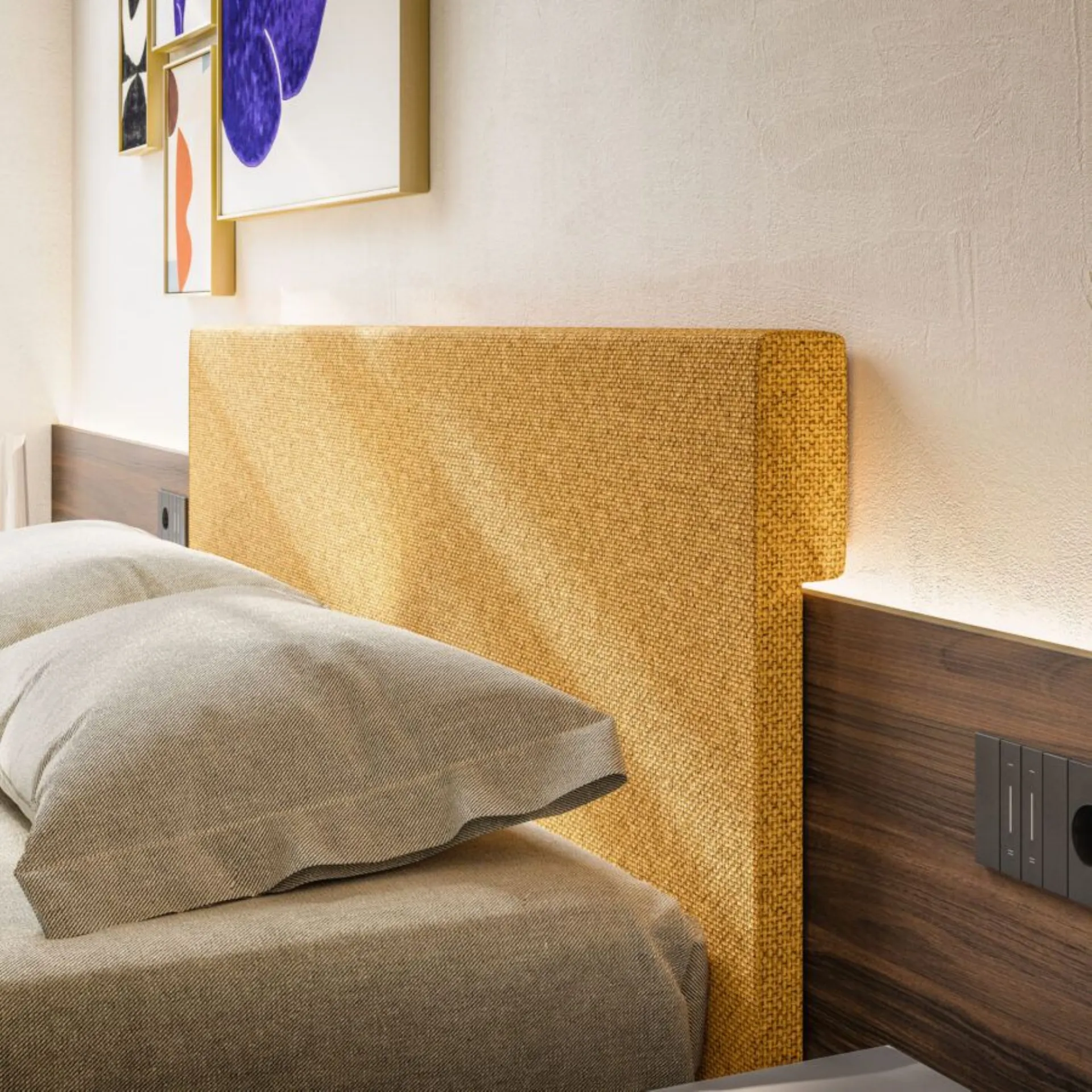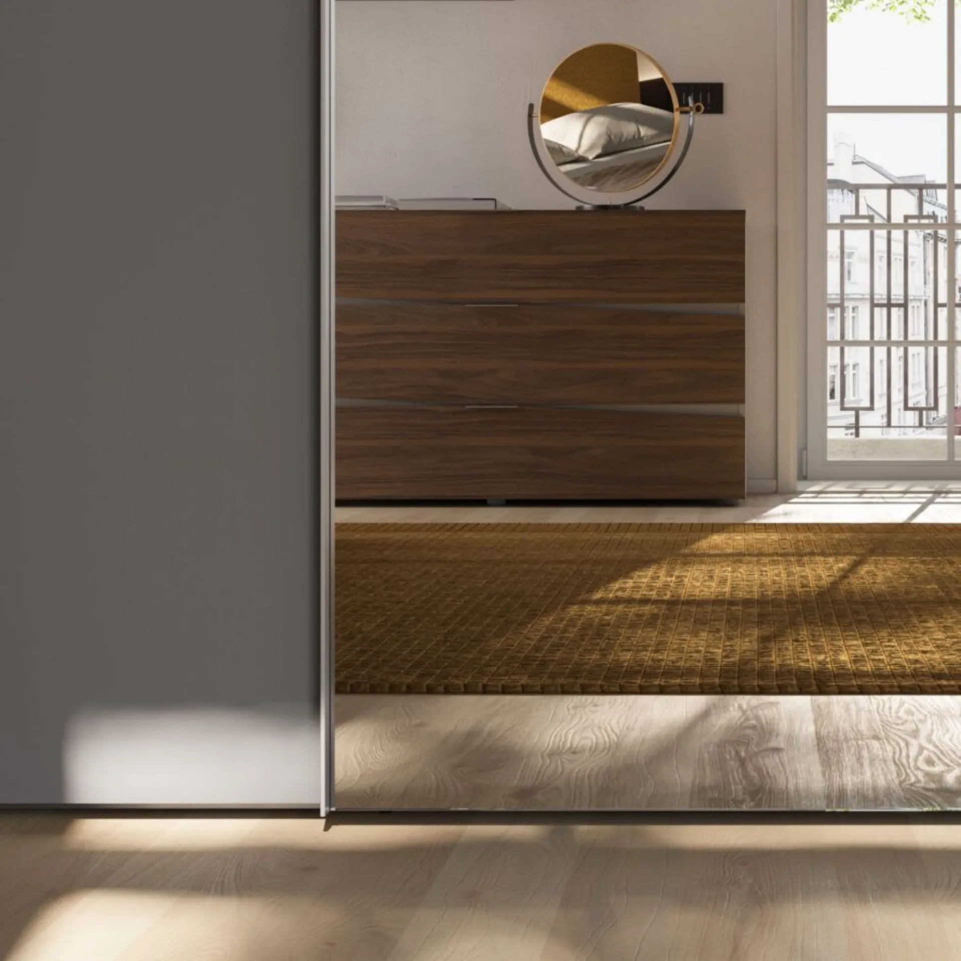 The new night collections and wardrobes by Orme skillfully interpret a style of furnishing and living with wisdom, creativity, and tailoring, in harmony between contemporary and modern. Modular systems, modular systems, to be adapted to space. Custom solutions, a wide range of colors and finishes, carefully selected, special processes to ensure impeccable results, focusing on customer satisfaction and environmental respect. Gap bed system with Cotto wall panels, upholstered headboard in Splendor SP14 fabric and Alfa bed frame in Cotto. Slant bedside table in Grey and Cotto. Slant group and Qubo wall units in Grey and Cotto. Sliding Liscia wardrobe and Mirror in Grey and Fumè mirror. Internal structure in Cotton.