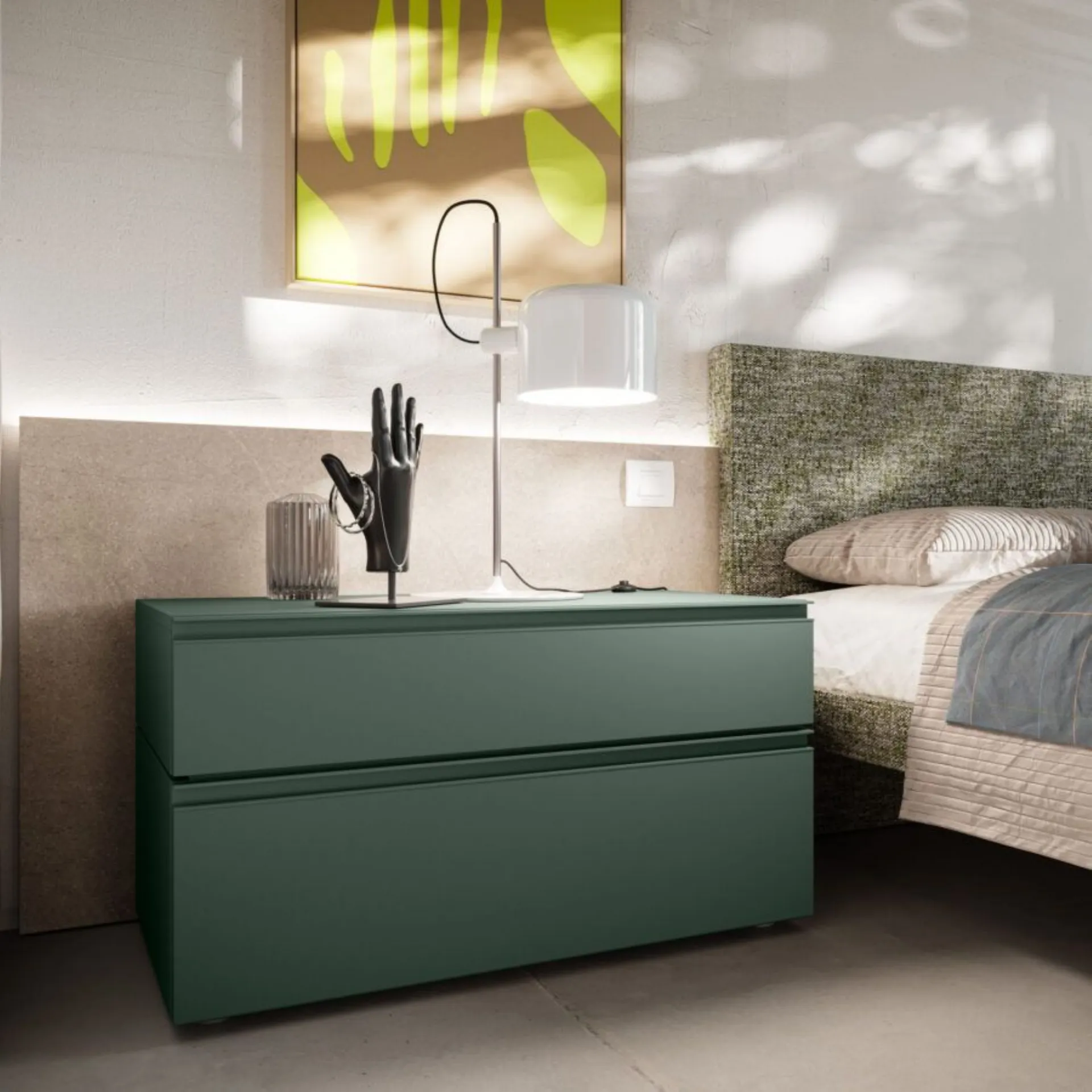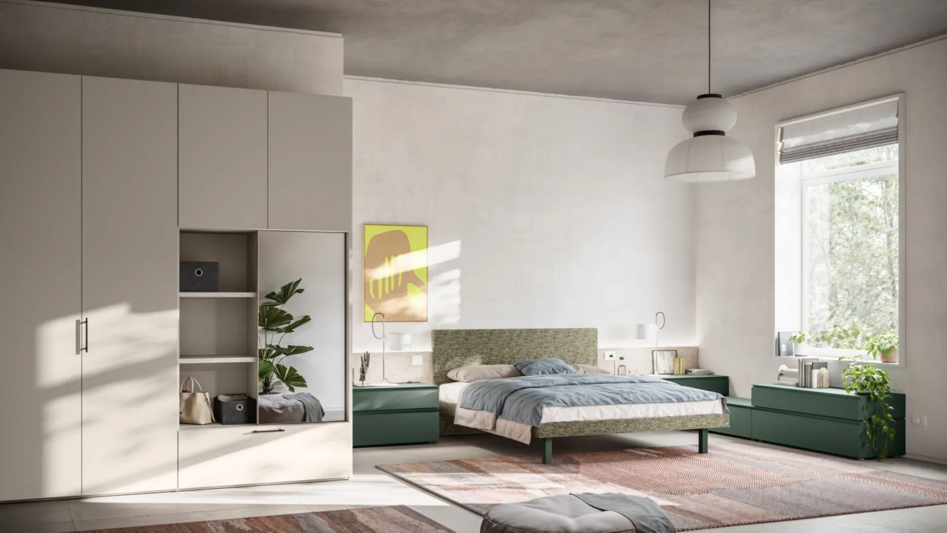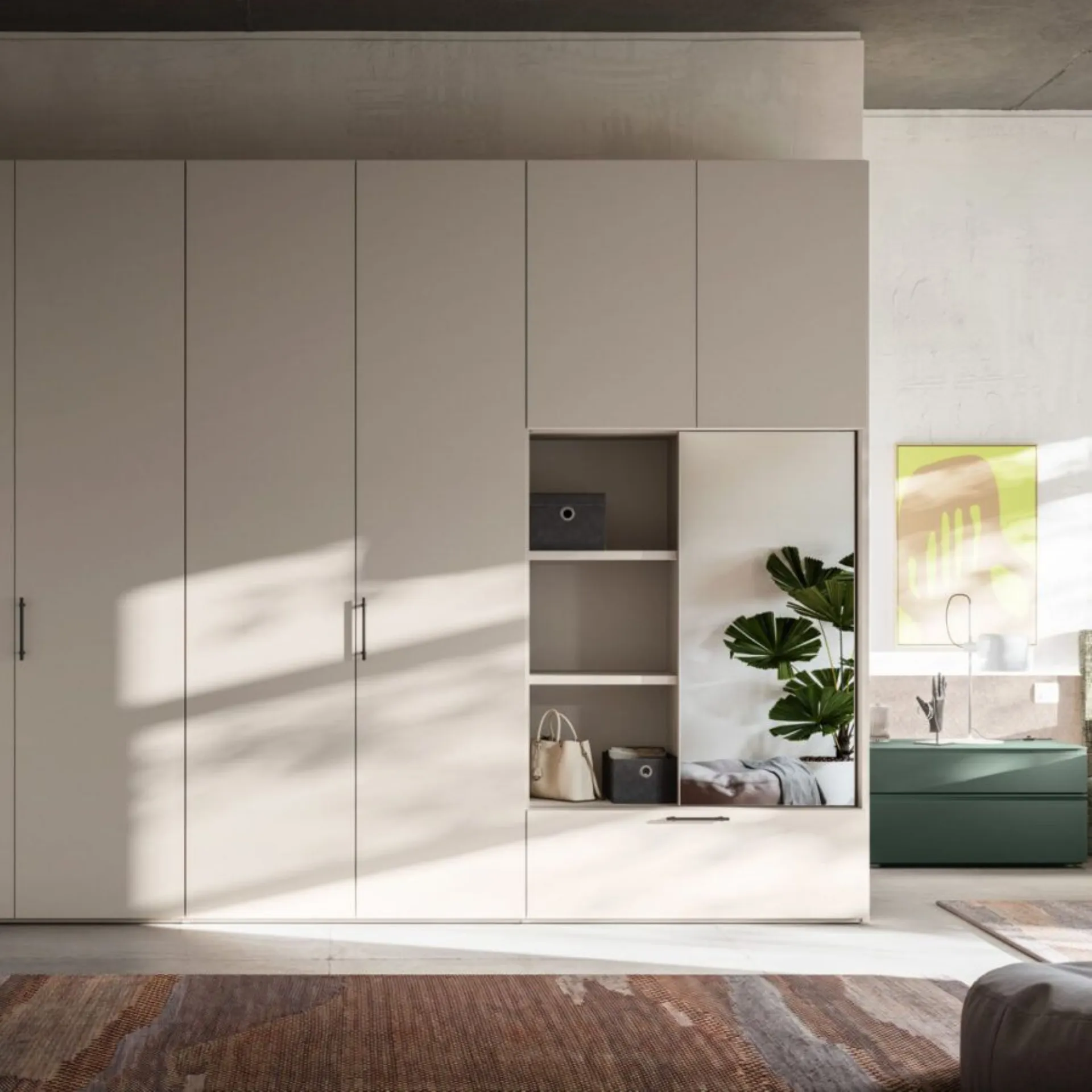The new night collections and wardrobes by Orme interpret with wisdom, creativity, and tailoring a style of furnishing and living, in harmony between contemporary and modern. Modular systems, modular systems, to be tailored to the space. Custom solutions, a wide range of colors and finishes, refined and selected, special processing to ensure impeccable results, in the name of customer satisfaction and respect for the environment. Gap bed system with wall panels in Roccia Piacenza, upholstered headboard and bed frame Alfa in fabric Clara CL07. Bravo group with Juniper handle. Swing door wardrobe Liscia in Tortora with handle M 35. Internal structure in Cotton. 350 cm width, 258 cm height. Delivery included in the price, 40 working days. Our offer for this double bedroom is €5,000.00 including VAT and transport, excluding bed frame, mattress, and assembly. For more information contact us via email or visit our showroom.