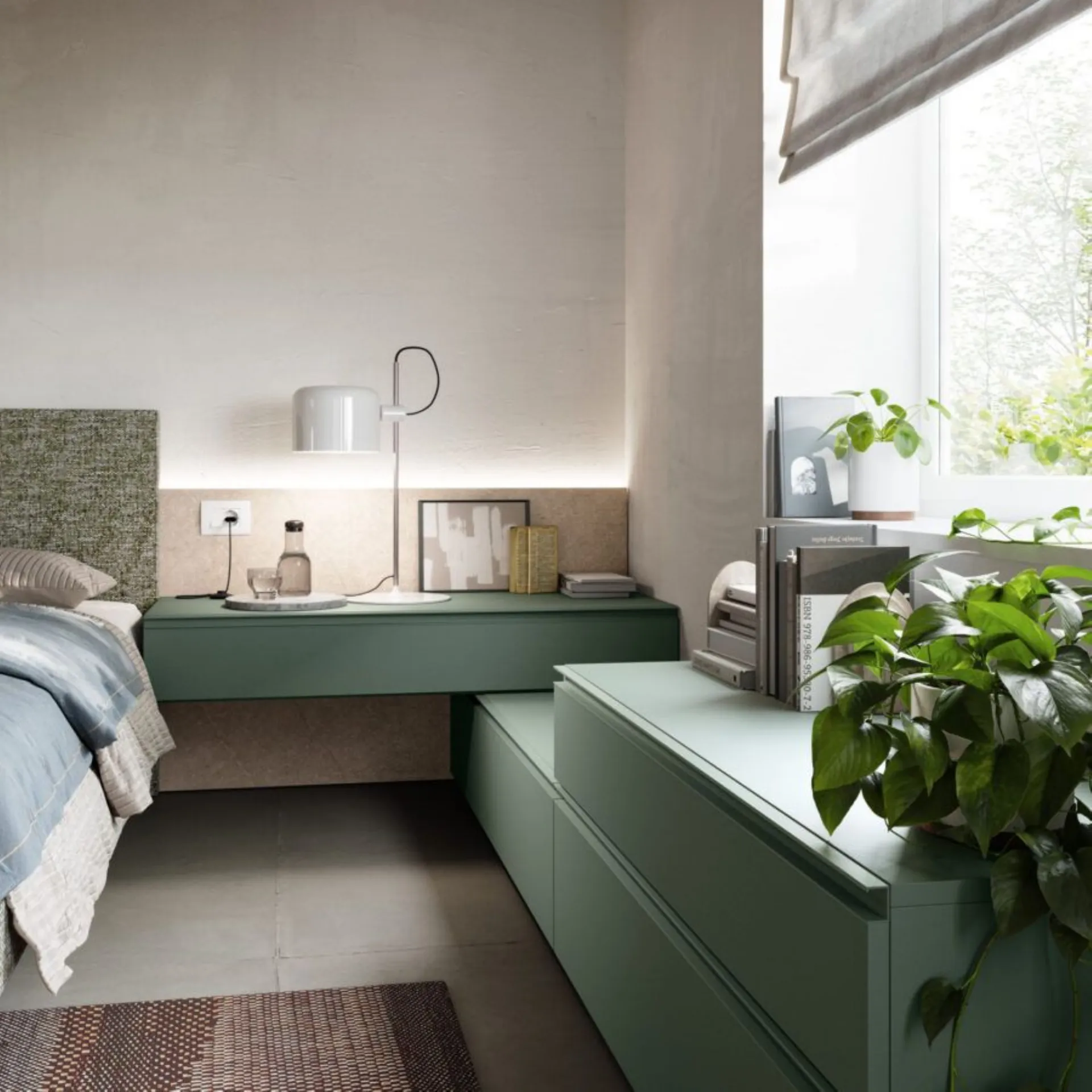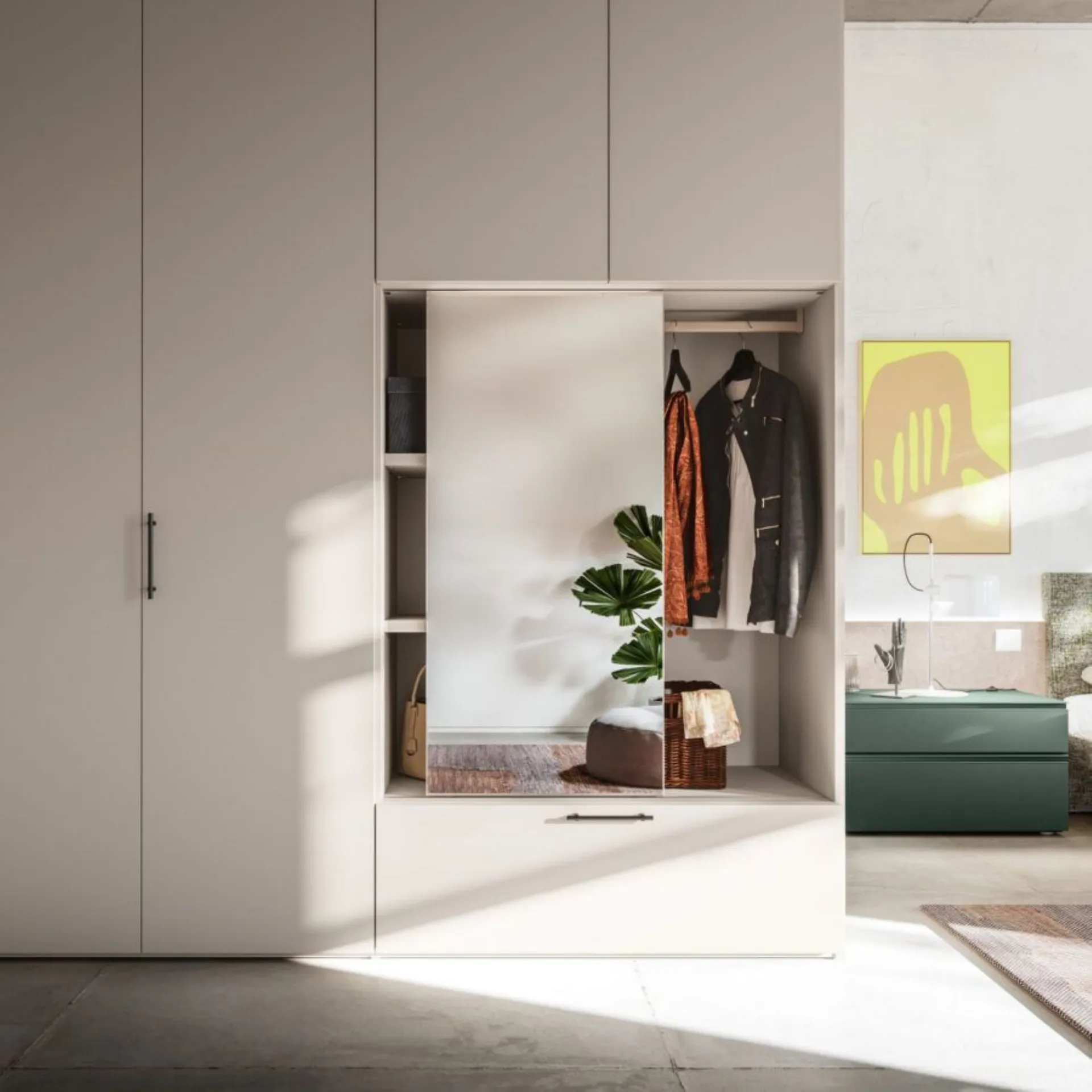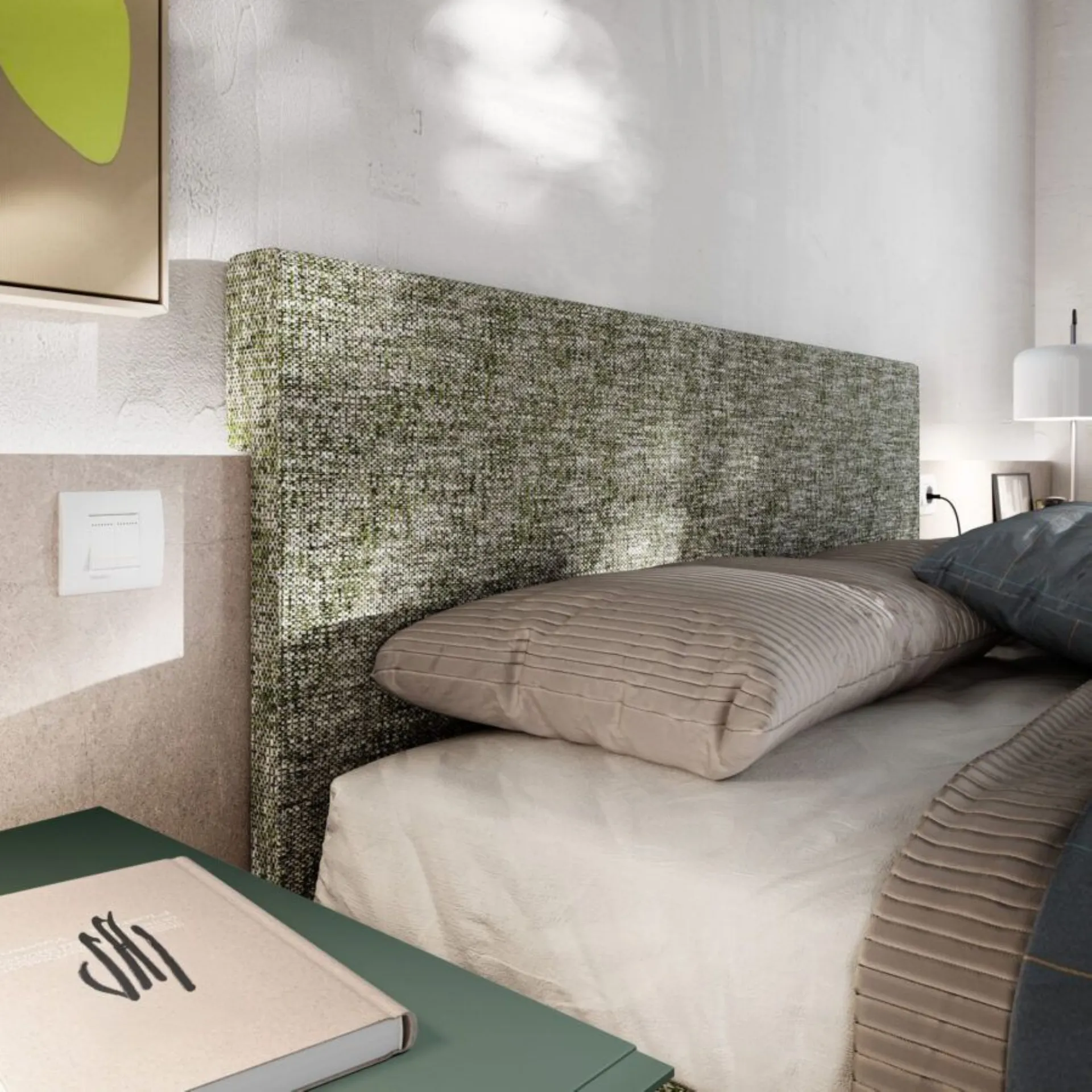 The new night collections and wardrobes by Orme interpret with wisdom, creativity, and tailoring a style of furnishing and living, in harmony between contemporary and modern. Modular systems, modular systems, to be tailored to the space. Custom solutions, a wide range of colors and finishes, refined and selected, special processing to ensure impeccable results, in the name of customer satisfaction and respect for the environment. Gap bed system with wall panels in Roccia Piacenza, upholstered headboard and bed frame Alfa in fabric Clara CL07. Bravo group with Juniper handle. Swing door wardrobe Liscia in Tortora with handle M 35. Internal structure in Cotton. 350 cm width, 258 cm height. Delivery included in the price, 40 working days. Our offer for this double bedroom is €5,000.00 including VAT and transport, excluding bed frame, mattress, and assembly. For more information contact us via email or visit our showroom.