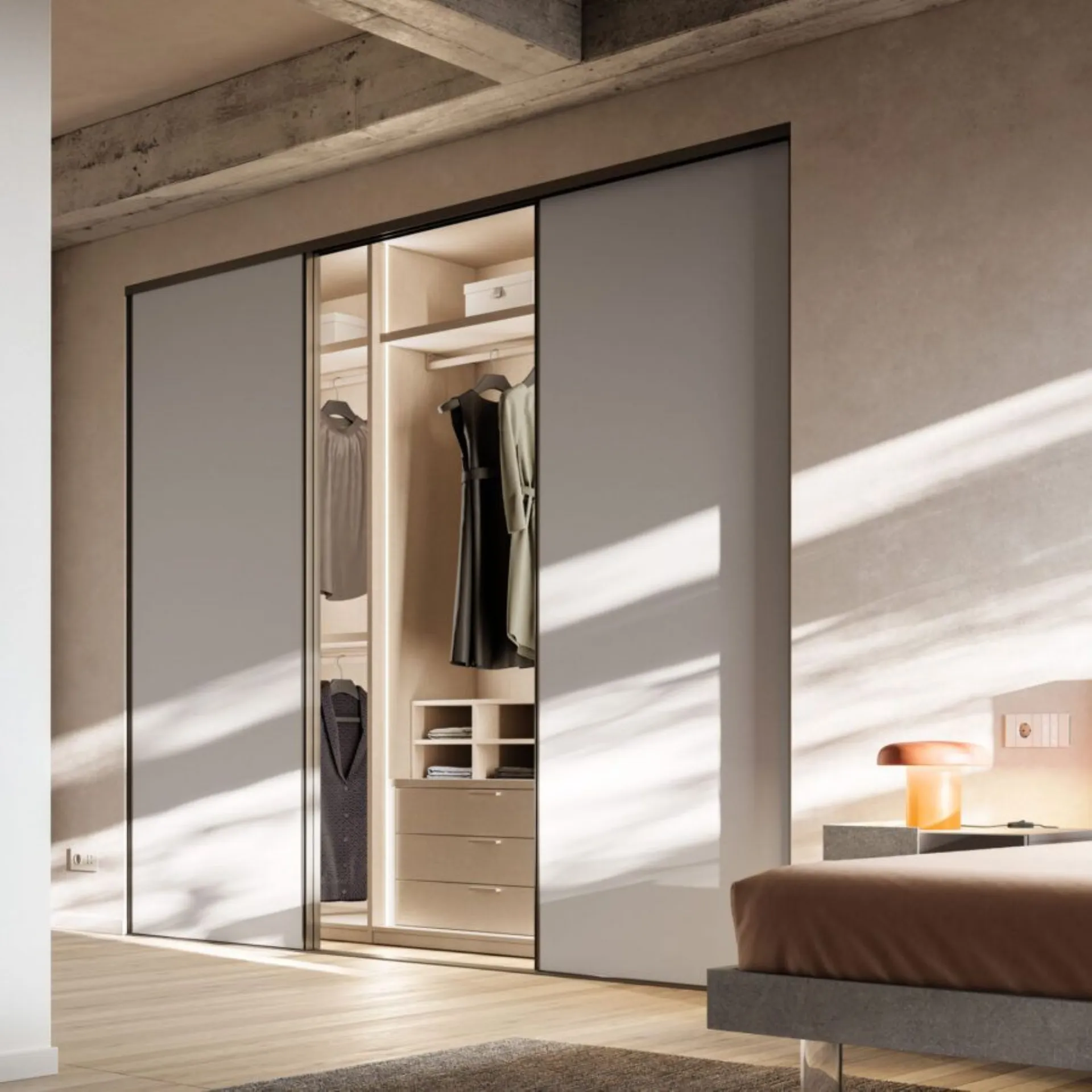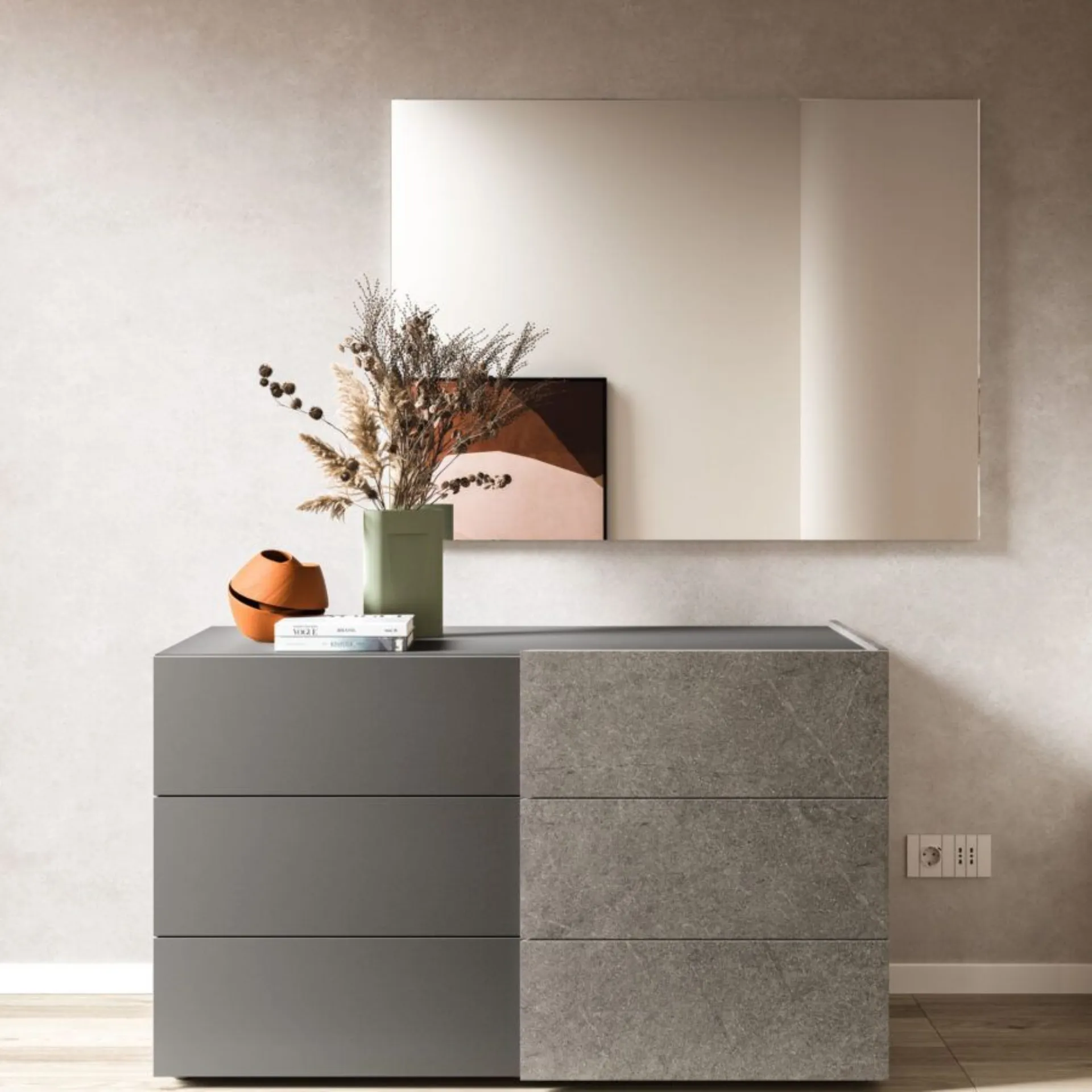The new Orme night collections and wardrobes interpret with wisdom, creativity and tailoring a style of furniture and life, in harmony between contemporary and modern. Modular systems, modular systems, to be declined to space. Custom solutions, wide range of colors and finishes, refined and selected, special processing in order to guarantee impeccable results, in the name of customer satisfaction and respect for the environment. Cremi bed with Alfa bed frame in Roccia Bolsena. Double bedside table in Lavagna and Roccia Bolsena. Basic cabin portal in Velvet and wardrobe without doors equipped with chest of drawers and shirt holder in Cotton. l.3001/3200 h.258. Delivery included in the price, 40 working days. Our offer for this double bedroom is €3,500.00 including VAT and transport, excluding bed frame, mattress and assembly. For more information contact us via email or visit our showroom.