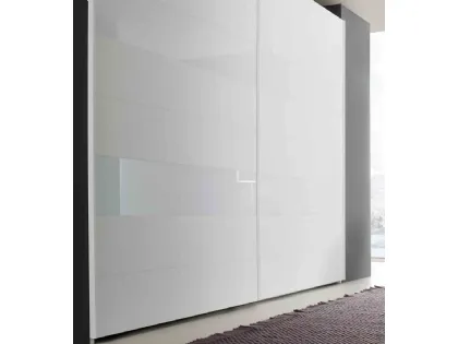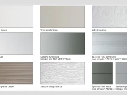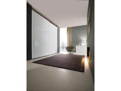 Sliding door wardrobe with slow closing, panels th. mm. 18/14 ennobled. Vertical aluminum profiles. Aluminum sliding rails. Lacquered, satin, mirror, smooth or silk-screened glasses for applications, beveled th. cm. 0,4. Melamine panels sp. cm. 2.2, for sides, bases, lids, plinths and internal shelves. Structural shelves sp. cm4, ABS edge on visible sides. Vertical profiles for side panels in mdf or melamine wood. All panels “ melamine” of the program, made of wood particles or fiber and coated with melamine paper with wood effect and solid color, are classified in class E1 (0 formaldehyde emission), in compliance withà with current regulations.