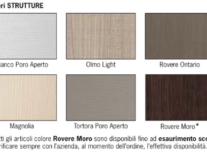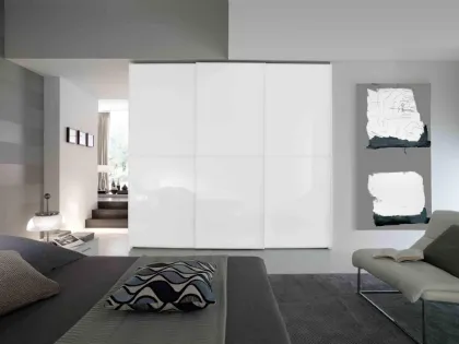 Wardrobe with sliding doors with slow closing, panels th. mm. 18/14 ennobled. Vertical aluminum profiles. Aluminum sliding rails. Lacquered, satin, mirror, smooth or silk-screened glasses for applications, beveled th. cm. 0,4. Melamine panels sp. cm. 2.2, for sides, bases, lids, plinths and internal shelves. Structural shelves sp. cm4, ABS edge on visible sides. Vertical profiles for side panels in mdf or melamine wood. All panels “ melamine” of the program, made of wood particles or fiber and coated with melamine paper with wood effect and solid color, are classified in class E1 (with 0 formaldehyde emission), in compliance withà with current regulations.