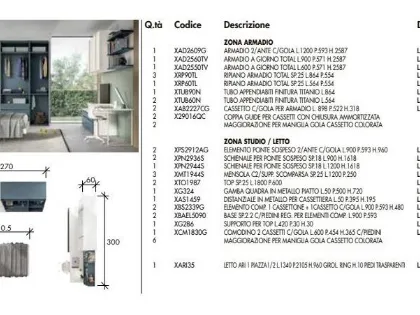 A cozy space that inspires positivity and well-being. A bedroom with Sage and Teal pastel colors, combined with Bleached Larch that conveys a peaceful and fresh atmosphere, creating a refined and modern space. The composition features a bed model Ari with a fabric upholstered headboard and Ring bed frame. Width 134cm, depth 210.5cm, height 96cm. Bedside table in Teal finish with two drawers. A study area complete with desk, wall cabinets with groove handle, shelves, and double base chest of drawers, designed to be welcoming and offer a multifunctional environment that combines entertainment and productivity. It has a total length of 300cm, height 258cm. Completing the room is the clean and modern style wardrobe. Wardrobe with double swing door and spacious open compartment module, consisting of spacious shelves, clothes racks, and two drawers. The wardrobe has a length of 270cm, height 258cm. Bed base included. Mattress not included. Finishes customization included in the price. Delivery included in the price, 30-40 working days. The offer for this bedroom is €3900.00. For more information contact us via email or visit our showroom.