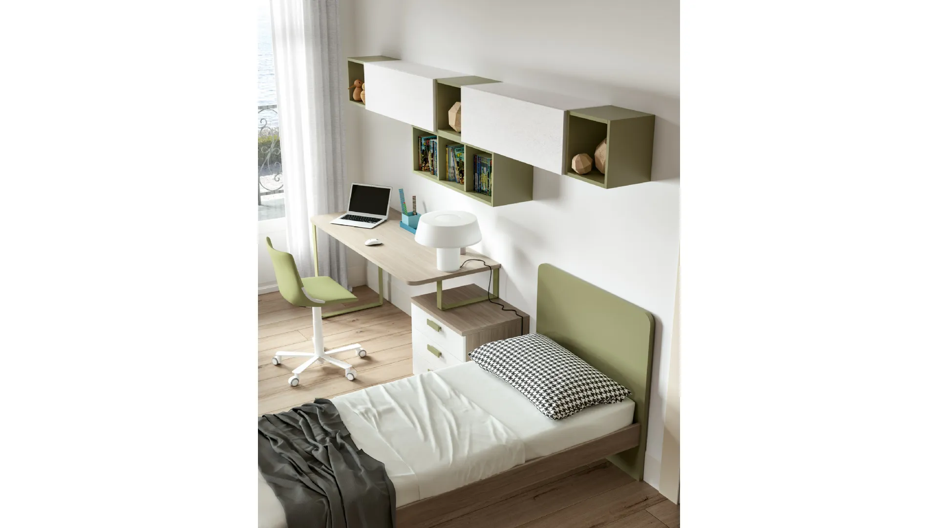 In our showroom you can buy this proposal for children's bedrooms by Mottes Mobili. The bedrooms must be a comfortable and easy space, where you can devote yourself to school, have fun, rest. With this model of bespoke bedroom in matt lacquer you will find how to perfectly furnish the place where your children will grow up. With this proposal of made-to-measure children's bedrooms by Mottes Mobili you will have reliabilityà and aesthetic value, the perfect combination to create the junior space. In our showroom we sell the bedrooms of the Mottes Mobili brand and we take care of following you from the choice to the design of your furniture and accessories. Single bedroom with Quadro model bed with colored headboard and bed frame, wardrobe with 4 hinged doors with double column bookcase, study corner with desk and wall units. Items made to order with customizable front finishes and handles. Customizable sizes on request. Maximum composition height 258cm. Overall dimensions visible on the plan. Bed base, mattress and chair excluded from the offer. Our proposal è of € 2,480.00.