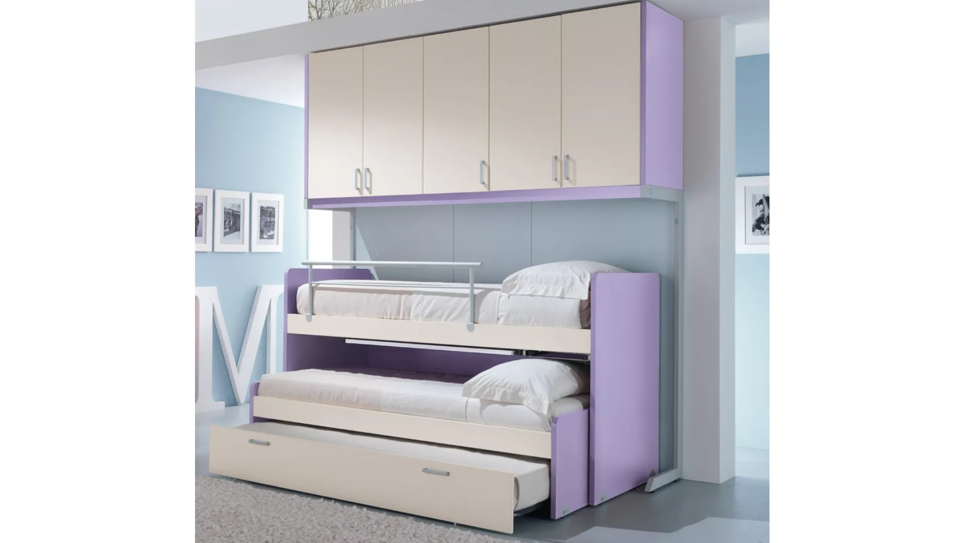This space-saving room for the little ones, with a matt lacquered finish satisfies the requests of parents and the tastes of the little ones. With the S75 space-saving children's room proposal you will have a livable place that will follow; children as they grow up. For the children's bedroom, S75 creates versatile compositional solutions, in a complete range of colors and finishes. To design children's bedrooms, we offer versatile articulations. There are many activities; that children play in the bedroom. Bridge solution with support sides at " C" height 164cm. The upper sliding bed of the Mambo series, equipped with an extractable desk and ladder, 206cm long, 116cm high and 26cm deep; 90cm, è combined with the lower twist slide 198cm long and 26-deep; 88cm with removable net. Composition with total length 200cm and height 250cm, available to order in 40-50 working days, with customizable material finishes. Our offer of € 2,400.00 includes slatted frames, mattresses excluded.
