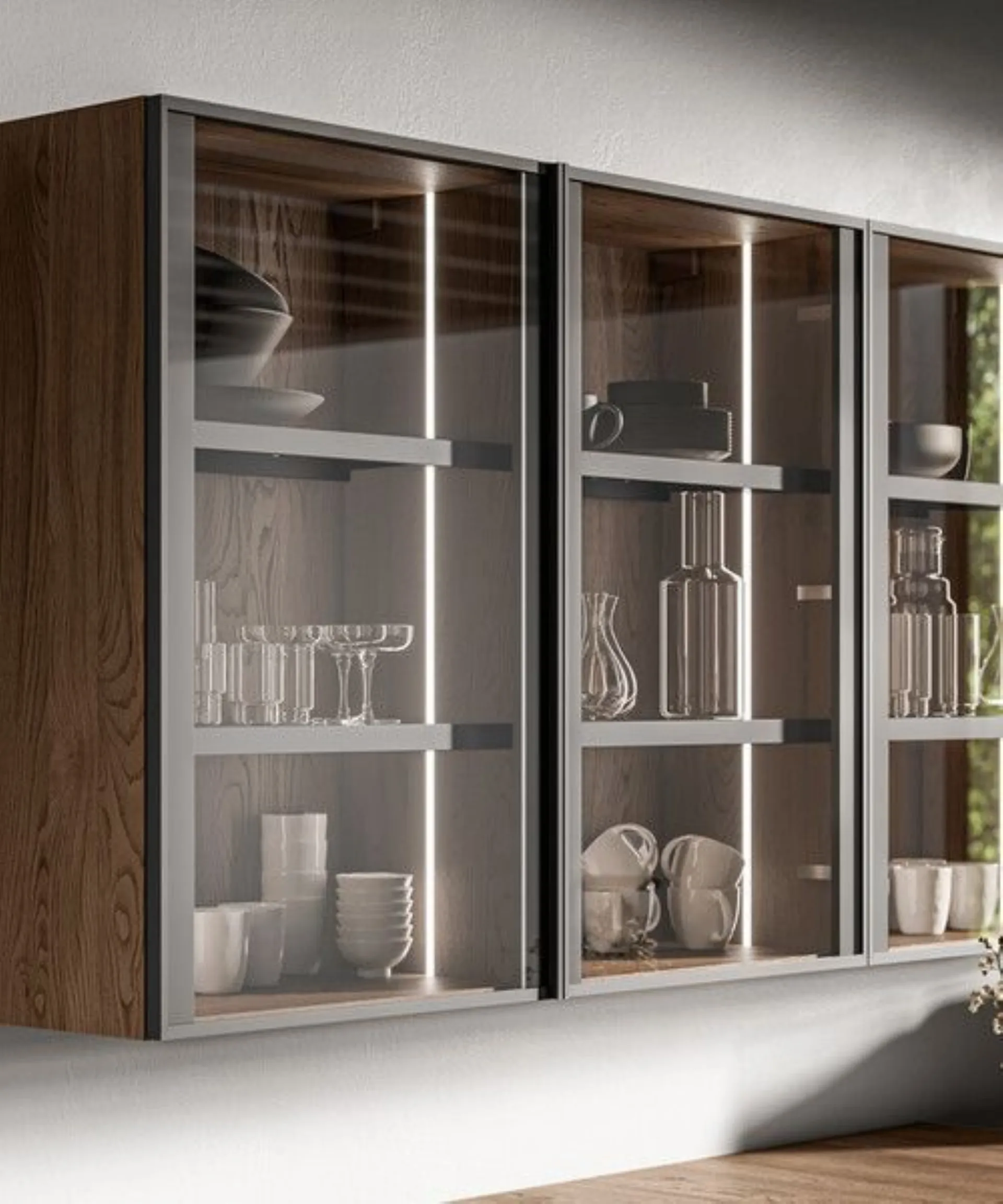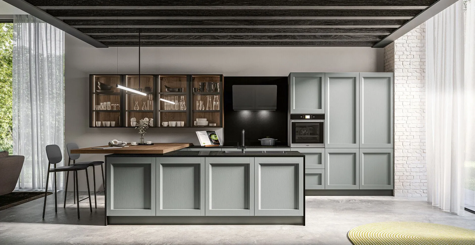 You can customize Frida to your liking according to your taste and turn it into a contemporary and very modern kitchen, perfectly in line with your needs. You have at your disposal 33 open-pore lacquered shades, with visible grain, two with a decapè finish and a classic choice, the brandy finish for that touch of wood that warms the heart and gives an immediate sensation of warmth in every kitchen. The solid ash frame door of Frida is also available on request in a transparent glass version and possibly with a wood decoration for a more classic taste.
