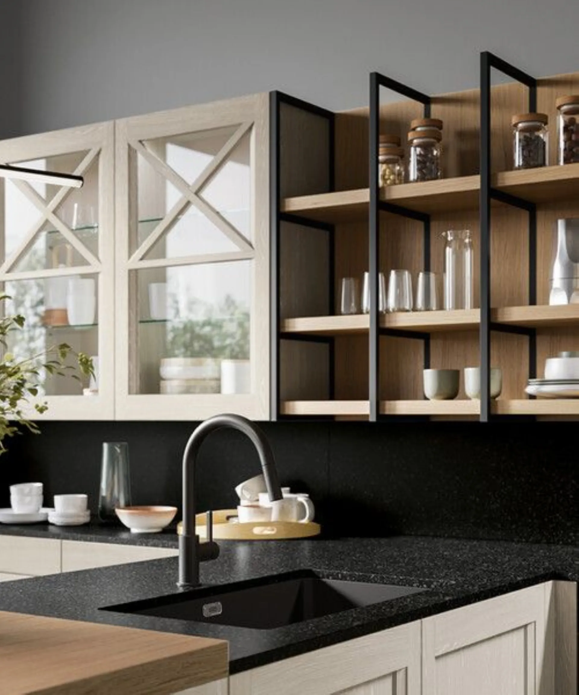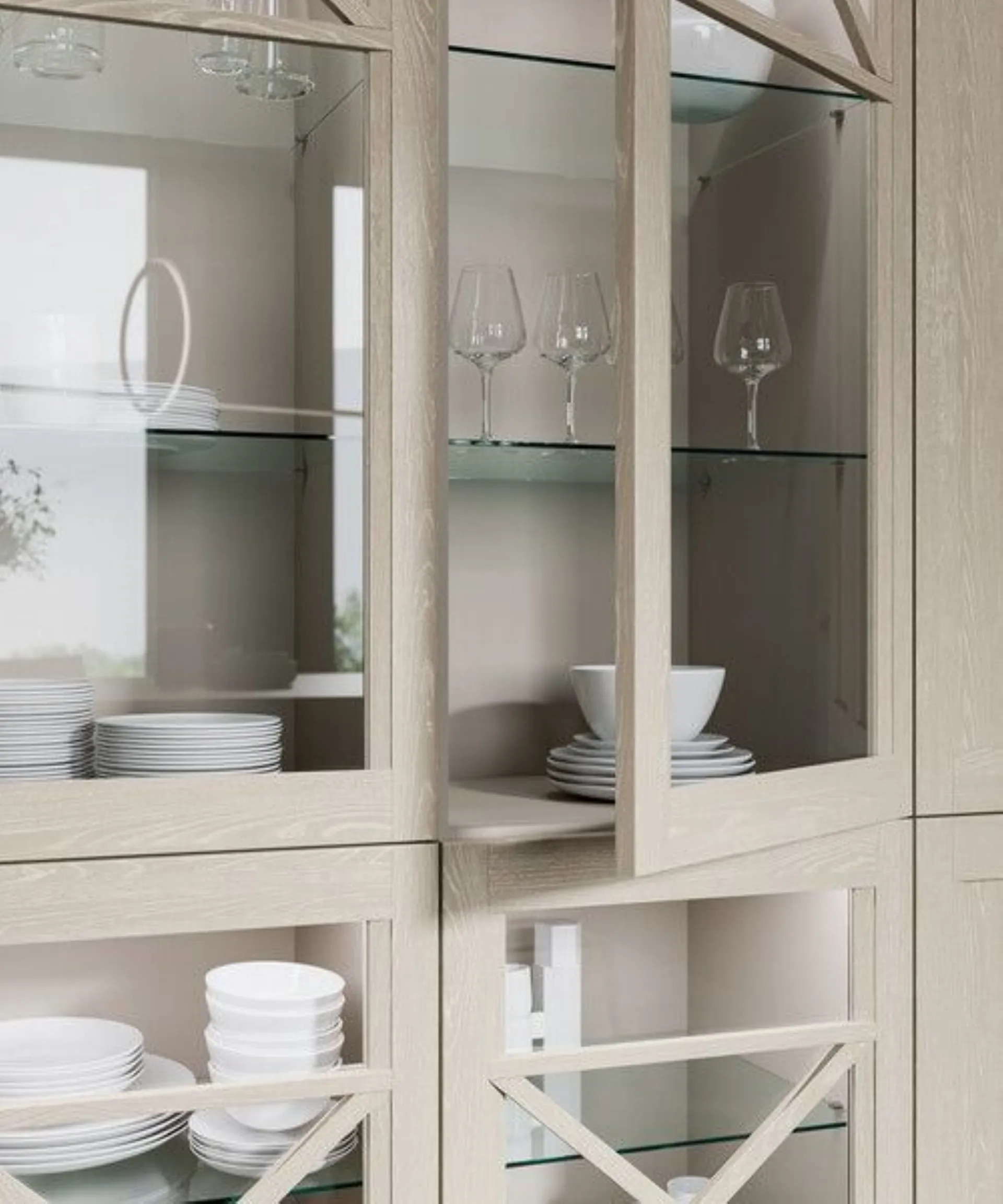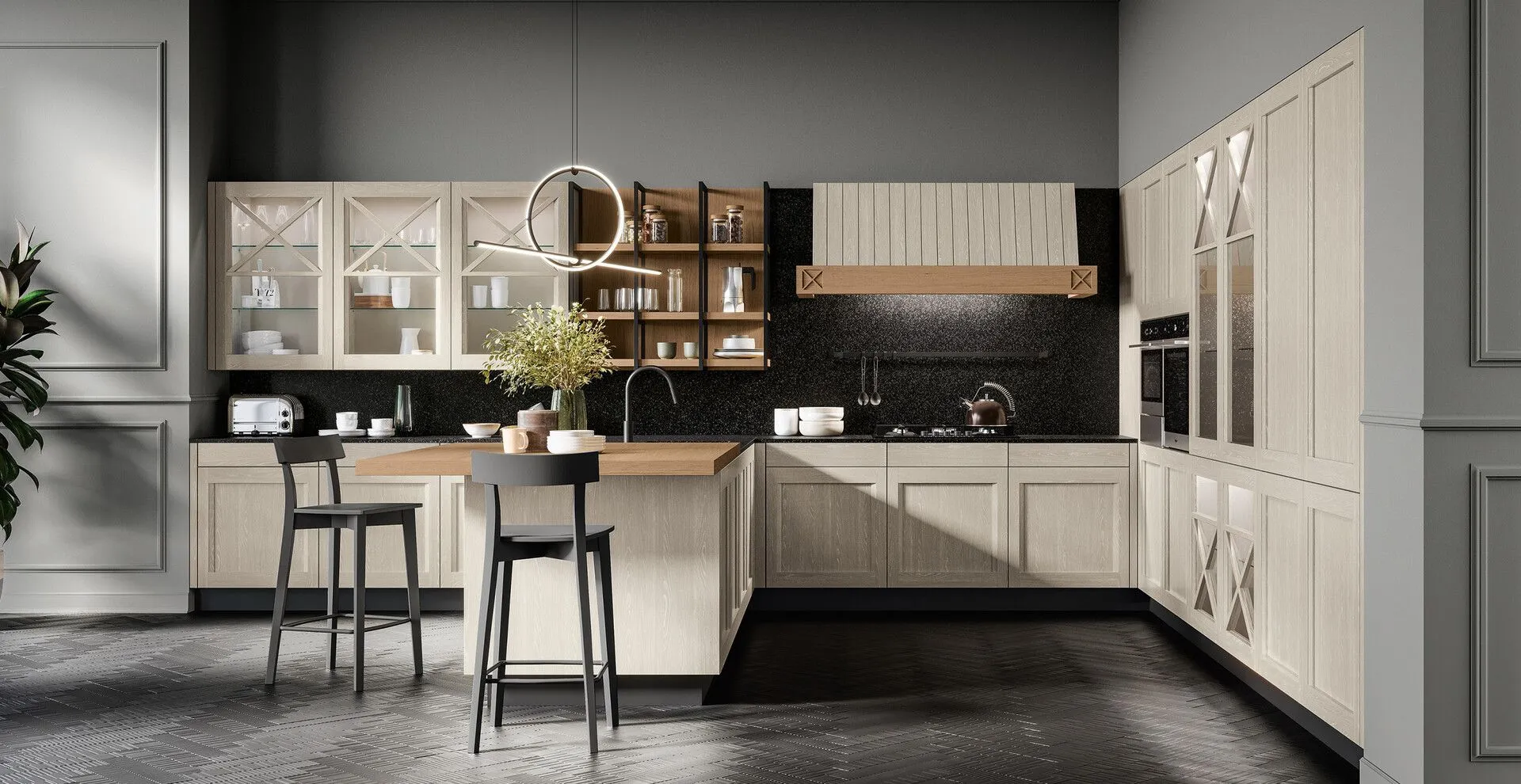 You can customize Frida to your liking, following your taste and making it a contemporary and very current kitchen, perfectly in line with your needs. You have at your disposal 33 open-pore lacquered shades, with the grain visible, two with a decapé finish and a classic choice, the brandy finish for that touch of wood that warms the heart and immediately gives a feeling of warmth in any kitchen. The solid ash frame door of Frida is also available on request in a transparent glass version and possibly with a wooden decoration for a more classic taste.