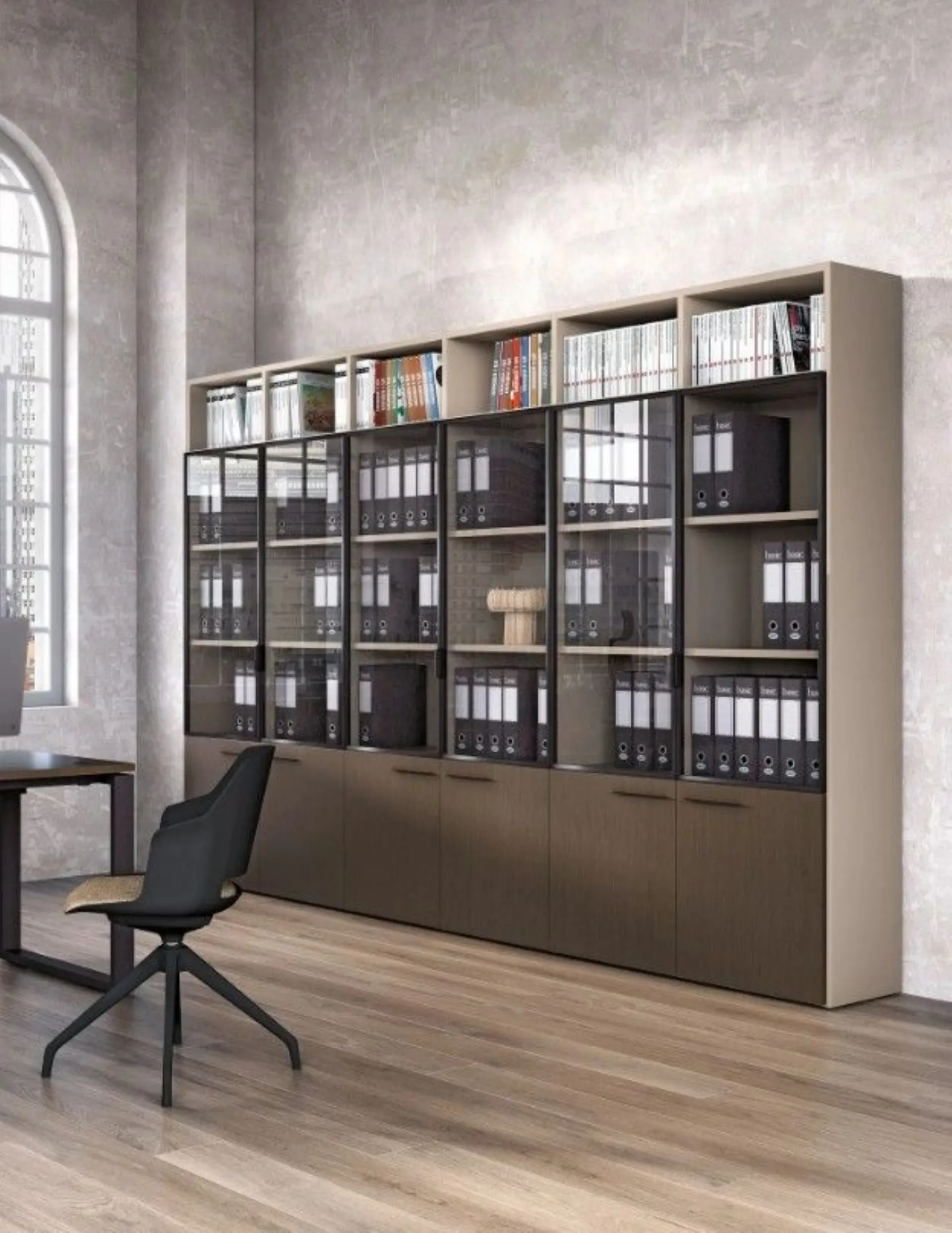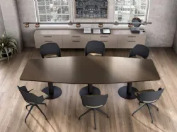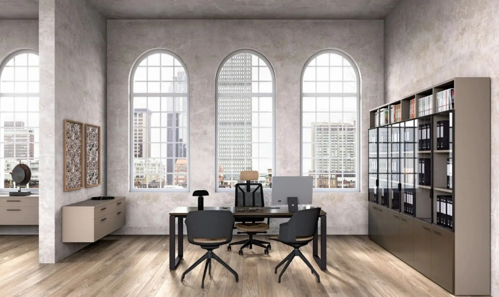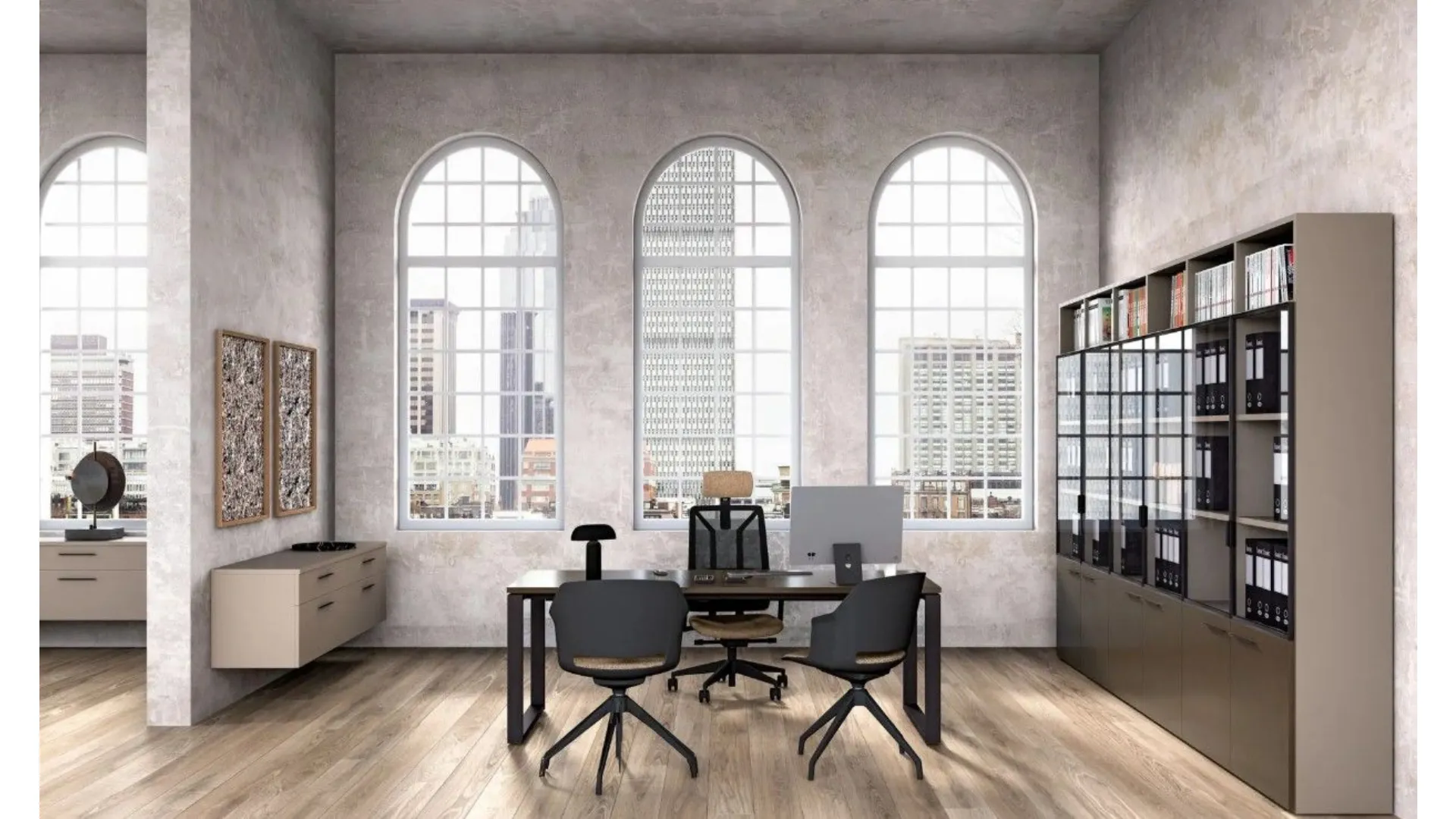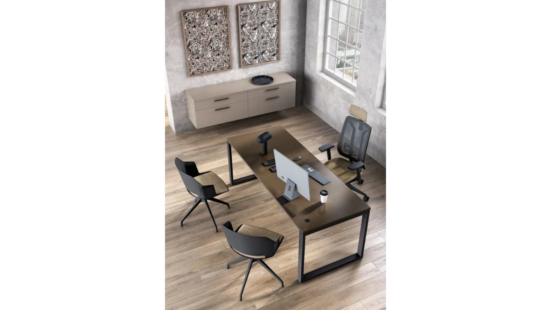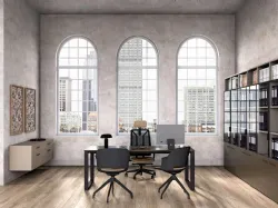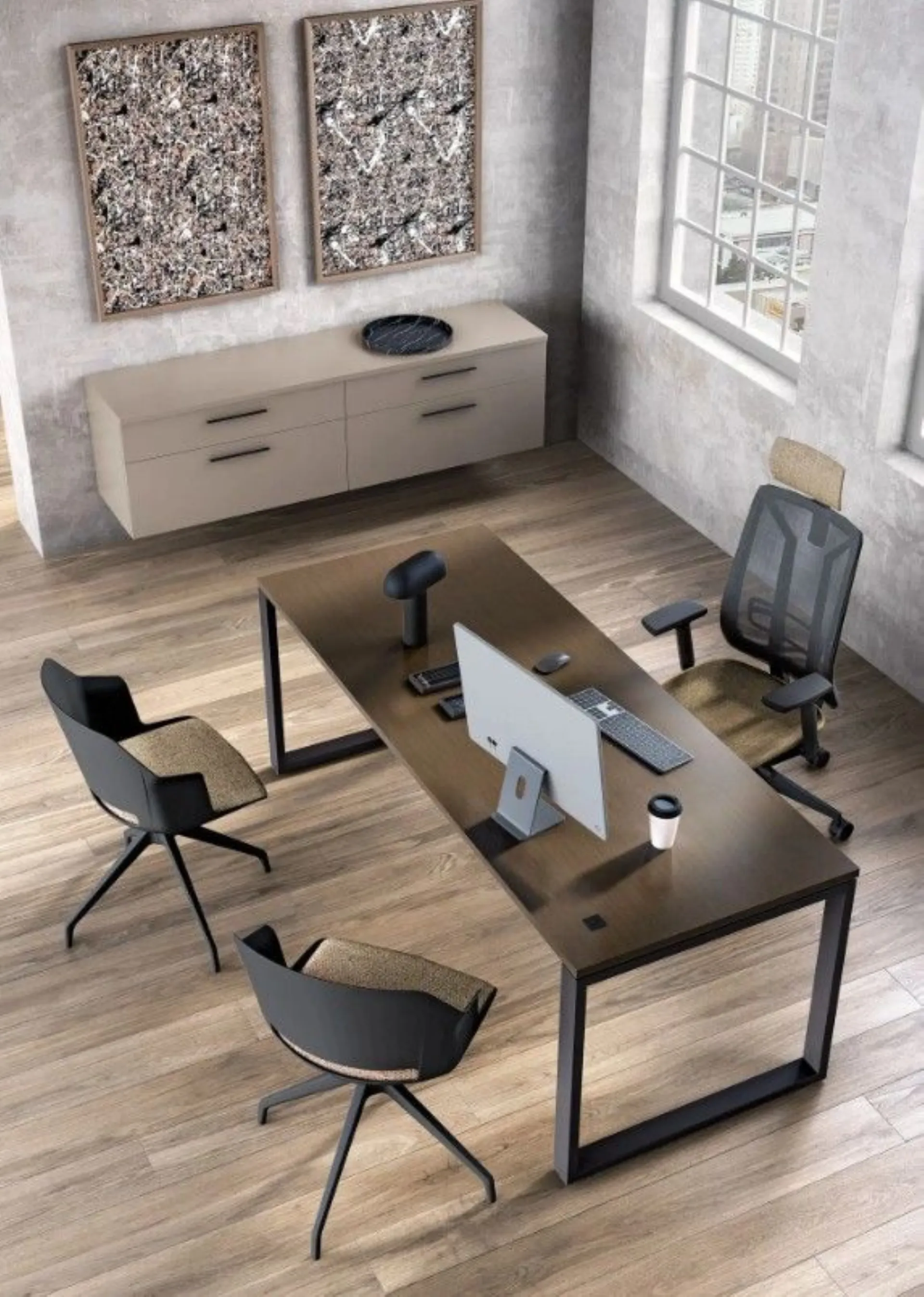 Our executive office furniture enhances every decision with Petra desks with Metal Bronze tops, coordinating doors, and ergonomic Direct armchairs, creating authoritative and welcoming spaces for clients and collaborators. Desks with integrated USB ports, Direct armchairs upholstered in fabric, and bookcases with Clay finish and Titanium showcases with grey smoked glass provide a balance of comfort, technology, and contemporary style, perfect for modern executive offices. Modular meeting tables with suspended elements in Clay and Comfy chairs with coordinated cushions complete the range of office furniture, ensuring functionality, visual lightness, and a professional welcome for teams and clients. Customizable according to design and available in various finishes. Request a quote via email or at 0424-383612.