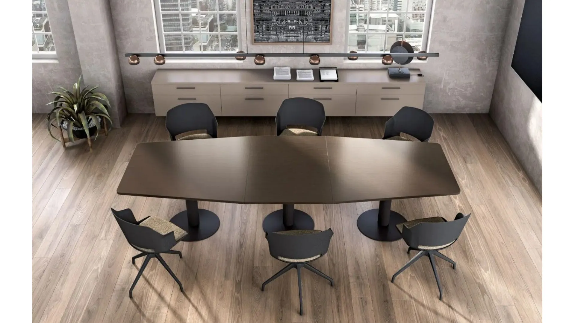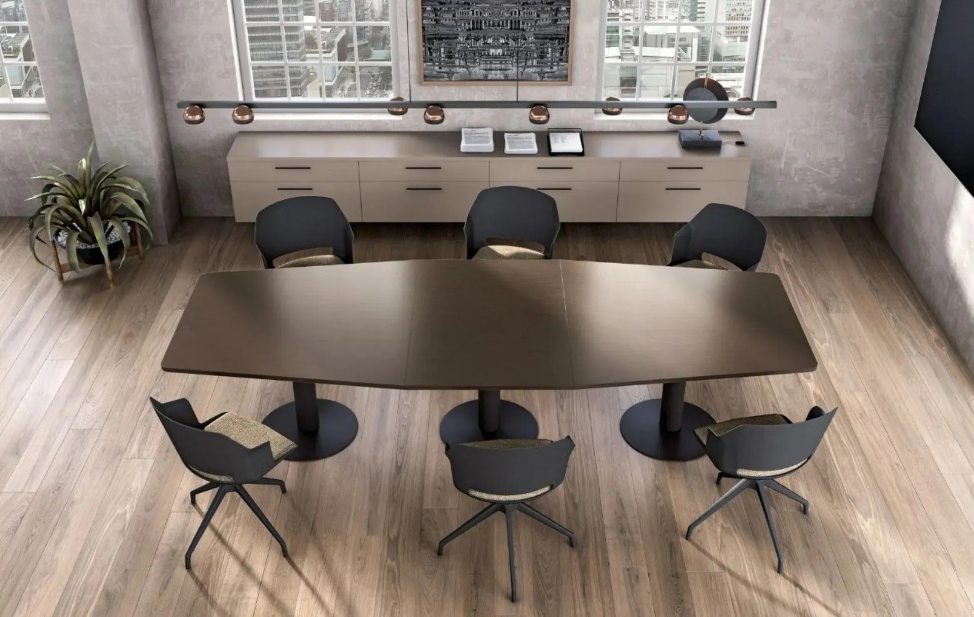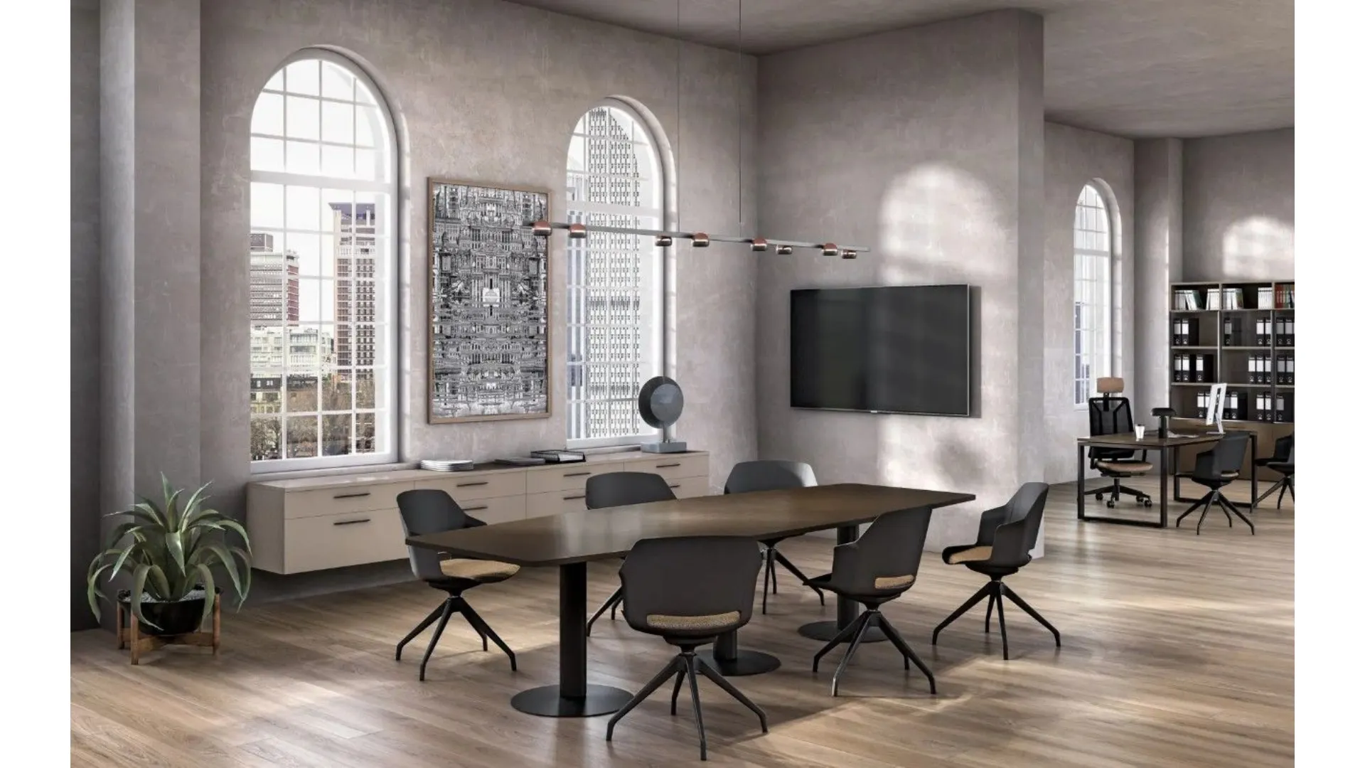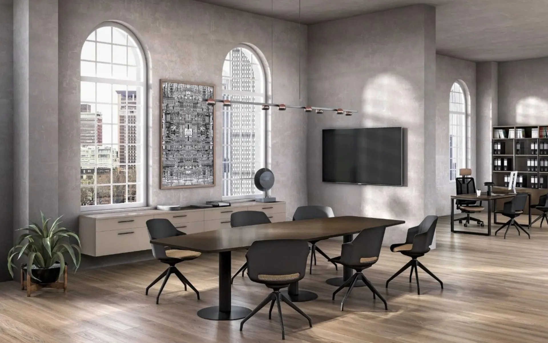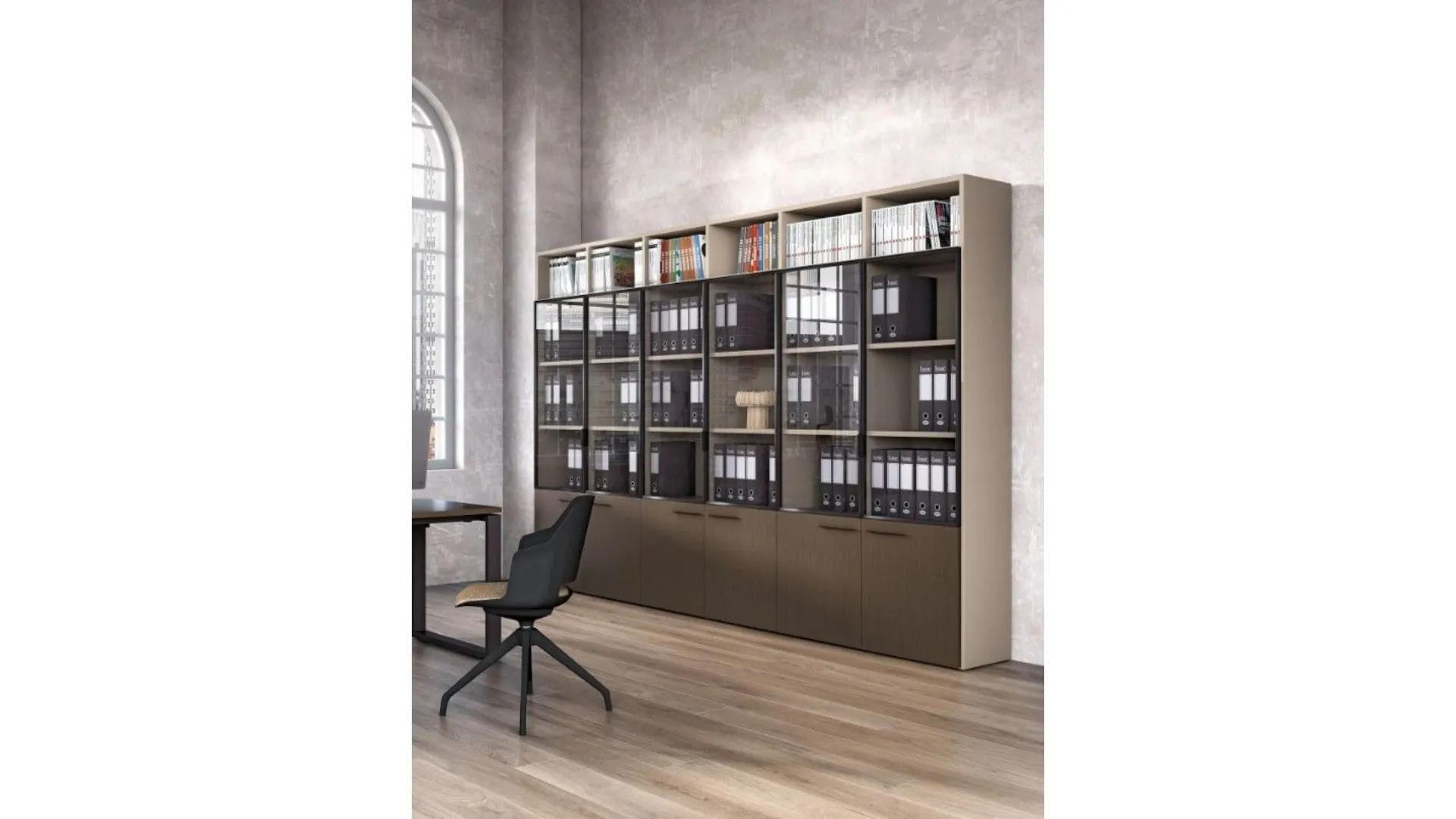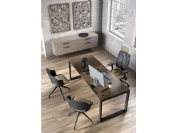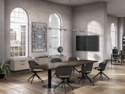Our executive office furniture enhances every decision with Petra desks with Metal Bronze tops, coordinating doors, and ergonomic Direct armchairs, creating authoritative and welcoming spaces for clients and collaborators. Desks with integrated USB ports, Direct armchairs upholstered in fabric, and bookcases with Clay finish and Titanium showcases with grey smoked glass provide a balance of comfort, technology, and contemporary style, perfect for modern executive offices. Modular meeting tables with suspended elements in Clay and Comfy chairs with coordinated cushions complete the range of office furniture, ensuring functionality, visual lightness, and a professional welcome for teams and clients. Customizable according to design and available in various finishes. Request a quote via email or at 0424-383612.