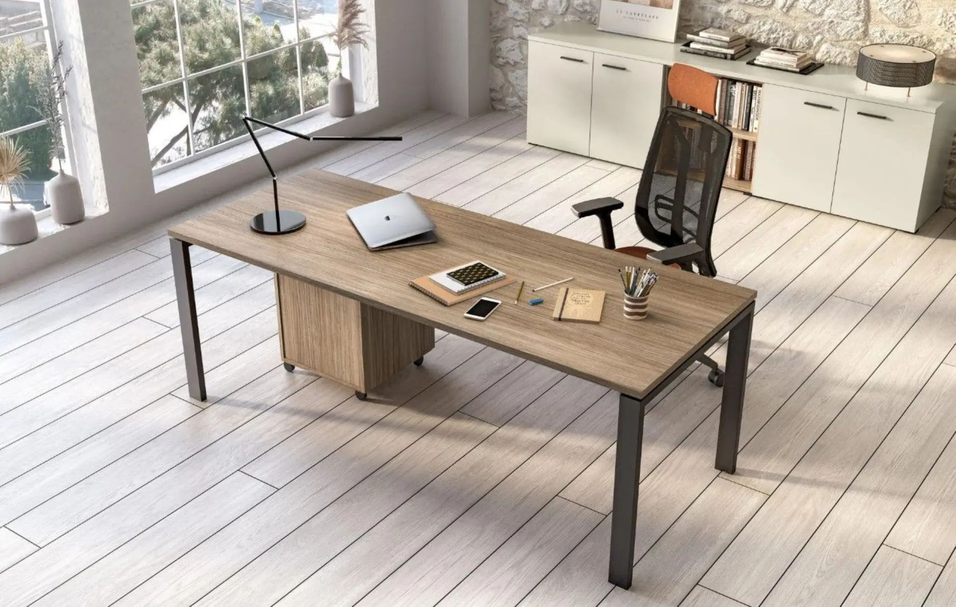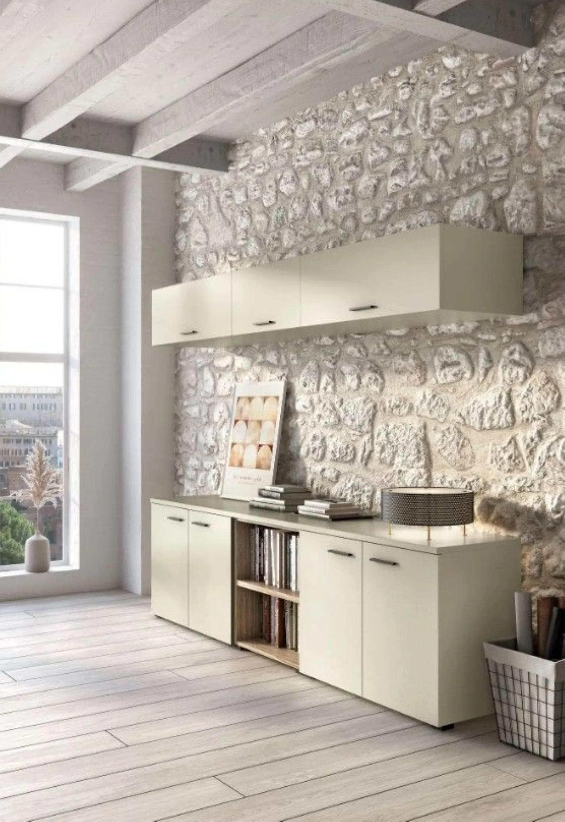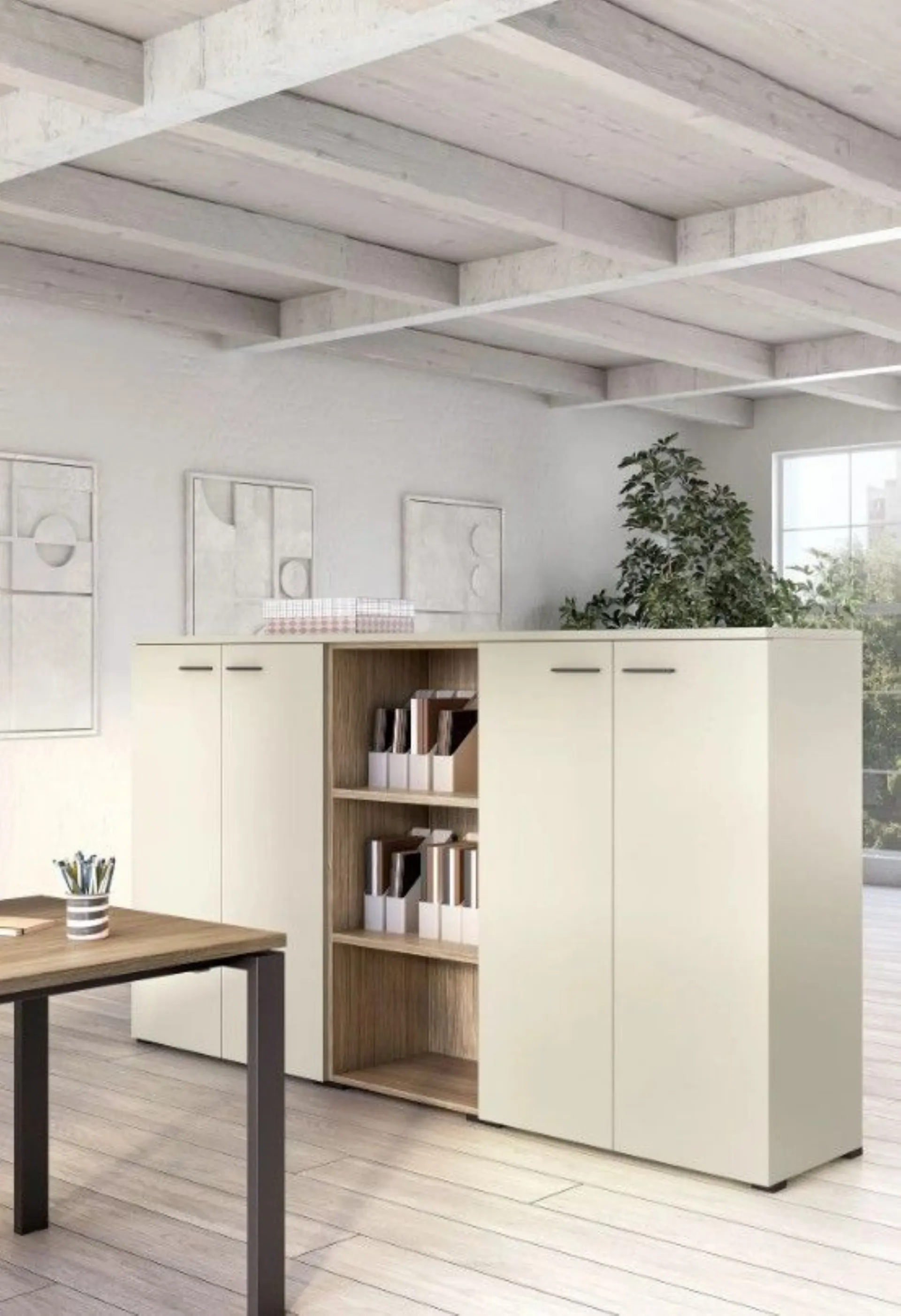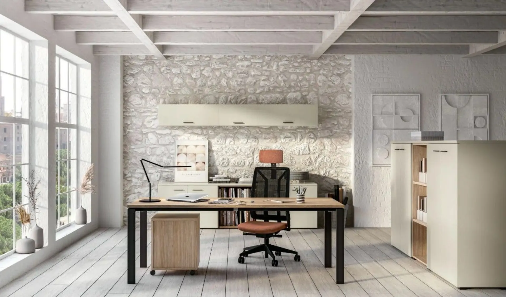 A welcoming work environment that promotes concentration and well-being: office furniture ensures comfort and order thanks to modular elements with doors and shelves. The Direct armchair supports during long hours of work, while the office desk organizes the space practically. Furniture solution designed for a contemporary design: the Vasistas wall units and the desk with a suspended top create a refined and light effect. A coherent office furniture integrates closed and open spaces for an organized management of materials and documents. Customizable according to the project and various finishes. Request a quote via email or at 0424-383612.