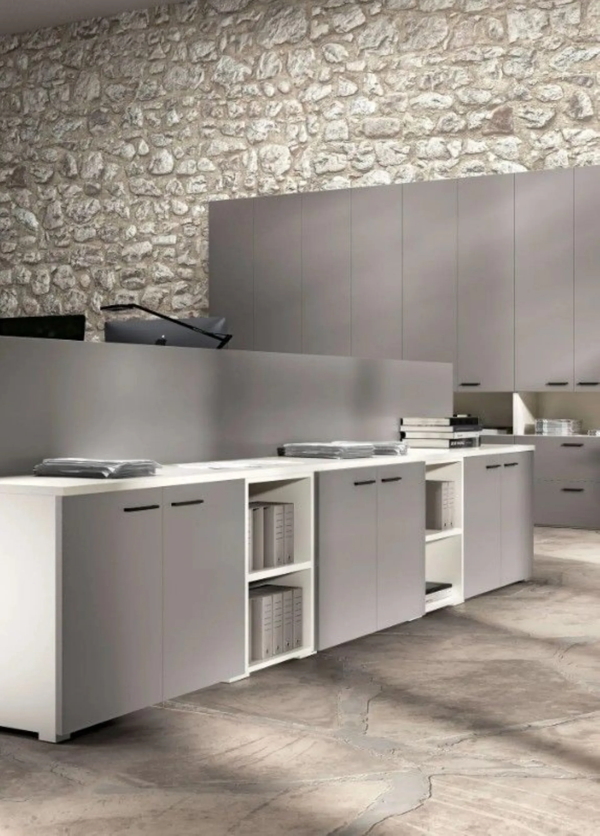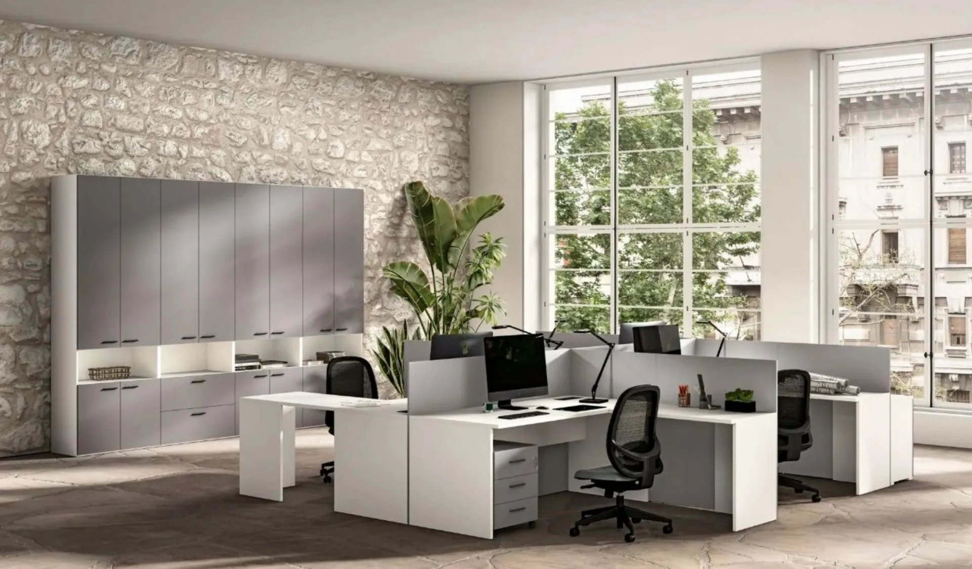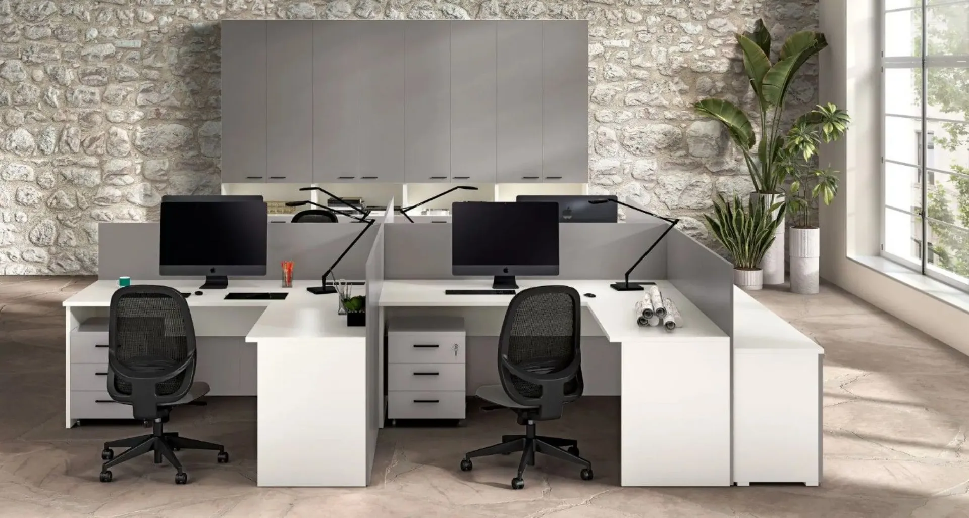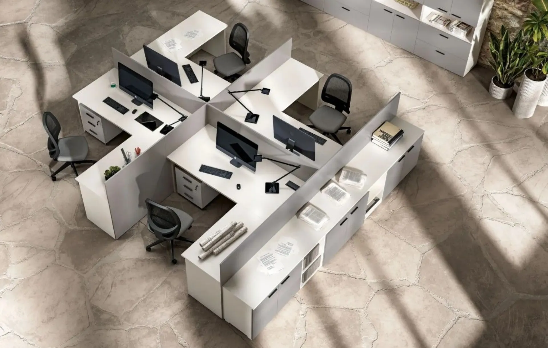 An environment designed to maximize functionality and comfort: these office furniture pieces integrate desks with peninsulas and dividing panels, ensuring privacy without sacrificing collaboration. The Total cabinets and modular elements offer ample space to organize materials and documents neatly. The aerial view highlights an intelligent layout: the Planet desks with peninsulas and dividing panels optimize workstations. A coherent and modern office furniture, completed by the Hoppy chair, creates a functional and welcoming environment, ideal for working simply and precisely. Customizable according to design and customizable with various finishes. Request a quote via email or at 0424-383612.