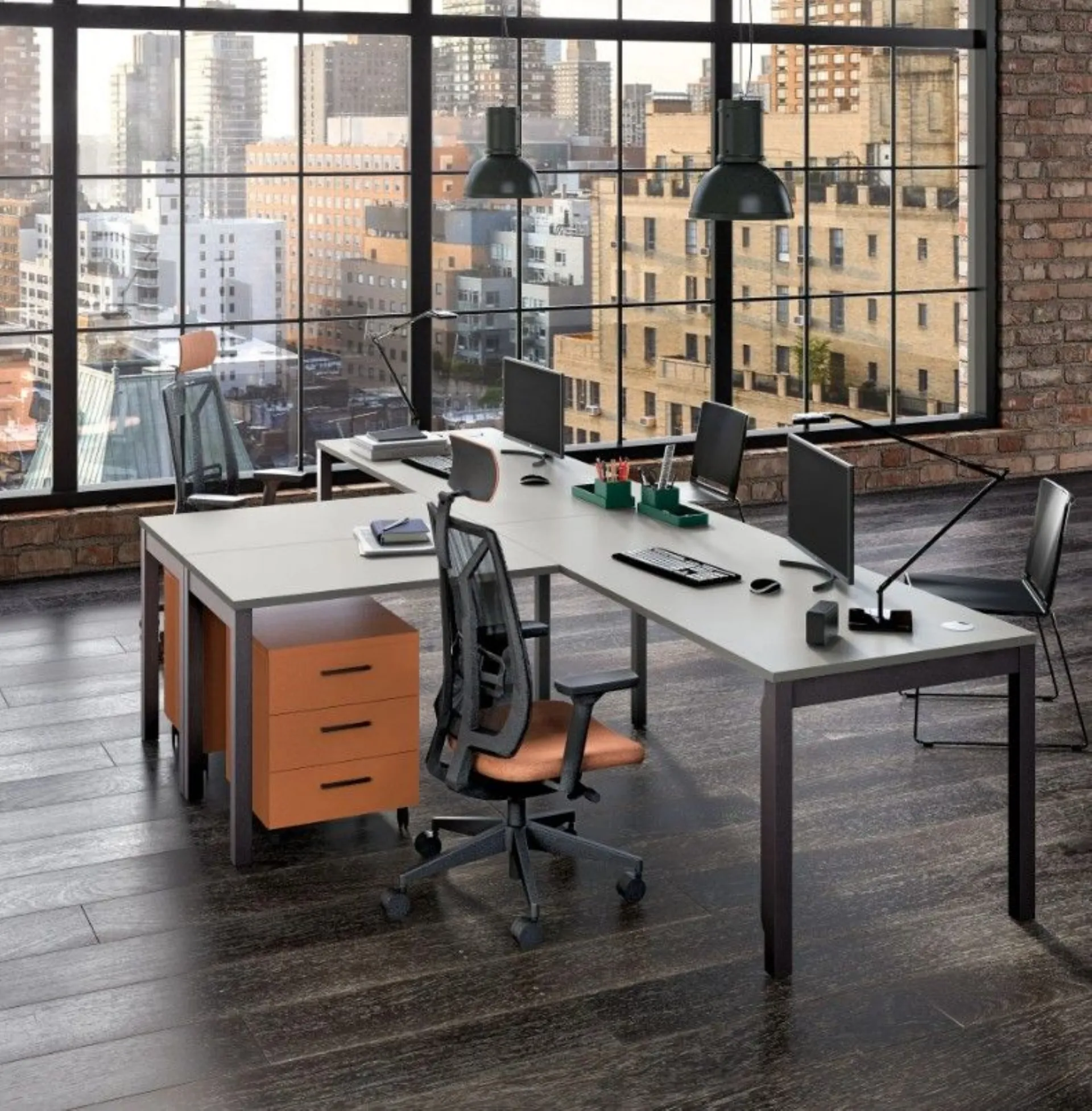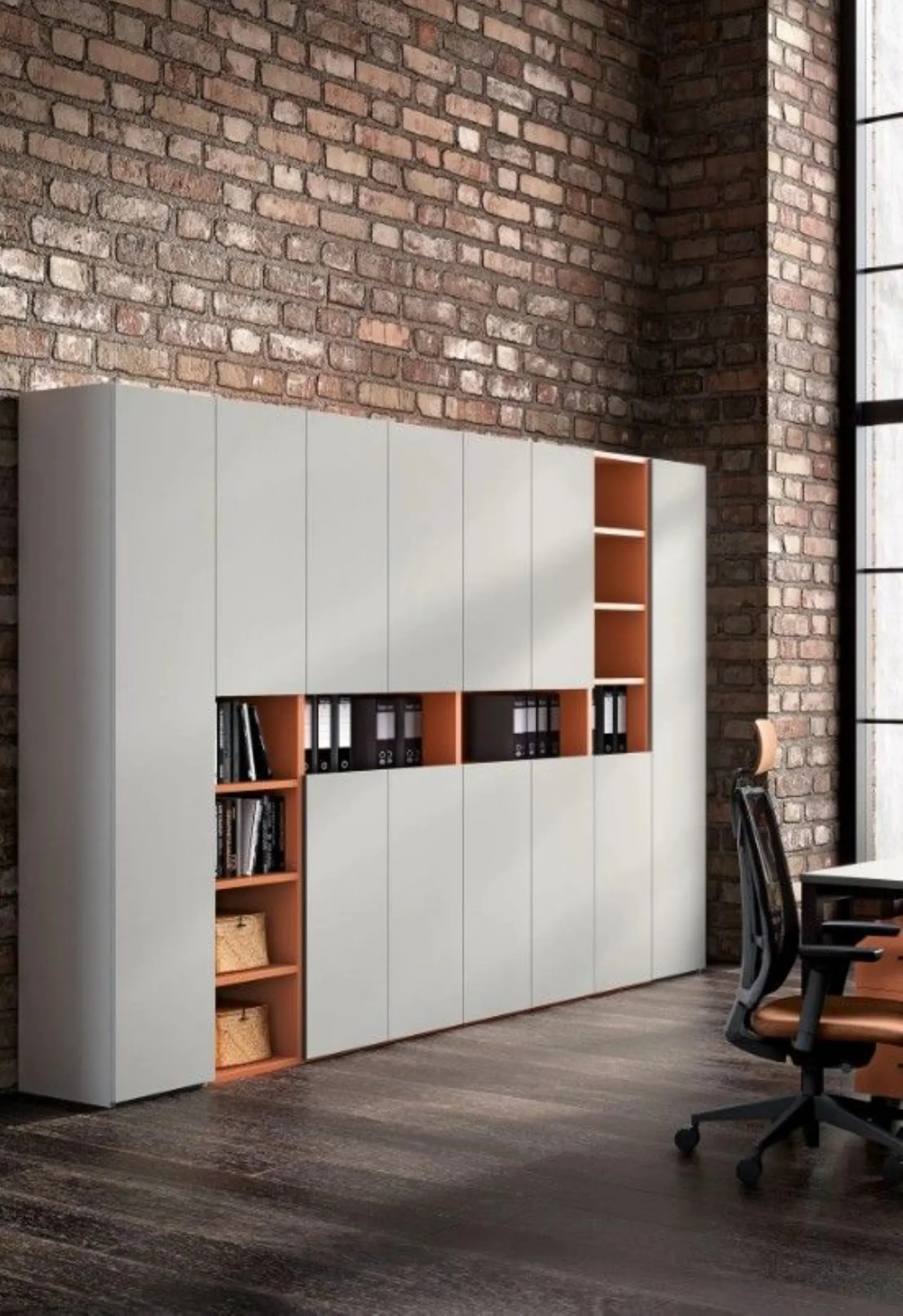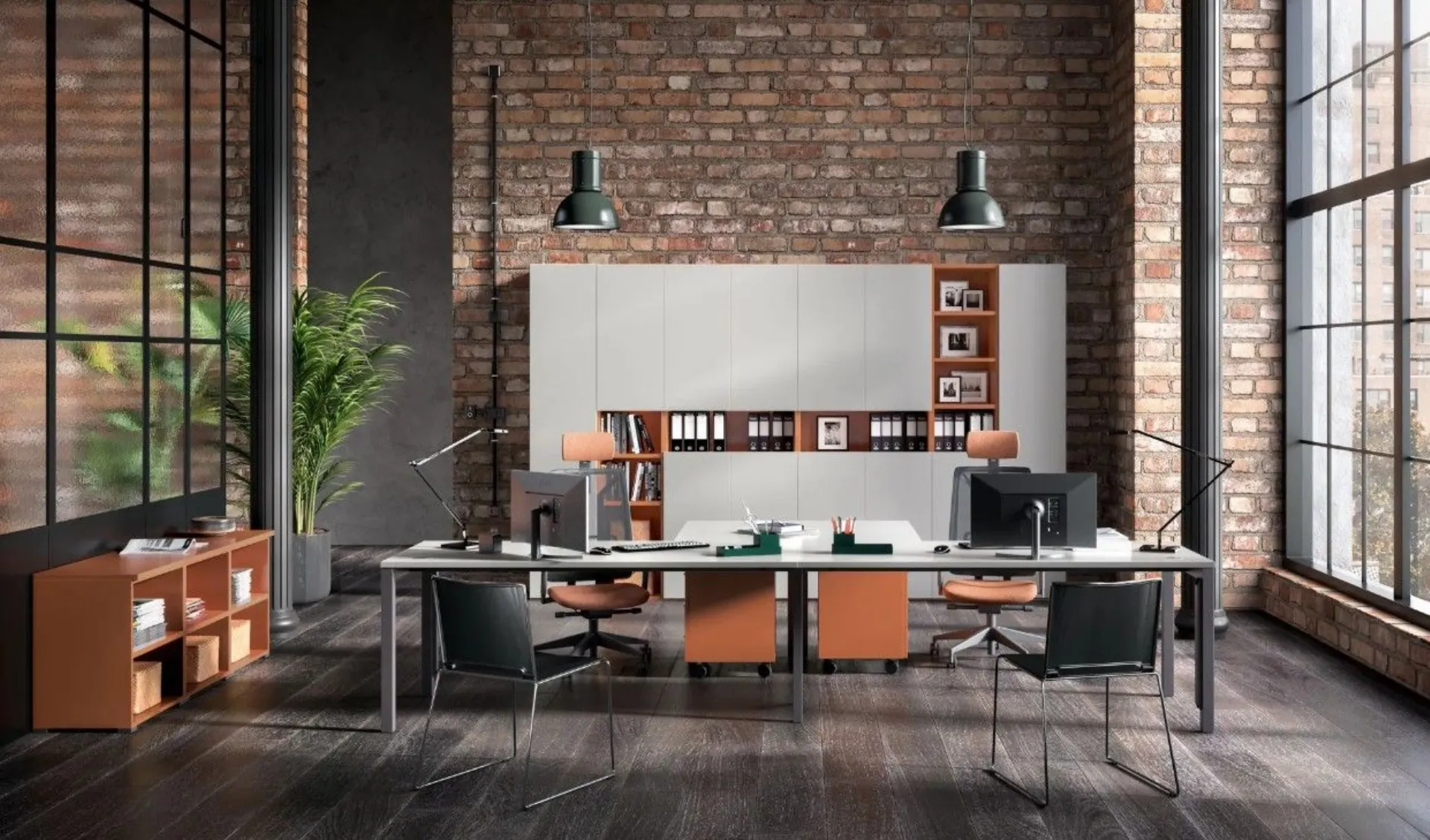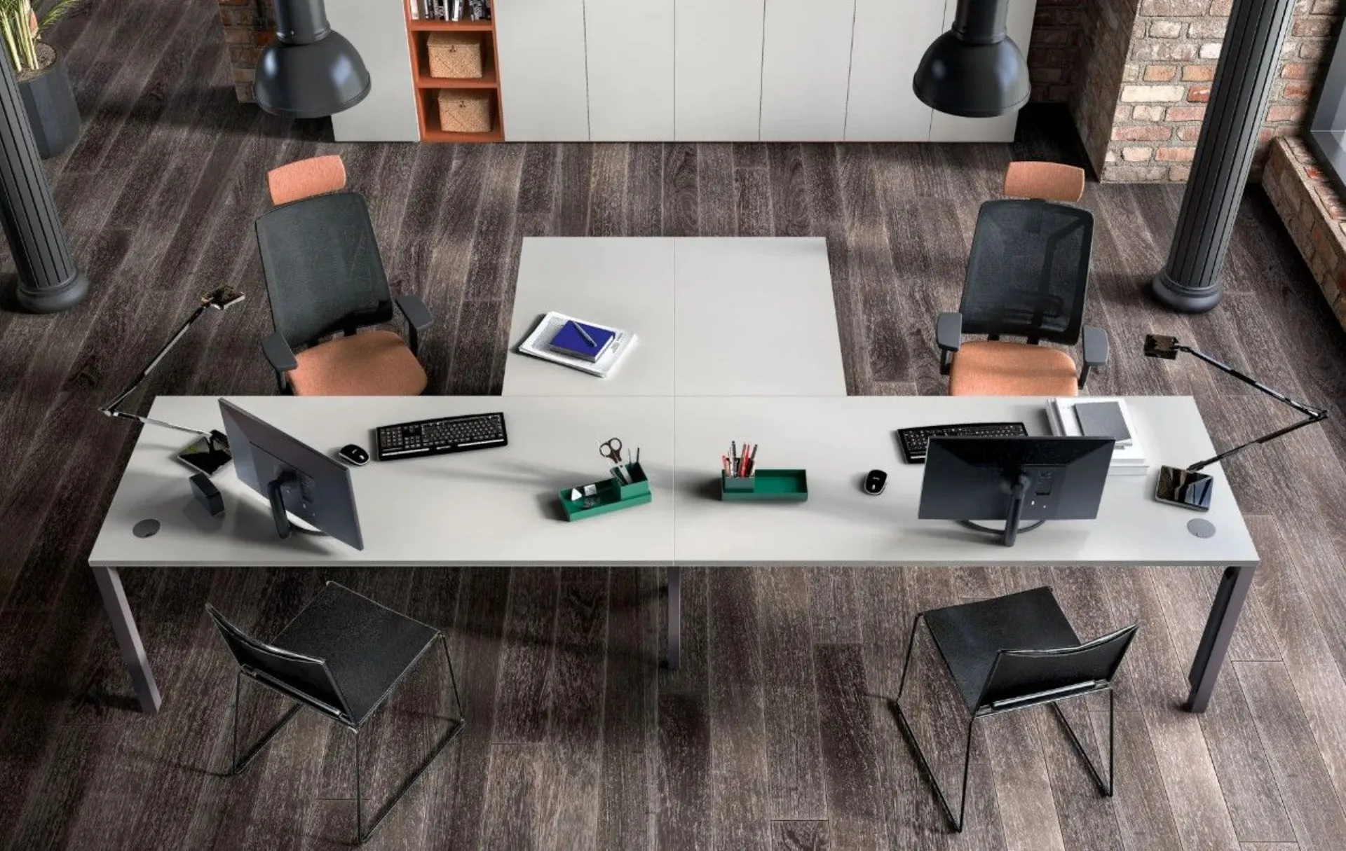 A young and creative environment, designed to work with comfort and functionality: these office furniture organize two workstations with Vega desks, while the Direct armchair and Dot chairs ensure support and comfort throughout the day, maintaining a modern and professional style. This furnishing solution includes the freely configurable Total wardrobe with open compartments, handle-less fronts, and tidy cable management thanks to the magnetic cable channel. A consistent and modern office furniture, with desks and counters that promote organization and collaboration. Customizable according to project and available in various finishes. Request a quote via email or at 0424-383612.