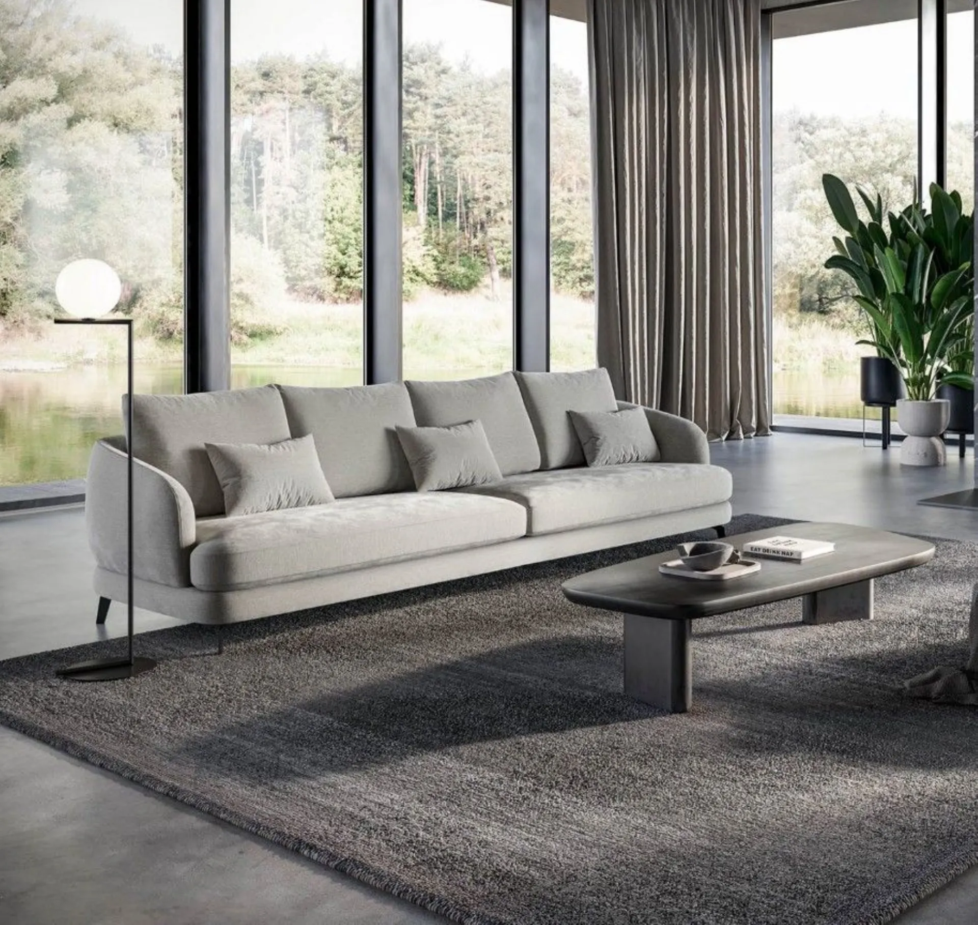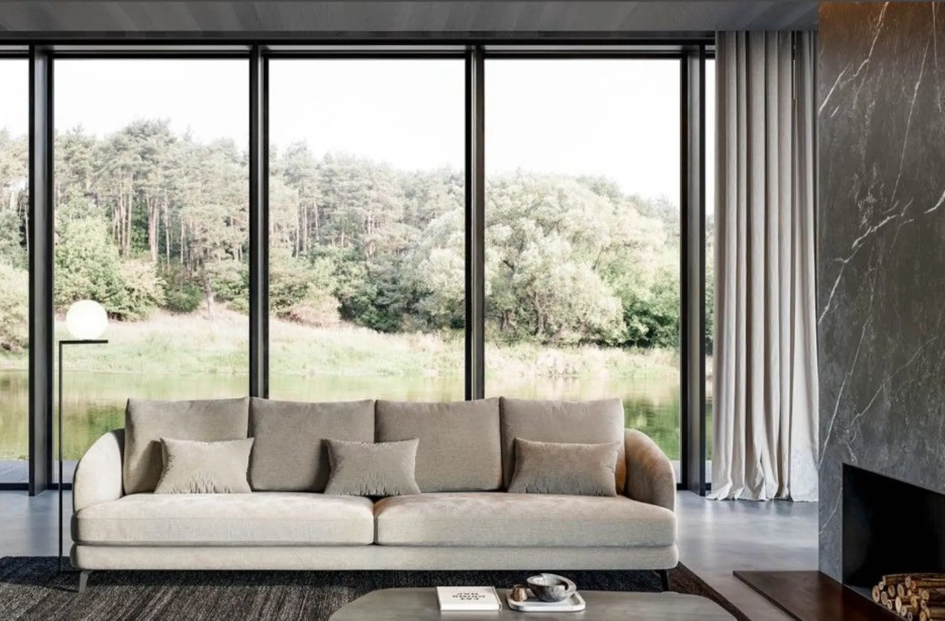 The soft lines of the structure create balanced and contemporary volumes, while the slender profile given by the design of the high metal feet lightens the space, transforming the sofa into an elegant architectural element suitable for both modern and more classic living rooms.
