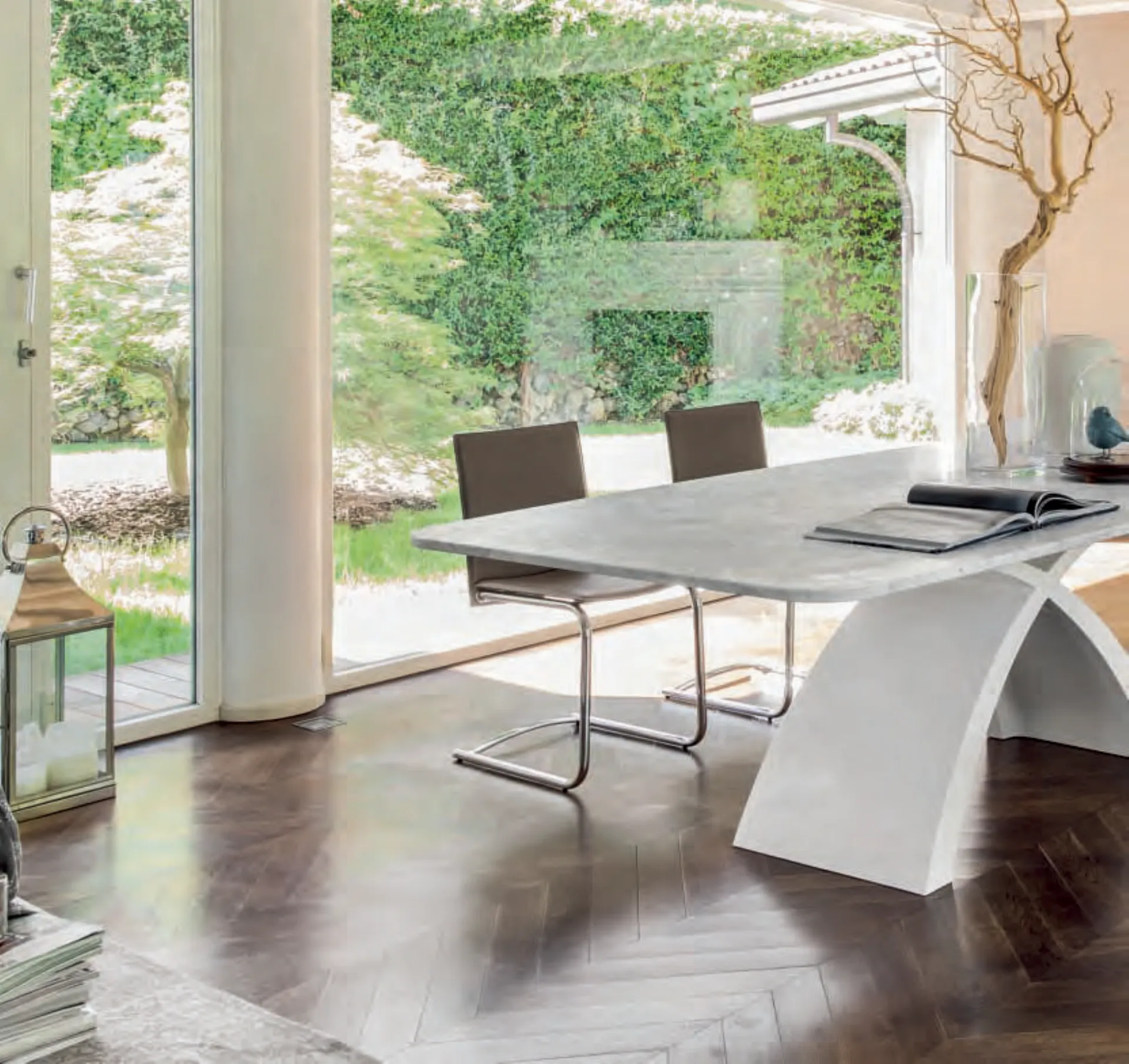 Tokyo  Fixed or extensible with aluminum rails and tempered glass top, wood or marble. Base in marble agglomeration, endless combinations make this table unique and inimitable, a timelessly timeless, branded Tonin Casa. Varietyà Of shapes, sizes and colors, hot and precious materials such as marble, glass and stones, with small sculptures.
