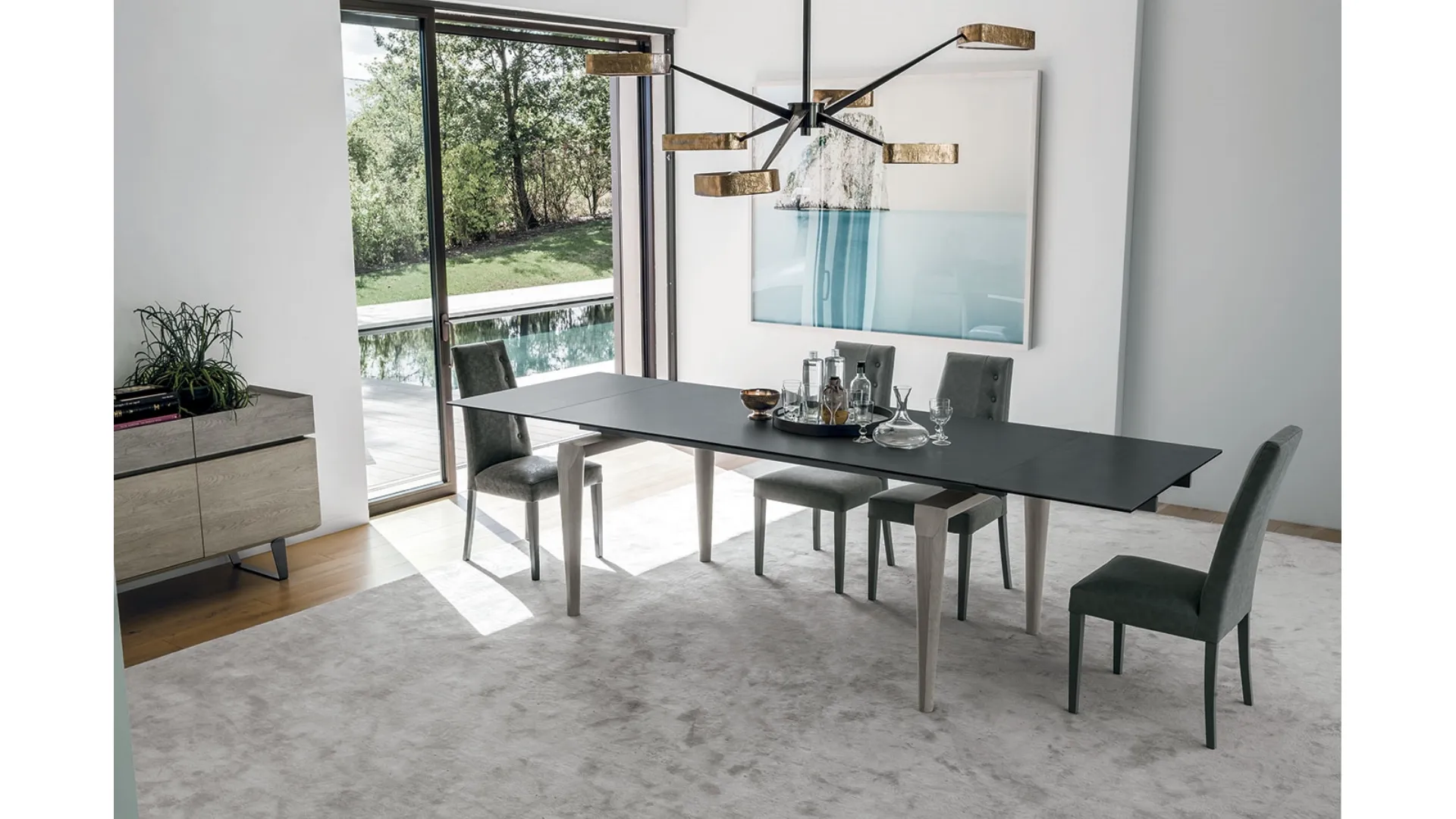 Table  in aluminum with solid wood leg, top and extensions in tempered glass or porcelain stoneware. This model of tables from the Mottes Mobili brand warms the atmosphere of the dining room with its design style. In the living room or in the kitchen environment Tables are important elements that distinguish the style and perform an indispensable function. The table, combined with the seats, traces the style of the living room. The glass proposal proposed here is part of the rich offer of Mottes Mobili tables. Visit us in our store to buy the proposal of Mottes Mobili tables that is right for you. Mobile ready for delivery with customizable material finishes, proposed at € 2,310.00. Height 75cm, Length from 200cm to 300cm, Depthà 100cm.