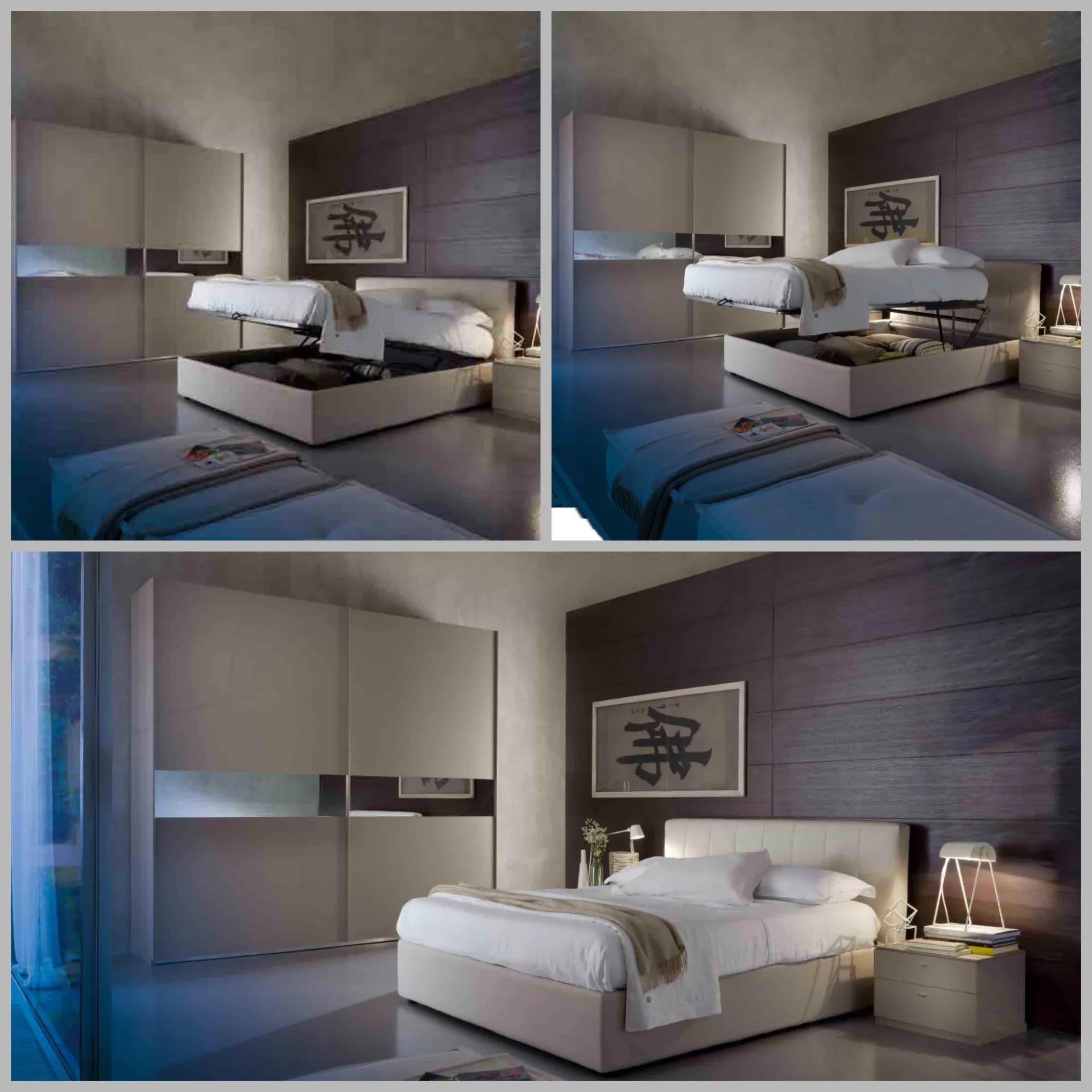 Double bedroom with wardrobe with 2 sliding doors Maxi Atlante with central inserts in neutral mirror, length 272cm, height 256cm and depth 26-agrave; 65cm. All& # 39; inside wooden shelves, chest of drawers with 3 drawers and metal clothes rail. York Box upholstered bed in ice-colored eco-leather, 180x210cm in size, with two-way base. the è mattress; excluded from the offer. Bed group Box Basic series, length 50cm, height 47cm and depth 26-agrave; 38cm. Drawers with slow closing. Sliding door wardrobe with slow closing, panels th. mm. 18/14 ennobled. Vertical aluminum profiles. Aluminum sliding rails. Lacquered, satin, mirror, smooth or silk-screened glasses for applications, beveled th. cm. 0.4. Melamine panels sp. cm. 2.2, for sides, bases, lids, plinths and internal shelves. Structural shelves sp. cm4, ABS edge on visible sides. Vertical profiles for side panels in MDF or melamine wood. All panels “ ennobled” of the program, made of wood particles or fiber and coated with melamine paper with wood effect and solid color, are classified in class E1 (with 0 formaldehyde emission), in compliance withà with current regulations.