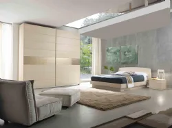 Double Room with wardrobe with 2 sliding doors Maxi slats Atlante 1 with central inserts in Dream screen-printed mirror, 272cm long, 256cm high and 26-deep; 65cm. Inside there are wooden shelves, a chest of drawers with 3 drawers and a metal clothes rail. Oasi bed with basic box bed frame measuring 180x210cm, slatted base 160x195cm included. The è mattress; excluded from the offer. Box basic series bedside tables, length 50cm, height 47cm and depthà 38cm. Drawers with slow closing. Wardrobe with sliding doors with slow closing, panels th. mm. 18/14 ennobled. Vertical aluminum profiles. Aluminum sliding rails. Lacquered, satin, mirror, smooth or silk-screened glasses for applications, beveled th. cm. 0.4. Melamine panels sp. cm. 2.2, for sides, bases, lids, plinths and internal shelves. Structural shelves sp. cm4, ABS edge on visible sides. Vertical profiles for side panels in MDF or melamine wood. All panels “ ennobled” of the program, made of wood particles or fiber and coated with melamine paper with wood effect and solid color, are classified in class E1 (with 0 formaldehyde emission), in compliance withà with current regulations.