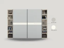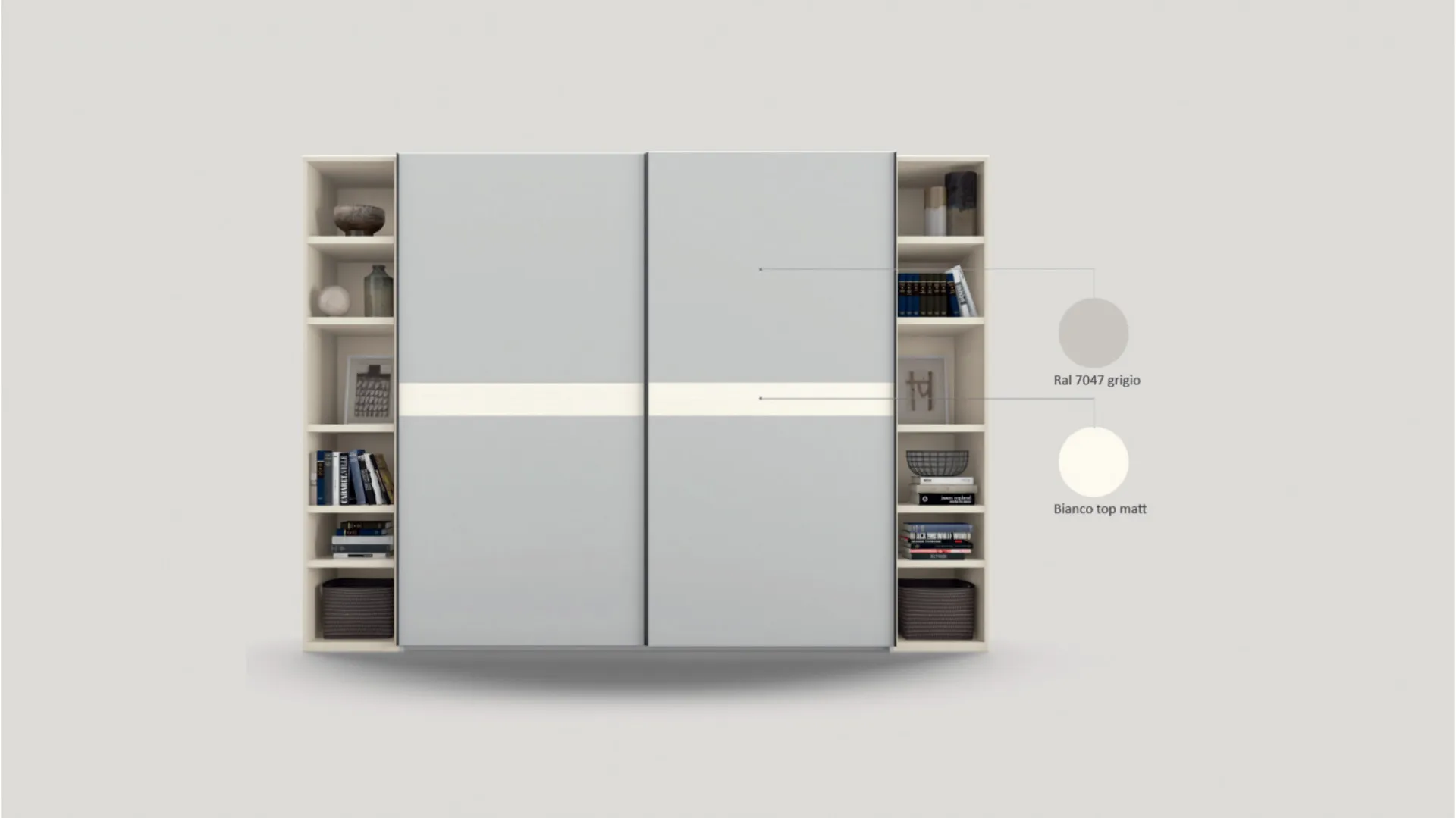 Modern wardrobe with two sliding doors, with opaque lacquered central panel, doors with a thickness of 25 cm. slow closing, vertical handles in anthracite lacquered matel. Two open end modules, rope-finish bookcases. The dimensions of this proposal has a length of 336 cm. Height 258 cm. Depthà 64 cm. E& # 39; one item made to order.