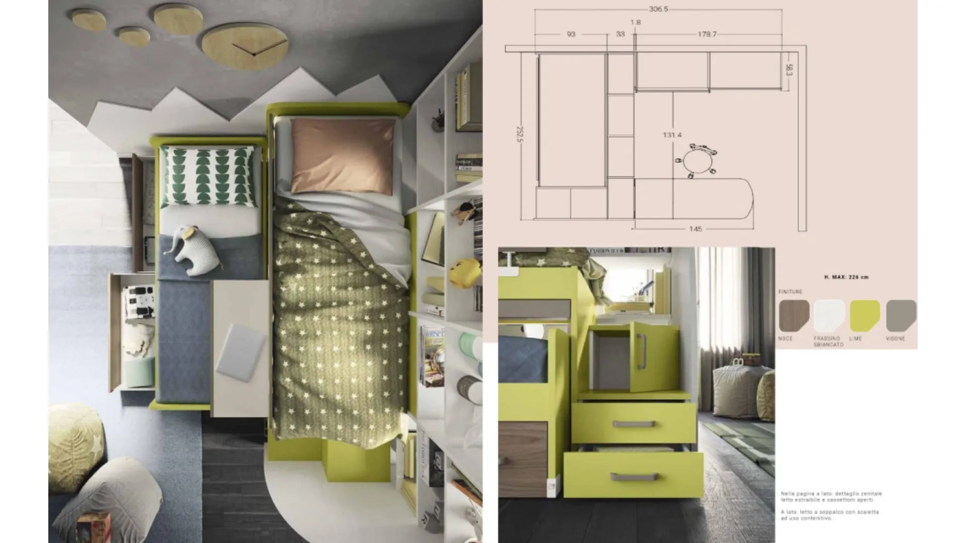Bedroom a beautiful solution marked San Martino mobili, a well known brand in Veneto, true qualityà made in Italy. A proposal with a beautiful wardrobe with sliding doors, a bookcase module with colored shelves, a height of 26- 25 cm. solution with two beds and a mezzanine with two steps to get on the upper one, complete with slatted frames. The dimensions see attached the measures in the photo below. E& # 39; a custom article with the optionà to customize the color finishes, like all the attached photo samples, and change the sizes of the various modules, as best to decorate your room.