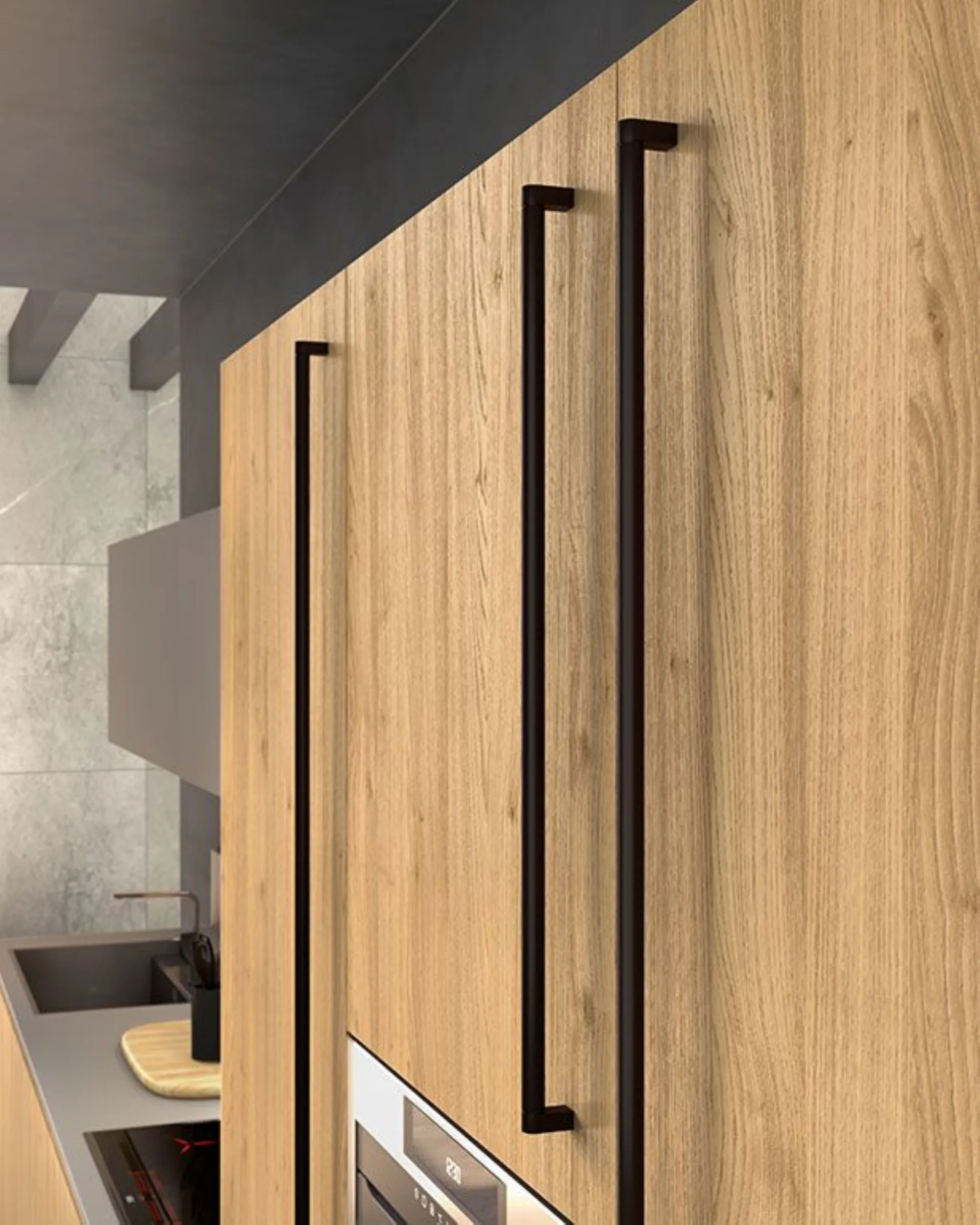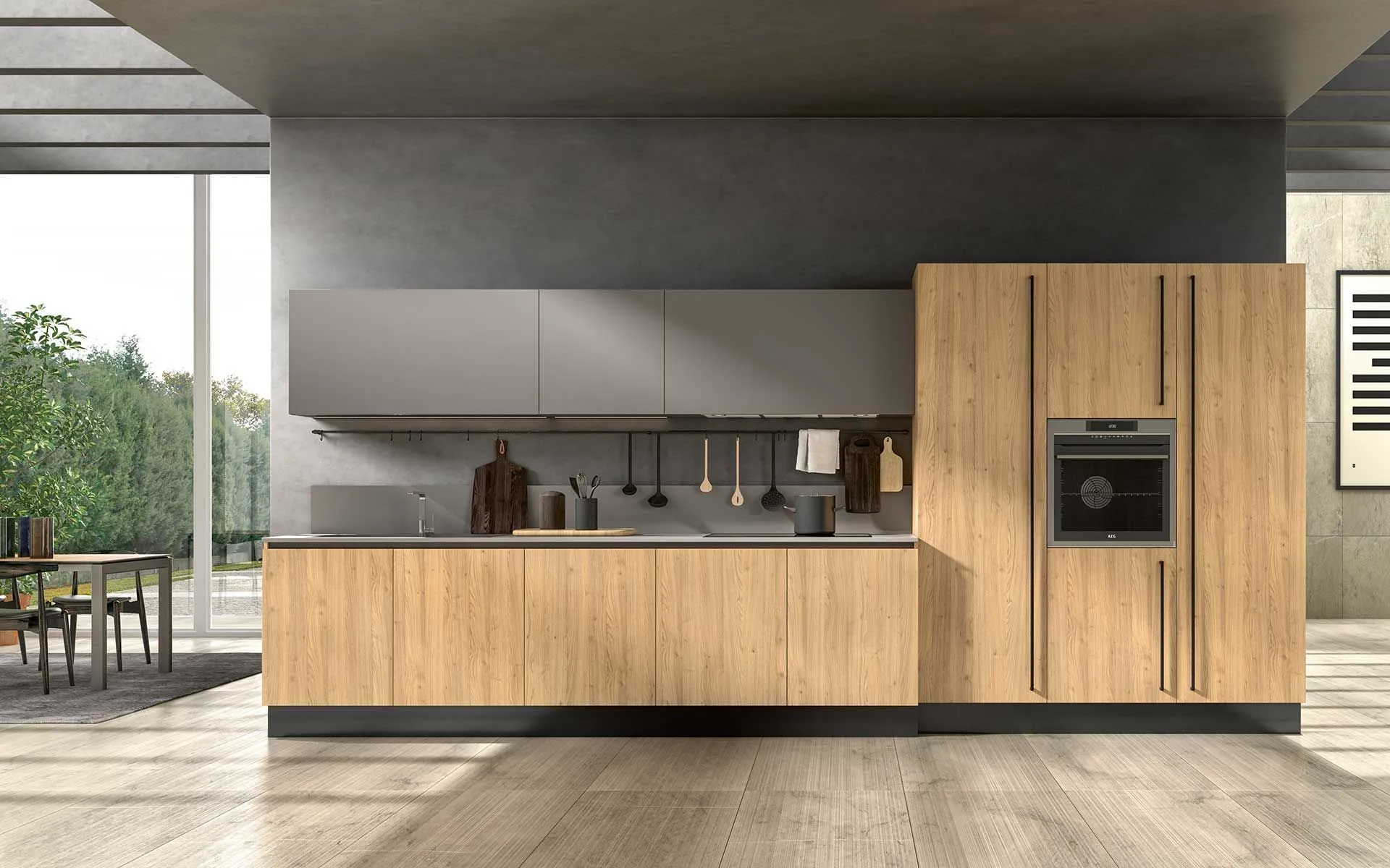 We present Class 06 kitchen. A kitchen where the smooth knotted Oak door, model 22, perfectly matches the wall cabinets, worktops, and backsplash in Fenix Gray London. The handle channel, plinth, and new vertical handles are finished in black. Clean lines enhanced by the essential vertical handle. Quartz worktop and backsplash. CLASS is a kitchen with a timeless design, to be lived and furnished with personality. It includes Electrolux A+ appliances; fridge, dishwasher, multifunction oven, sink, and induction hob. The kitchen has a length of 480cm, height 216cm, and depth 70cm. Delivery is included in the price throughout Italy, 40-50 working days. Our offer for the Class 06 kitchen is €6200.00, including choice of finishes. For more information, contact us via email or visit our showroom.
