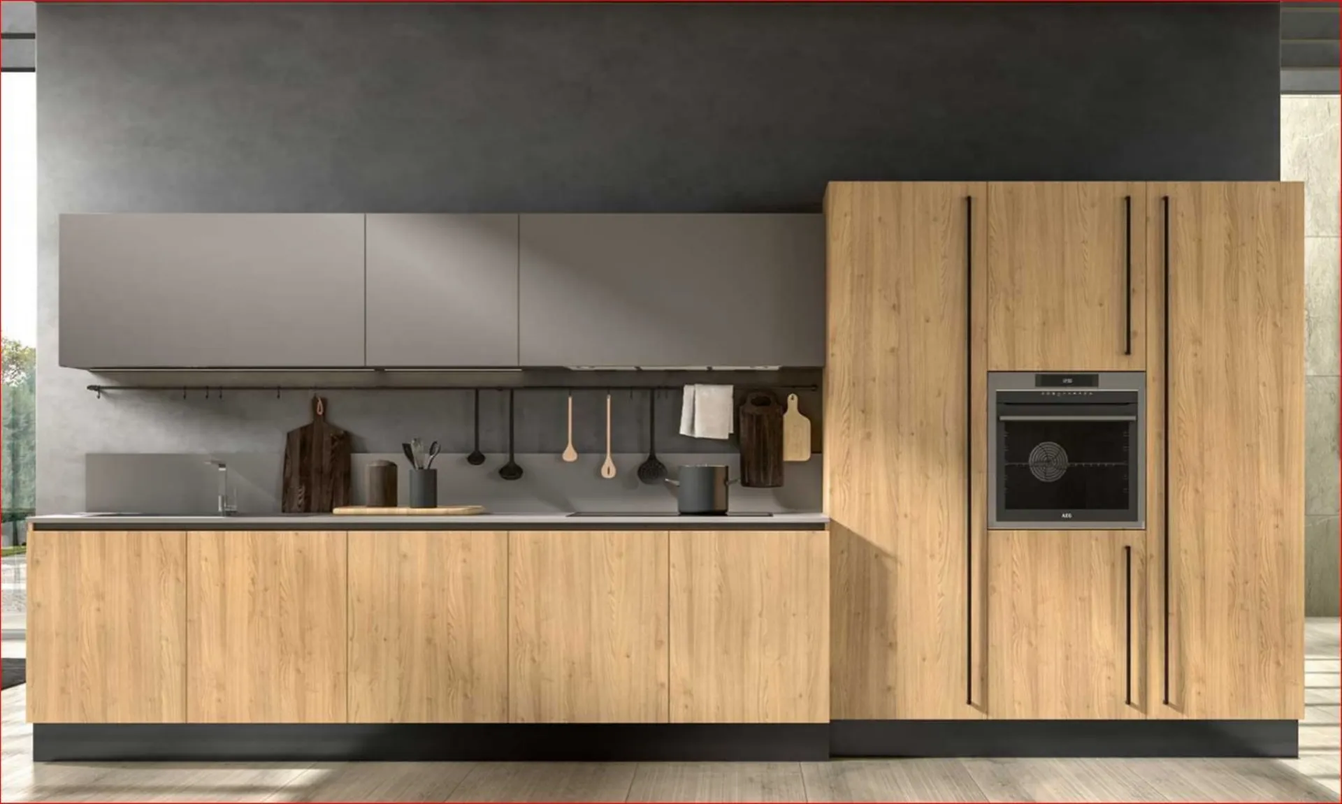 Introducing the ASIA 10 kitchen. A kitchen where the smooth knotted Oak wood door perfectly matches the laminated Fenix Gray London wall units. The plinth, toe kick, and new vertical handles are in a black finish. Clean lines enhanced by the essentiality of the vertical metal handle in various finishes. The worktop and backsplash are in laminated material with a thickness of 2 cm. Asia 10 is a kitchen with a timeless design, to be lived in and furnished with personality. It comes with BEKO A+ class appliances; refrigerator, dishwasher, multifunction oven, sink, and 75 cm gas hob. The kitchen has a length of 480 cm, height 216 cm, depth 60/70 cm. Delivery is included in the price throughout Italy, within 40-50 working days. Our offer for the ASIA 10 kitchen is €7,900.00 including VAT, finishing options available from the sample book. For more information, contact us via email or visit our showroom.