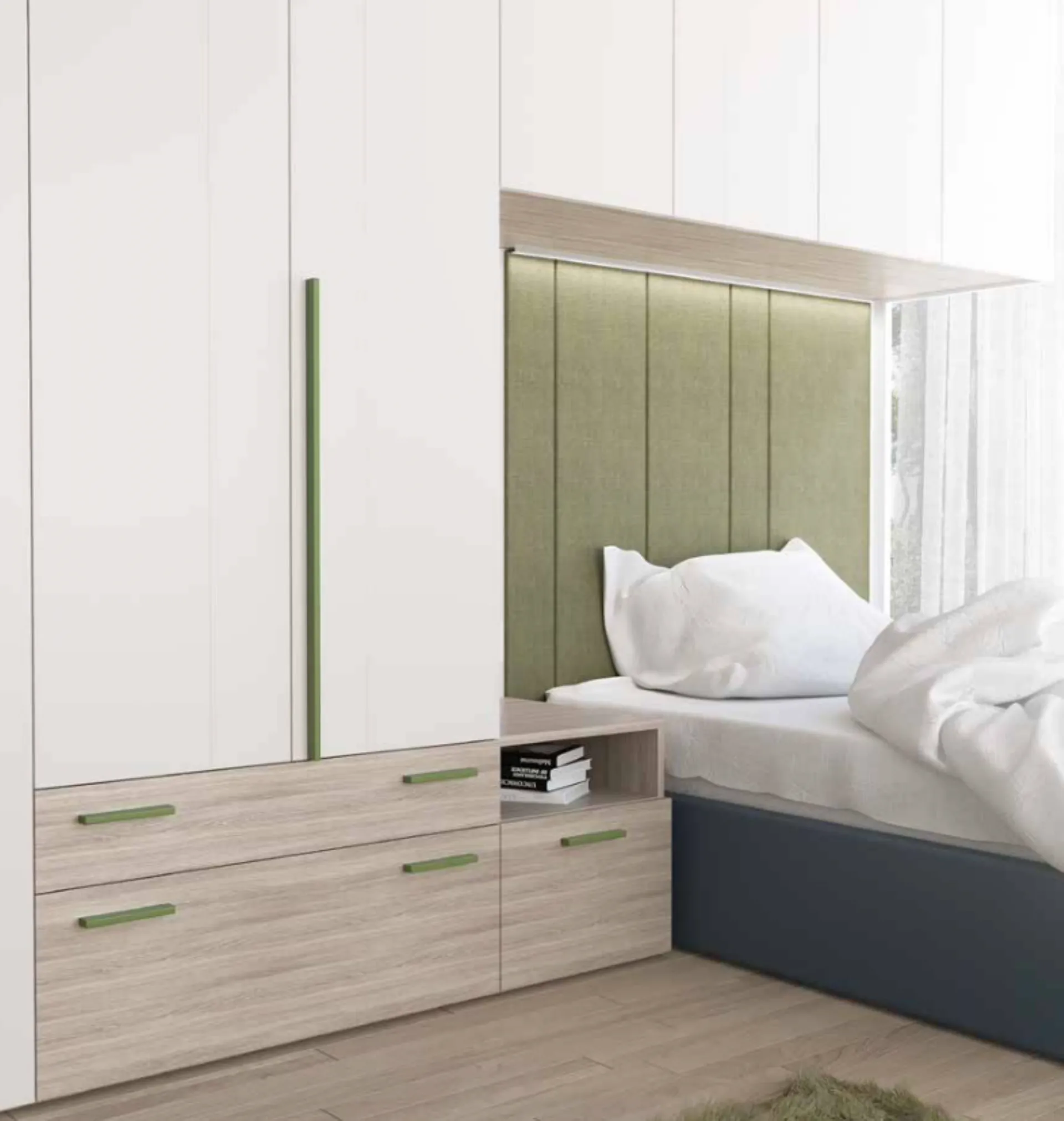 Complete children's and teenagers' bedroom in wood with upholstered SOFT storage bed, blue denim eco-leather, mattress not included. OPEN bedside table. CODE eight-door swing wardrobe with bridge (solid color), CODE padded forest green fabric wall panel, double lower drawer. MAX desk-table, SMOOTH pouf in forest green fabric and blue denim eco-leather, SHANGHAI clothes rack. The finishes are customizable, delivery time is 40/50 working days and the price of the entire composition is €3,600.00. Delivery included in the price, assembly excluded.